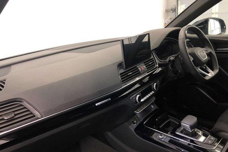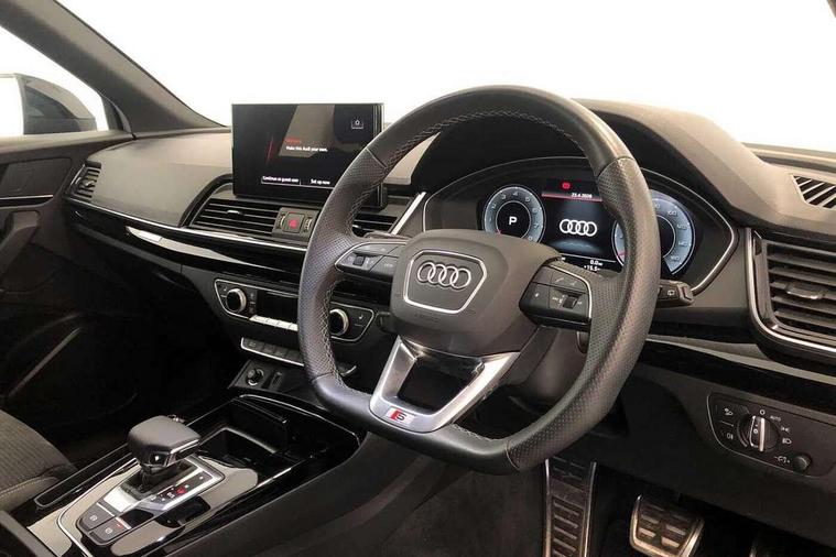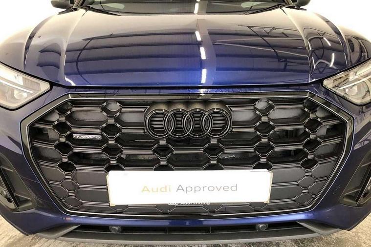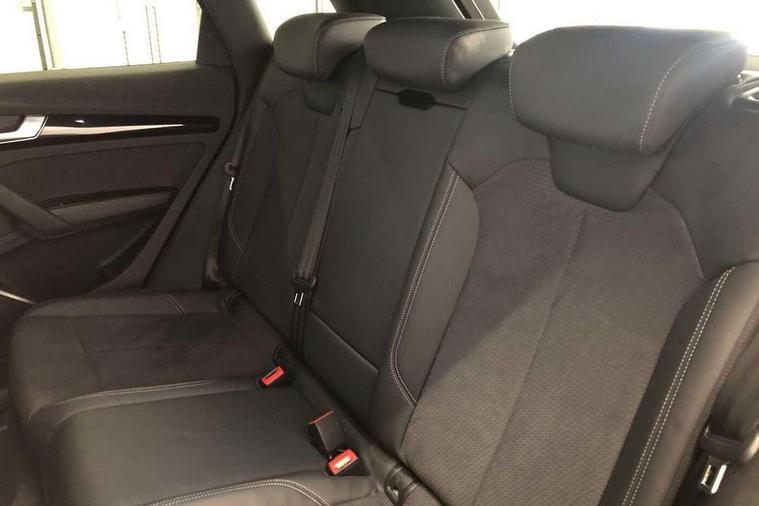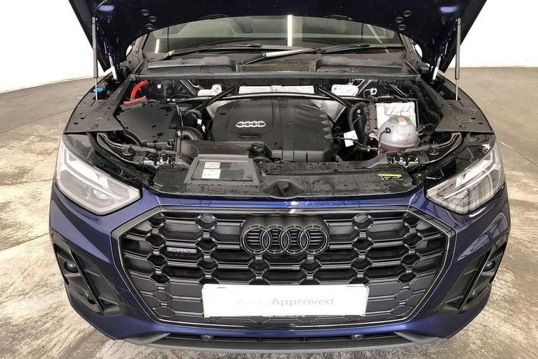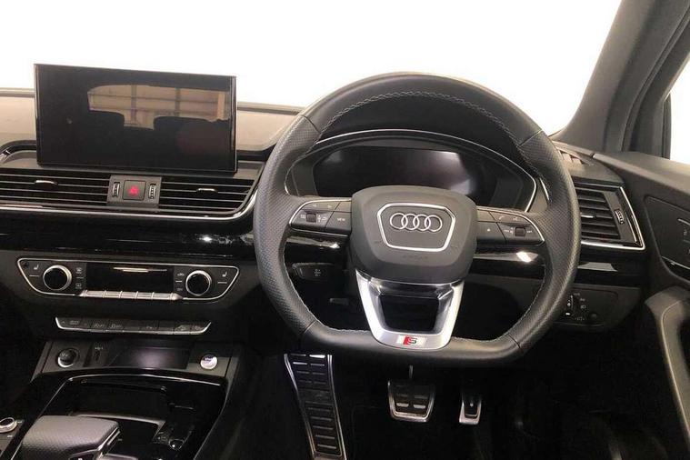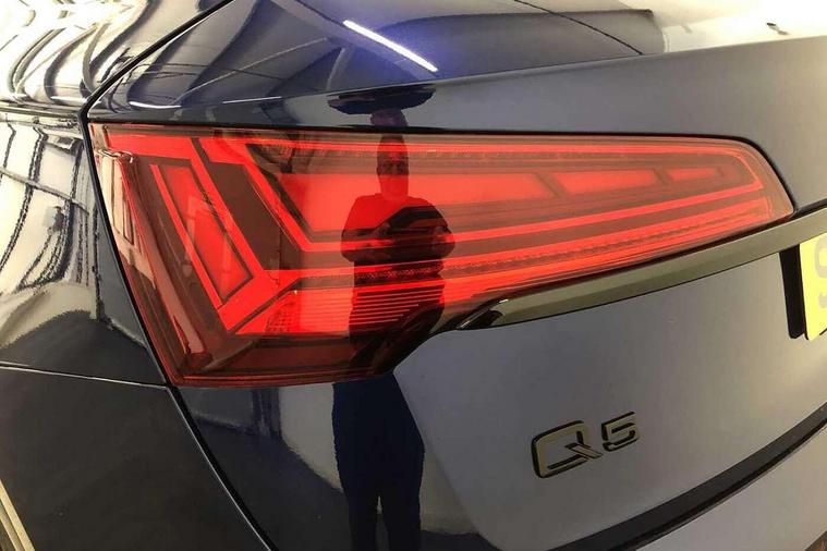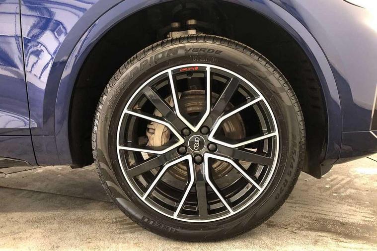 Acoustic front and rear parking sensor, Audi connect safety and service (e-call), Audi drive select, Audi virtual cockpit plus with 12.3" screen and three different layout designs, Audi wireless smartphone interface, Automatic start-stop system with coasting functionality and efficiency programme, Bluetooth interface, Camera based traffic sign recognition, Electro - mechanical power assisted steering, Lane departure warning, MMI navigation plus with 10.1" touch screen, Power tailgate, Reversing camera, Service interval indicator, Voice control system with Audi hotword activation "Hey Audi", Quattro on demand, S line sports suspension, 8 loudspeakers, DAB Digital radio, Acoustic windscreen, Auto dimming door mirrors, Auto dimming frameless rear view mirror, Automatic headlight adjustment, Automatic headlights and windscreen wipers, Black roof rails, Black styling with black rings, Body colour bumpers, Body colour rear diffuser with matt aluminium silver surrounds, Body colour underbody protection, Chrome plated exhaust trims, Daytime running lights, Door sills in Selenite silver, Electric adjustable/heated/folding door mirrors, Front air inlet surrounds in aluminium, Front and rear electric windows, Front radiator grille in honeycomb design, LED 3rd brake light, LED headlights and LED tail lights, Loading edge protection in stainless steel, Lower bumpers painted in contrast Manhattan grey, Rear chrome trim strip below lights, Rear privacy glass and rear side windows, Rear side wing doors, Rear wiper, Roof bars, S Line badges on the front wing panels, S Line front and rear bumpers, S Line rear spoiler, S Line side skirts, 2 x USB charging port with aux input socket, 3 rear headrests, Black cloth headlining, Comfort front centre armrest, Contrast stitching on seats, steering wheel and gear lever gaiter, Deluxe 3 zone electronic climate control, Front head restraints, Front sport seats with S embossed logo, Front/rear floor mats, Gear lever in black leather, Heated front seats, Height/reach adjustable steering column, Illuminated door sill trims with S logo, Luggage compartment cover, Manual seat adjustment with 4-way electric lumbar support, Single front passenger seat, Stainless steel pedals, Sunvisors with vanity mirrors, Tool kit, Top surface of the rear centre armrest in artificial leather, High gloss pack - Q5, LED interior light pack - Q5, 3 point seatbelts on all seats, 6 airbags - Driver, front passenger, curtain and side airbags, Attention and drowsiness assist, Electrically operated child locks on rear doors, Electromechanical parking brake, Electronic stabilisation control including ABS, ASR and EDL, First aid kit with warning triangle and vests, Front passenger airbag deactivation, Hill descent control, Hill hold assist, ISOFIX child seat mounting for front passenger seat and ISOFIX child seat mounting with Top Tether for outer rear seats, Multi collision brake assist, Pop-up bonnet for pedestrian protection, Pre sense city, Seatbelt monitoring, Tyre pressure warning, Anti theft alarm, Anti-theft wheel bolts, Remote central locking, Remote control key with SAFELOCK and keyless go, Air vents inserts and centre console in gloss black, Tyre repair kit,