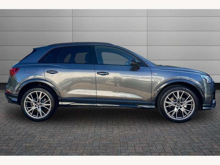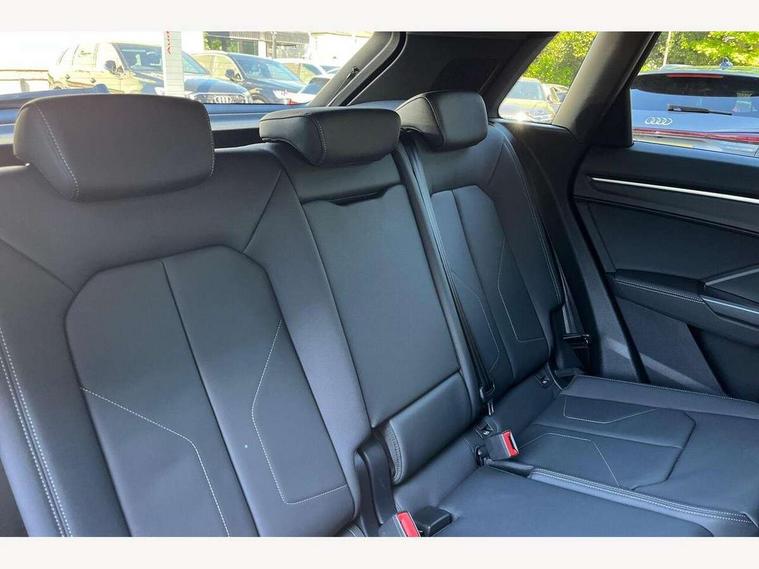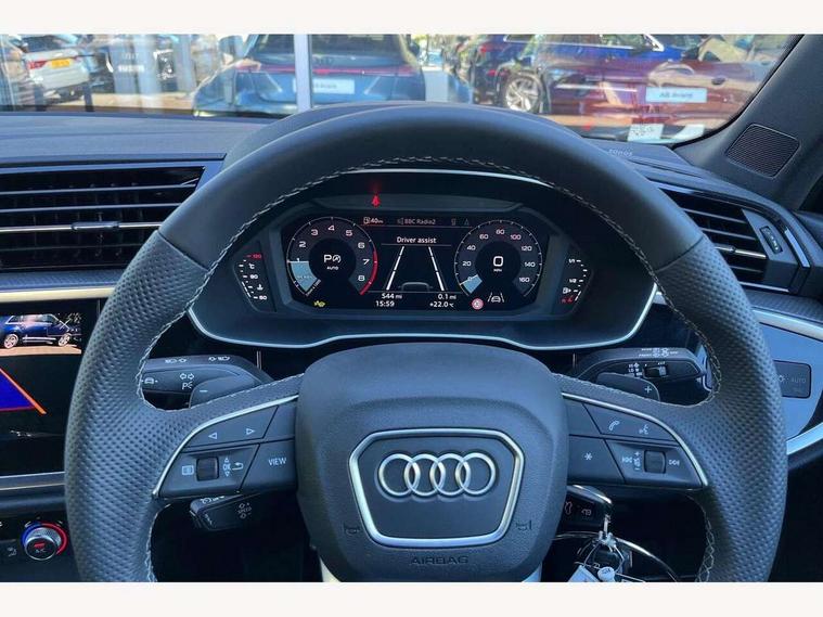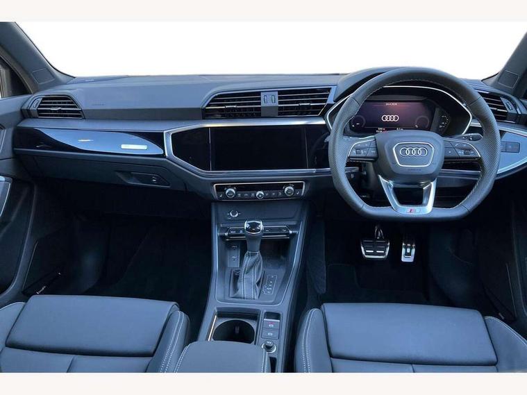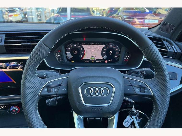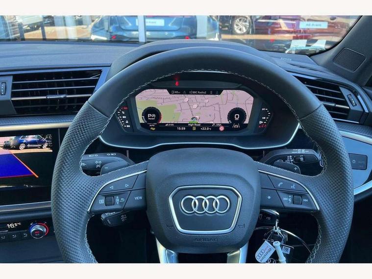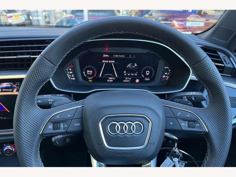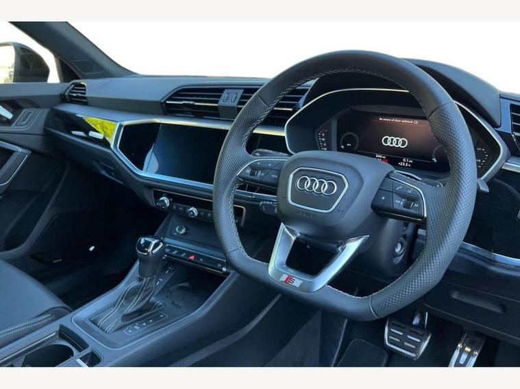 Amazon alexa Integration, Audi connect safety and service, Audi drive select, Audi lane departure warning, Audi Virtual Cockpit - 10.25" display, Bluetooth interface, Camera based traffic sign recognition, Distraction and Fatigue warning, Legal emergency call, MMI Navigation Plus with high resolution 10.1 inch touchscreen colour display, Power operated tailgate, Progressive steering, Service interval indicator, Smartphone interface includes wireless Apple carplay/Android Auto, Start stop system with recuperation, Voice control system with natural language interaction, Sports suspension, 2 USB-C ports with charge and data functions, 6 passive loudspeakers, DAB digital radio module, Acoustic windscreen, Anthracite black radiator grille, Audi Beam uses LEDs to project the Audi logo onto the ground as you exit your Q3, Auto dimming door mirrors, Auto dimming frameless rear view mirror, Black roof rails, Electrically folding, adjustable and heated door mirrors with integrated LED side indicators and kerb view function for passenger side, Front and rear electric windows, Front fog lights, Grille vertical bars in aluminium silver/Matt, High gloss black finish B and C pillars, LED Dynamic rear indicators, LED headlights with LED daytime running lights, LED rear lights, LED third brake light, Privacy glass dark tinted rear and rear-side windows (from B-pillar backwards), Rain and light sensors, Rear diffuser grille in grained matt black, Rear diffuser strip in matt anthracite black, Rear side wing doors, Rear wiper, S line bumpers in contrasting Manhattan grey, Variable front intermittent wipers, 12V socket in rear centre console, 3 seat bench in 2nd row, 40:20:40 folding with manual adjustment for 60:40 forwards/backwards position and backrest angle, Adjustable rear seat bench/backrest with centre armrest and cupholder, Black carpet mats, Black cloth headlining, Dual zone electronic climate control, Electric lumbar support, Front and rear black floor mats with contrast stitching in rock grey, Front and rear headrests, Front centre armrest, Height and reach adjustable steering wheel, Illuminated door sill trims with S logo, ISOFIX child seat mounting for front passenger with airbag deactivation and outer rear seat including top tether attachment point for outer rear seats, Luggage compartment sill protection in stainless steel, Manual front seats with height adjustment, Perforated leather gearknob, Single front passenger seat, Stainless steel pedals, Twin leather upholstery with front sport seats + S embossing, Black styling pack - Q3, Non smoking pack - Q3, 3x3 point rear seatbelts, 6 airbags - Driver, front passenger, curtain and side windows, Audi pre-sense front with pedestrain and cyclist recognition, Electrically operated child locks on rear doors, Electromechanical parking brake, Electronic stabilisation control including ABS, ASR and EDL, Front seatbelt reminder, Hill descent control, Hill hold assist, Pre sense basic, Seatbelt monitoring, Tyre pressure warning, Warning triangle and first aid kit, Anti theft wheel bolts, Immobiliser, Remote central locking, Thatcham approved category 1 anti theft alarm, Aluminium look interior elements, Detail dashboard around MMI touch colour display in glass look, black with surround in aluminium look, Leatherette door armrest, Piano black inlay,