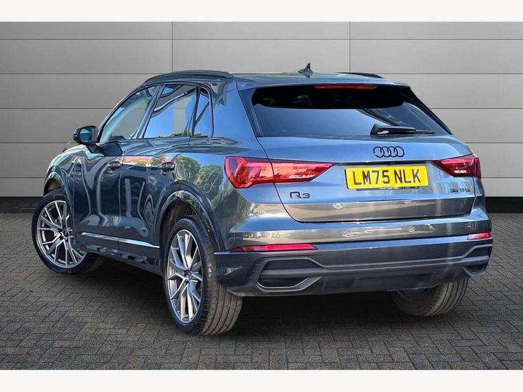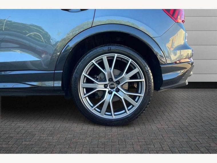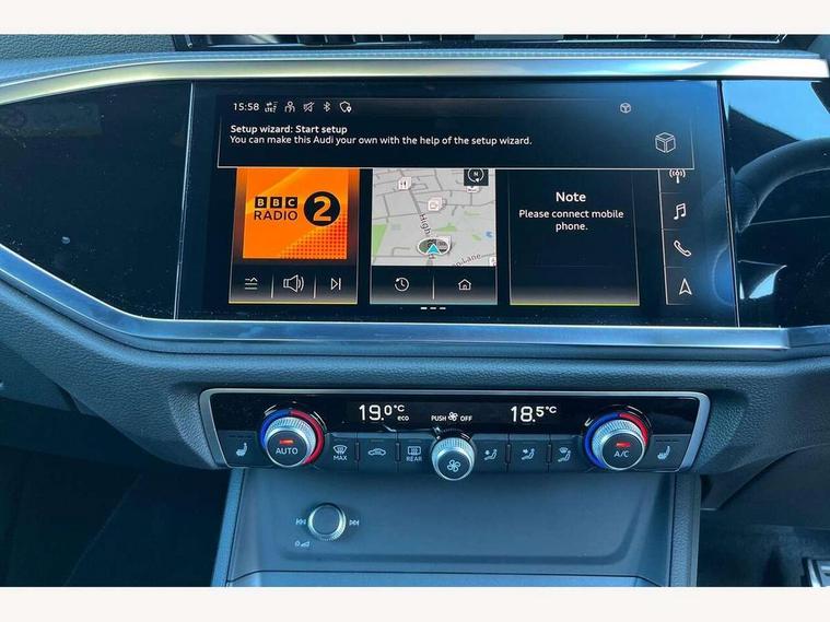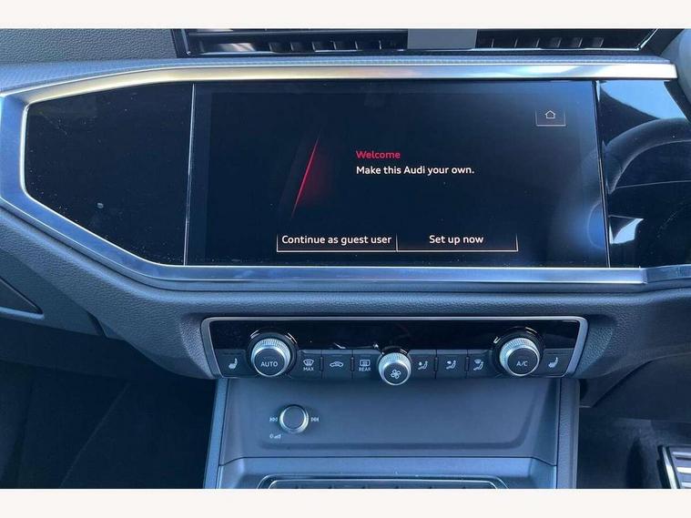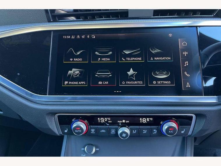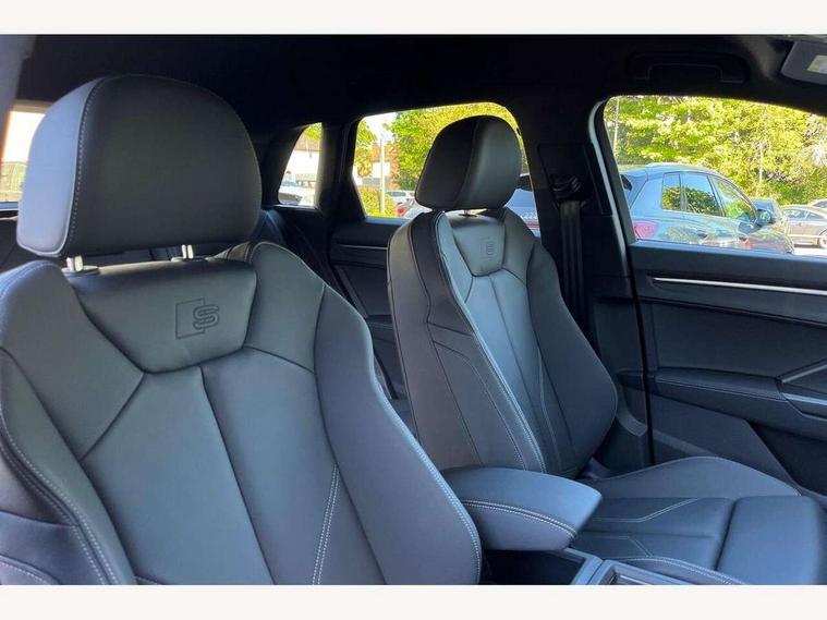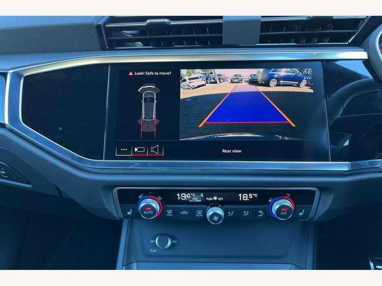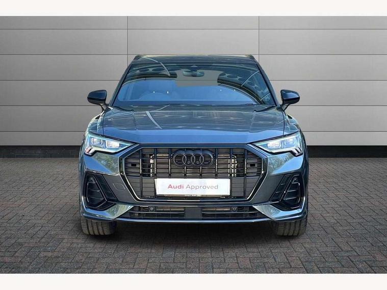 Amazon alexa Integration, Audi connect safety and service, Audi drive select, Audi lane departure warning, Audi Virtual Cockpit - 10.25" display, Bluetooth interface, Camera based traffic sign recognition, Distraction and Fatigue warning, Legal emergency call, MMI Navigation Plus with high resolution 10.1 inch touchscreen colour display, Power operated tailgate, Progressive steering, Service interval indicator, Smartphone interface includes wireless Apple carplay/Android Auto, Start stop system with recuperation, Voice control system with natural language interaction, Sports suspension, 2 USB-C ports with charge and data functions, 6 passive loudspeakers, DAB digital radio module, Acoustic windscreen, Anthracite black radiator grille, Audi Beam uses LEDs to project the Audi logo onto the ground as you exit your Q3, Auto dimming door mirrors, Auto dimming frameless rear view mirror, Black roof rails, Electrically folding, adjustable and heated door mirrors with integrated LED side indicators and kerb view function for passenger side, Front and rear electric windows, Front fog lights, Grille vertical bars in aluminium silver/Matt, High gloss black finish B and C pillars, LED Dynamic rear indicators, LED headlights with LED daytime running lights, LED rear lights, LED third brake light, Privacy glass dark tinted rear and rear-side windows (from B-pillar backwards), Rain and light sensors, Rear diffuser grille in grained matt black, Rear diffuser strip in matt anthracite black, Rear side wing doors, Rear wiper, S line bumpers in contrasting Manhattan grey, Variable front intermittent wipers, 12V socket in rear centre console, 3 seat bench in 2nd row, 40:20:40 folding with manual adjustment for 60:40 forwards/backwards position and backrest angle, Adjustable rear seat bench/backrest with centre armrest and cupholder, Black carpet mats, Black cloth headlining, Dual zone electronic climate control, Electric lumbar support, Front and rear black floor mats with contrast stitching in rock grey, Front and rear headrests, Front centre armrest, Height and reach adjustable steering wheel, Illuminated door sill trims with S logo, ISOFIX child seat mounting for front passenger with airbag deactivation and outer rear seat including top tether attachment point for outer rear seats, Luggage compartment sill protection in stainless steel, Manual front seats with height adjustment, Perforated leather gearknob, Single front passenger seat, Stainless steel pedals, Twin leather upholstery with front sport seats + S embossing, Black styling pack - Q3, Non smoking pack - Q3, 3x3 point rear seatbelts, 6 airbags - Driver, front passenger, curtain and side windows, Audi pre-sense front with pedestrain and cyclist recognition, Electrically operated child locks on rear doors, Electromechanical parking brake, Electronic stabilisation control including ABS, ASR and EDL, Front seatbelt reminder, Hill descent control, Hill hold assist, Pre sense basic, Seatbelt monitoring, Tyre pressure warning, Warning triangle and first aid kit, Anti theft wheel bolts, Immobiliser, Remote central locking, Thatcham approved category 1 anti theft alarm, Aluminium look interior elements, Detail dashboard around MMI touch colour display in glass look, black with surround in aluminium look, Leatherette door armrest, Piano black inlay,