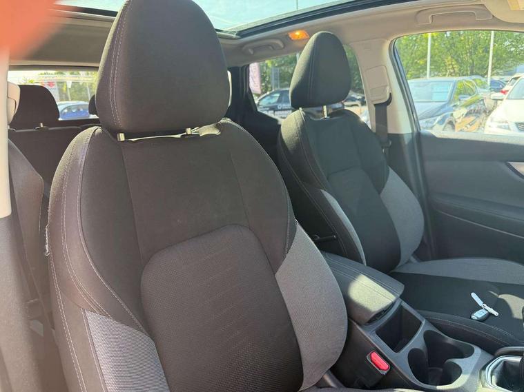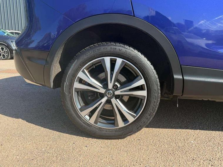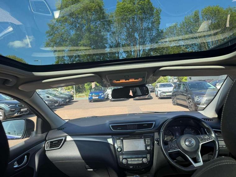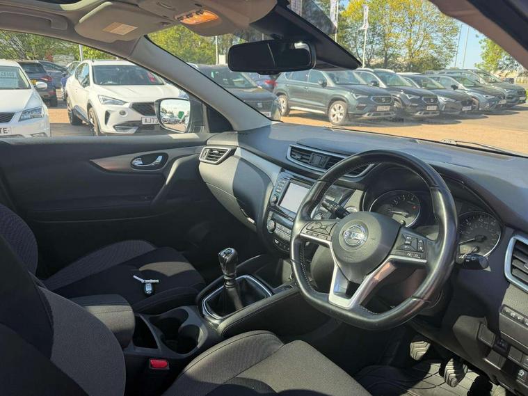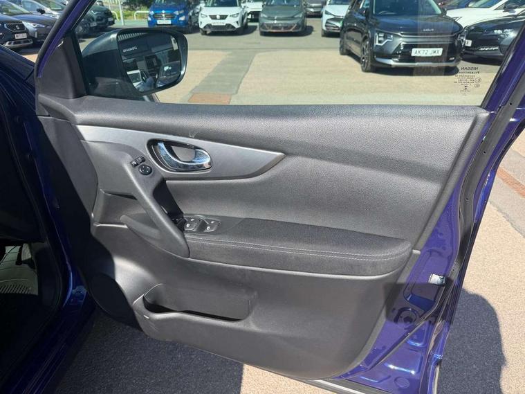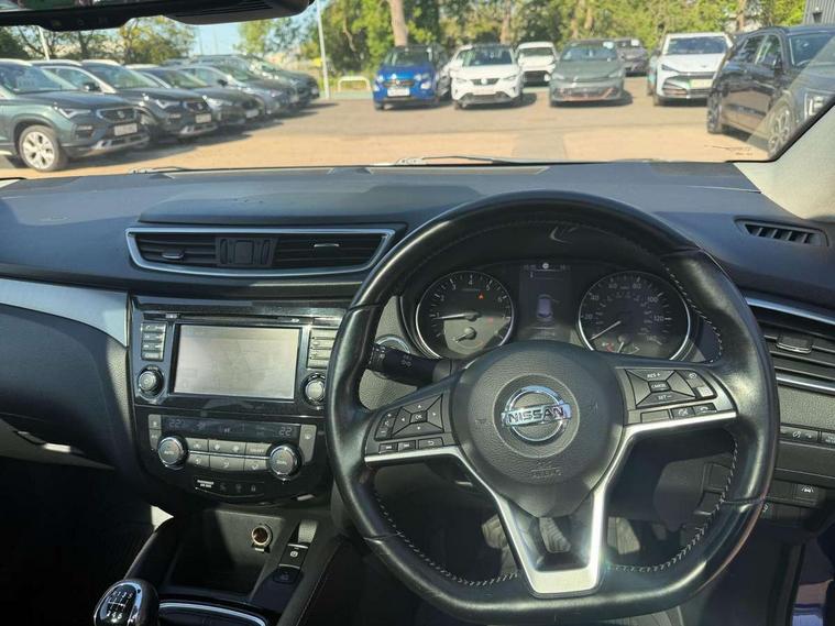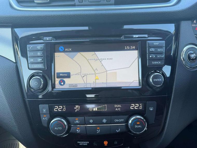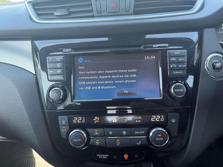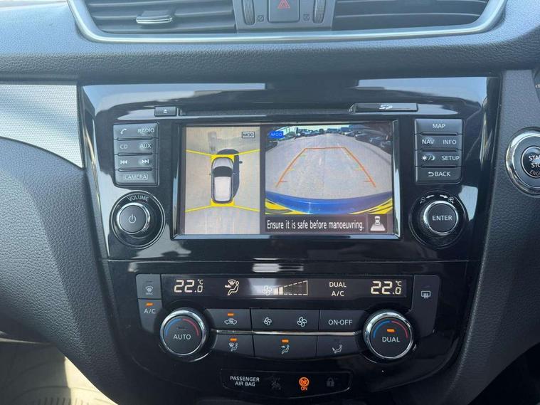 5" TFT driver information centre, Around View Monitor, Bluetooth phone integration system, Cruise control, Electric speed sensitive power steering, Front and rear parking sensors, Lane departure warning system, Nissan connect sat nav system, Outside temperature display, Push button starter, Rear view camera, Service interval indicator, Speed limiter, Traffic sign recognition, Trip computer, 'Shark fin' mobile antenna, 6 speakers, DAB Digital radio, Radio/CD, Smartphone apps, Steering wheel mounted audio controls, USB/aux input socket, Automatic headlamp activation, Body colour bumpers, Body colour door handles, Body colour door mirrors, Chrome window surround, Electric folding and heated door mirrors, High beam assist, Interior mirror with auto anti dazzle, LED indicators in door mirrors, Matt silver roof rails, One touch electric front/rear windows, Privacy glass, Rain sensor windscreen wipers, Rear roof spoiler, Rear wiper, 2 X front 12v power sockets, 60/40 split folding rear seat, Ambient interior lighting, Centre console with armrest, Chrome interior door handles, Cloth upholstery, Configurable luggage board system, Driver + front passenger lumbar support, Dual zone climate control, Front and rear door pockets with bottle holders, Front headrests, Front seat belt pre-tensioners with load limiters, Height adjustable driver's seat, Height adjustable passenger seat, Illuminated electric window switch, Isofix child seat preparation, Leather gearknob, Leather interior door handles, Leather knee rest, Leather steering wheel, Luggage compartment lighting, Parcel shelf, Pollen filter, Rake/reach adjustable steering wheel, Rear headrests, ABS, brake assist and EBD, Child locks on rear doors, Curtain airbags, Driver/front passenger airbag, Electronic parking brake, ESP + traction control, Forward emergency braking, Front passenger airbag deactivation, Height adjustable front seatbelts, Hill start assist, Seatbelt warning, Side airbags, Three 3 point rear seatbelts, Tyre pressure monitoring system, Alarm, Immobiliser, Intelligent Key, Remote central locking, Piano black interior trim, 18" Bi-colour alloy wheels, Tyre puncture repair kit,