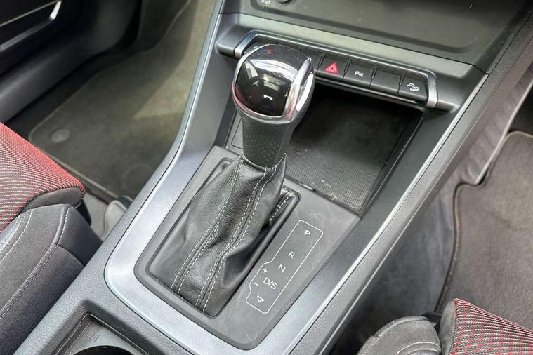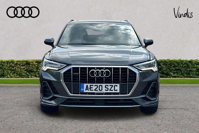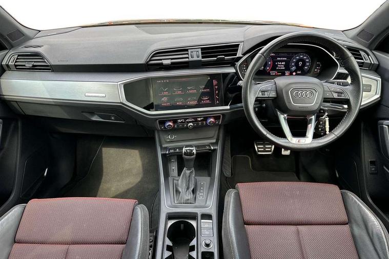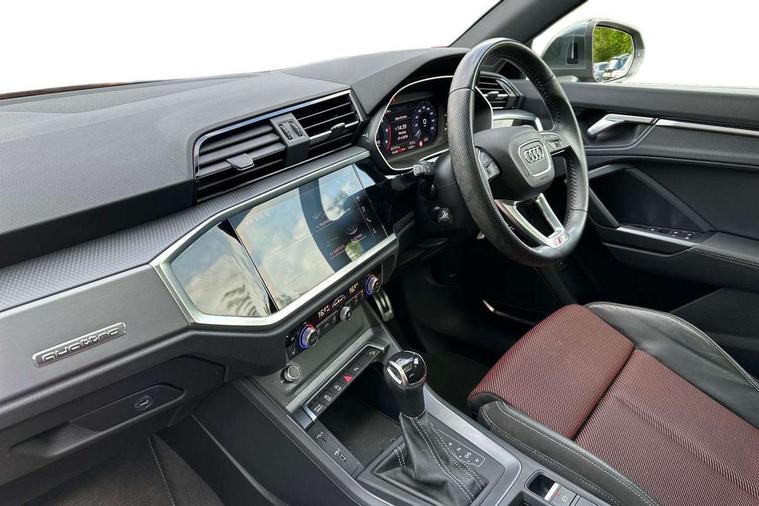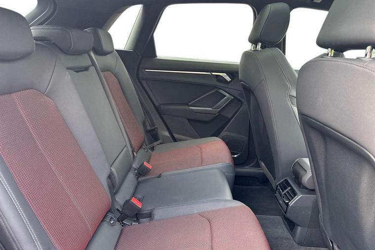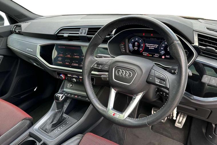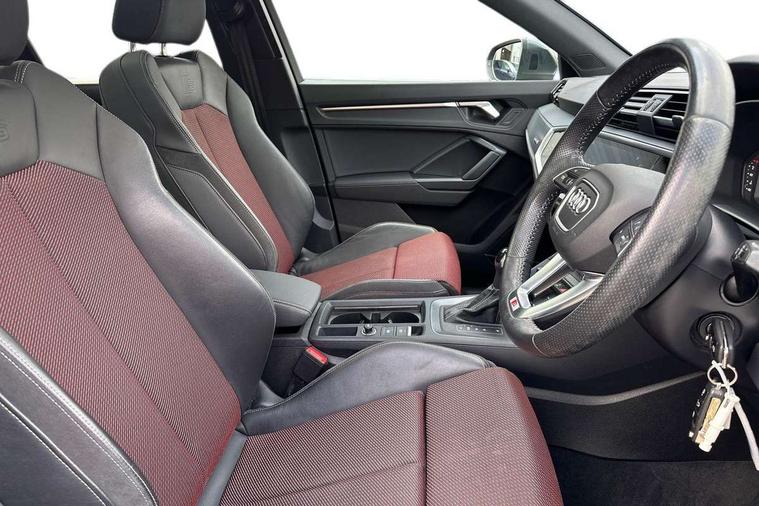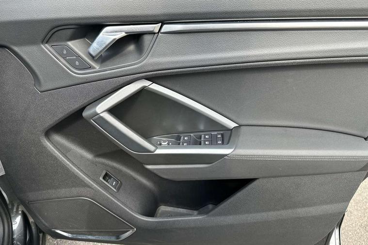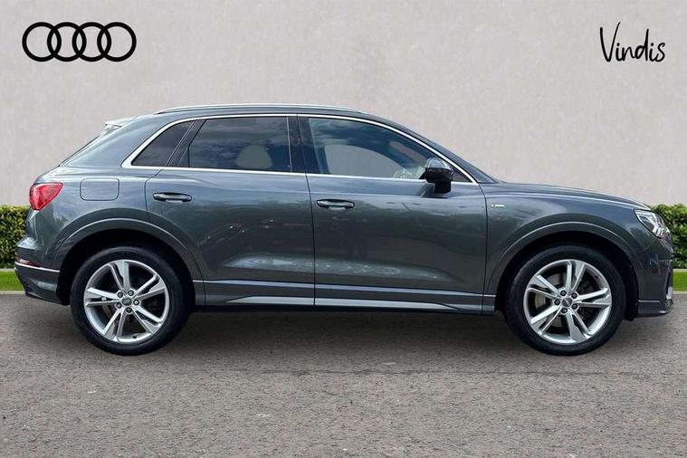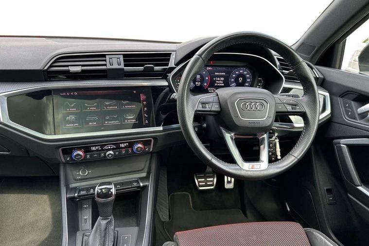 Apple CarPlay, Audi connect safety and service (e-call), Audi drive select, Audi lane departure warning, Audi side assist, Audi smartphone interface, Audi Virtual Cockpit - 10.25" display, Bluetooth interface, Camera based traffic sign recognition, MMI Navigation Plus with high resolution 10.1 inch touchscreen colour display, Power opening/closing tailgate, Progressive steering, Service interval indicator, Start stop system with recuperation, Voice control system with natural language interaction, Diesel particulate filter, Sports suspension, 1 x USB type C and 1 USB type A charging points, 6 speakers, DAB digital radio module, Acoustic windscreen, Aluminium roof rails, Aluminium window trim, Auto dimming frameless rear view mirror, Body coloured bumpers, Electrically folding, adjustable and heated door mirrors with integrated LED side indicators and kerb view function for passenger side, Front and rear electric windows, Front fog lights, Front side air inlets in matt platinum grey, Front spoiler blade in matt platinum grey, Grille vertical bars in aluminium silver/Matt, High gloss black finish B and C pillars, LED headlights with LED daytime running lights and dynamic rear indicator, LED rear lights, Privacy glass, Rain and light sensors, Rear diffuser strip in matt titanium black, S Line badge on wings, S Line front and rear bumpers, Side skirt insert in matt Platinium grey, Silver chrome grille surround, Titanium black radiator grille, 12V socket in rear centre console, 40:20:40 split folding rear bench seat, 60:40 forwards/backwards position and backrest angle, Adjustable rear seat bench/backrest with centre armrest and cupholder, Aluminium door sill trims, Black cloth headlining, Dual zone electronic climate control, Front and rear black floor mats with contrast stitching in rock grey, Front and rear headrests, Front and rear roof module including reading lights, Front centre armrest with storage compartment and angle adjustment, Glove compartment lighting, Height and reach adjustable steering wheel, Illuminated door sill trims with S logo, ISOFIX child seat mounting and Top Tether with front passenger airbag deactivation, Luggage compartment light, Manual front seats with height adjustment, Perforated leather gearknob, Stainless steel luggage compartment sill finisher, Stainless steel pedals, Non smoking pack - Q3, 3x3 point rear seatbelts, 6 airbags - Driver, front passenger, curtain and side windows, Audi pre-sense front with pedestrain and cyclist recognition, Electrically operated child locks on rear doors, Electromechanical parking brake, Electronic stabilisation control including ABS, ASR and EDL, Hill descent control, Hill hold assist, Pre sense basic, Seatbelt monitoring, Tyre pressure warning, Warning triangle and first aid kit, Anti theft alarm, Anti theft wheel bolts, Remote central locking, Dark matt brushed aluminium inlay, Leatherette door armrest, MMI touch colour display in gloss black with aluminium surround,