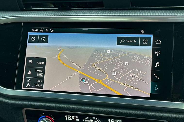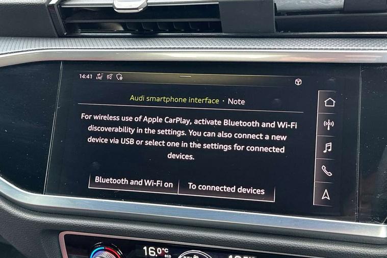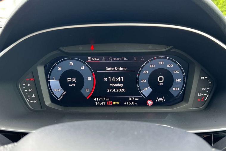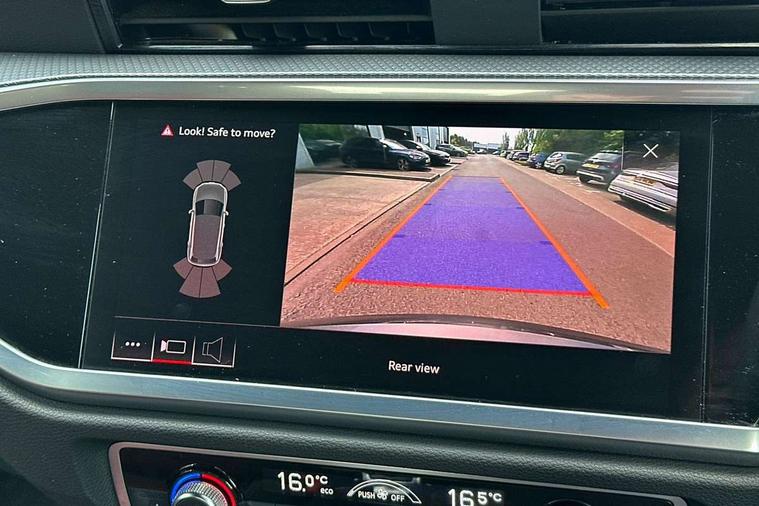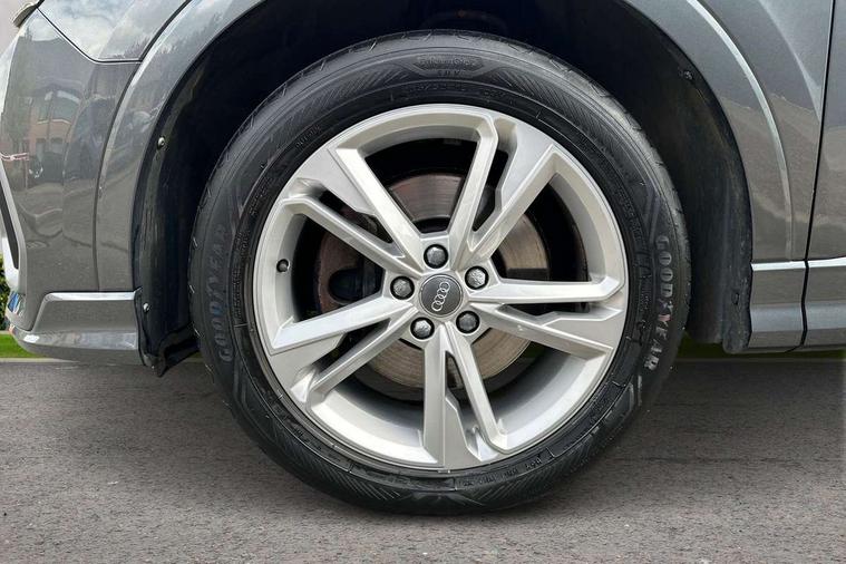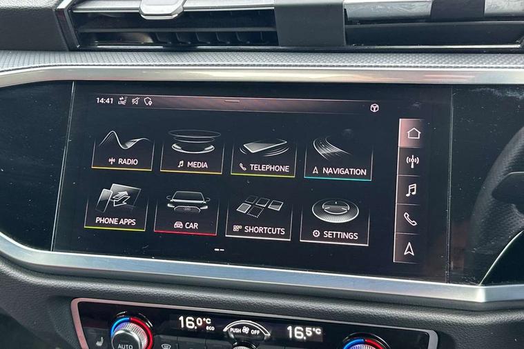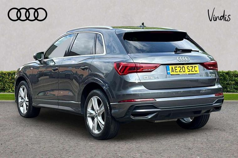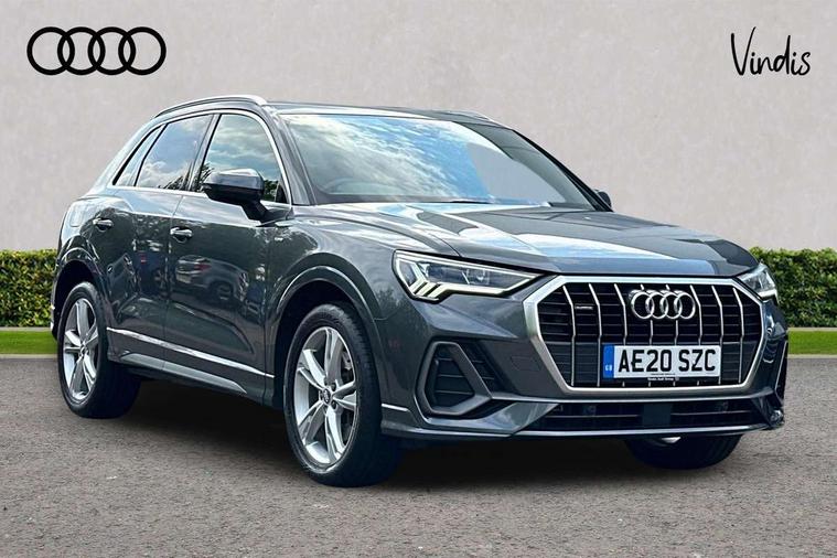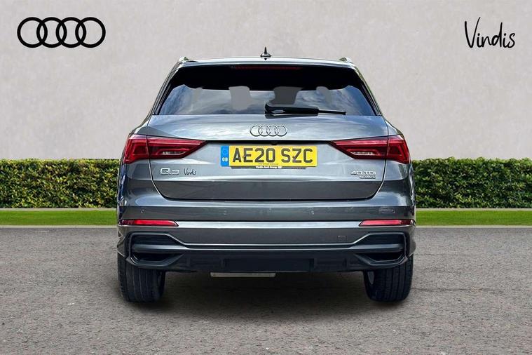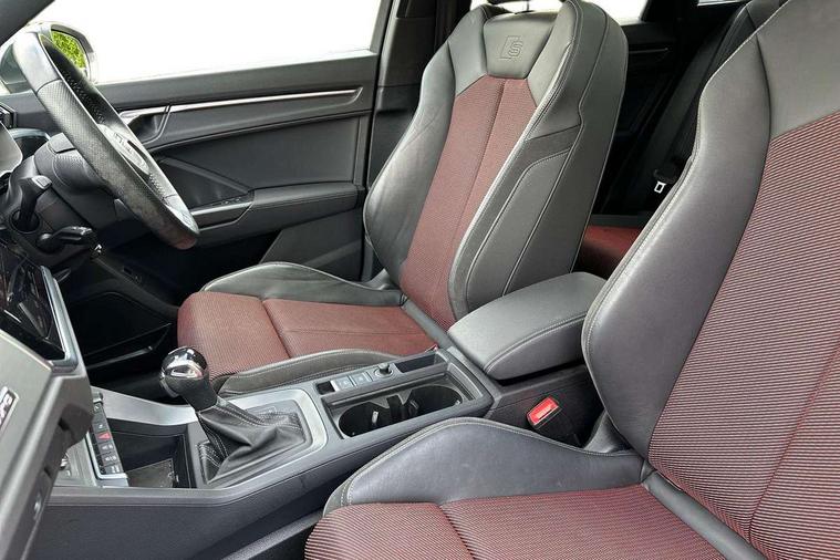 Apple CarPlay, Audi connect safety and service (e-call), Audi drive select, Audi lane departure warning, Audi side assist, Audi smartphone interface, Audi Virtual Cockpit - 10.25" display, Bluetooth interface, Camera based traffic sign recognition, MMI Navigation Plus with high resolution 10.1 inch touchscreen colour display, Power opening/closing tailgate, Progressive steering, Service interval indicator, Start stop system with recuperation, Voice control system with natural language interaction, Diesel particulate filter, Sports suspension, 1 x USB type C and 1 USB type A charging points, 6 speakers, DAB digital radio module, Acoustic windscreen, Aluminium roof rails, Aluminium window trim, Auto dimming frameless rear view mirror, Body coloured bumpers, Electrically folding, adjustable and heated door mirrors with integrated LED side indicators and kerb view function for passenger side, Front and rear electric windows, Front fog lights, Front side air inlets in matt platinum grey, Front spoiler blade in matt platinum grey, Grille vertical bars in aluminium silver/Matt, High gloss black finish B and C pillars, LED headlights with LED daytime running lights and dynamic rear indicator, LED rear lights, Privacy glass, Rain and light sensors, Rear diffuser strip in matt titanium black, S Line badge on wings, S Line front and rear bumpers, Side skirt insert in matt Platinium grey, Silver chrome grille surround, Titanium black radiator grille, 12V socket in rear centre console, 40:20:40 split folding rear bench seat, 60:40 forwards/backwards position and backrest angle, Adjustable rear seat bench/backrest with centre armrest and cupholder, Aluminium door sill trims, Black cloth headlining, Dual zone electronic climate control, Front and rear black floor mats with contrast stitching in rock grey, Front and rear headrests, Front and rear roof module including reading lights, Front centre armrest with storage compartment and angle adjustment, Glove compartment lighting, Height and reach adjustable steering wheel, Illuminated door sill trims with S logo, ISOFIX child seat mounting and Top Tether with front passenger airbag deactivation, Luggage compartment light, Manual front seats with height adjustment, Perforated leather gearknob, Stainless steel luggage compartment sill finisher, Stainless steel pedals, Non smoking pack - Q3, 3x3 point rear seatbelts, 6 airbags - Driver, front passenger, curtain and side windows, Audi pre-sense front with pedestrain and cyclist recognition, Electrically operated child locks on rear doors, Electromechanical parking brake, Electronic stabilisation control including ABS, ASR and EDL, Hill descent control, Hill hold assist, Pre sense basic, Seatbelt monitoring, Tyre pressure warning, Warning triangle and first aid kit, Anti theft alarm, Anti theft wheel bolts, Remote central locking, Dark matt brushed aluminium inlay, Leatherette door armrest, MMI touch colour display in gloss black with aluminium surround,