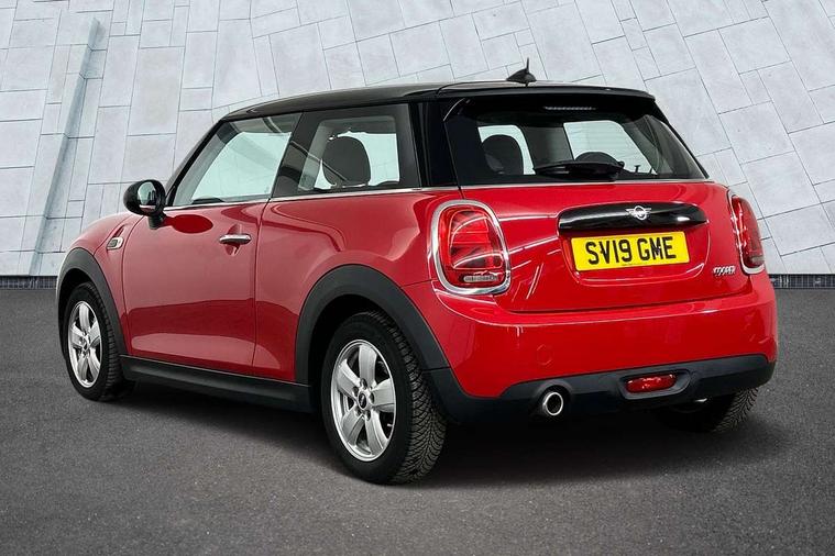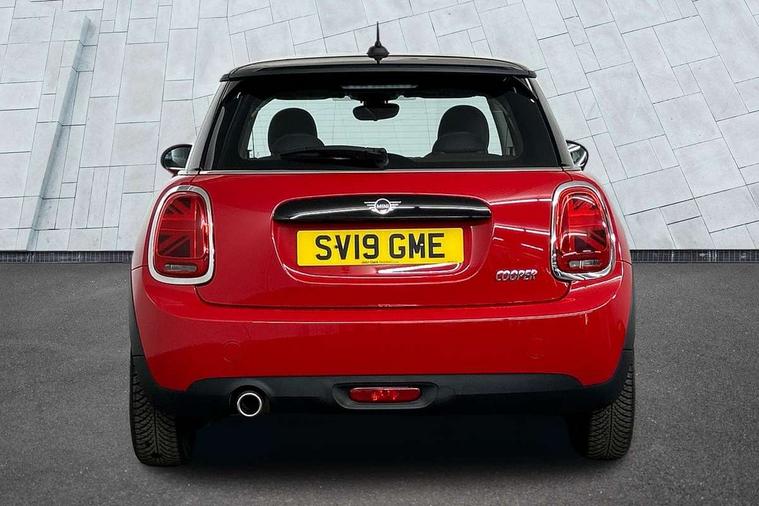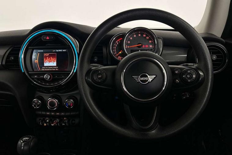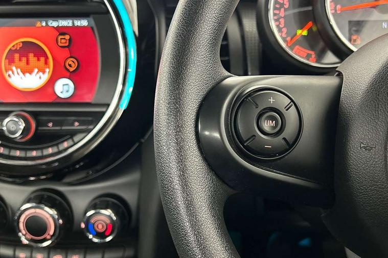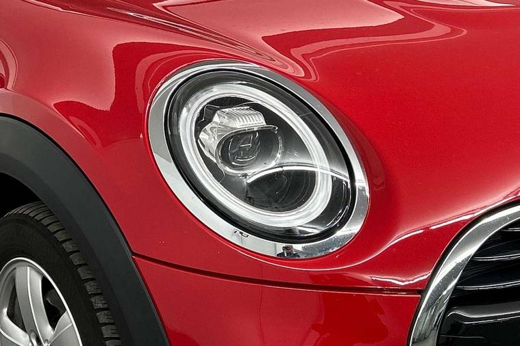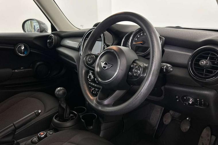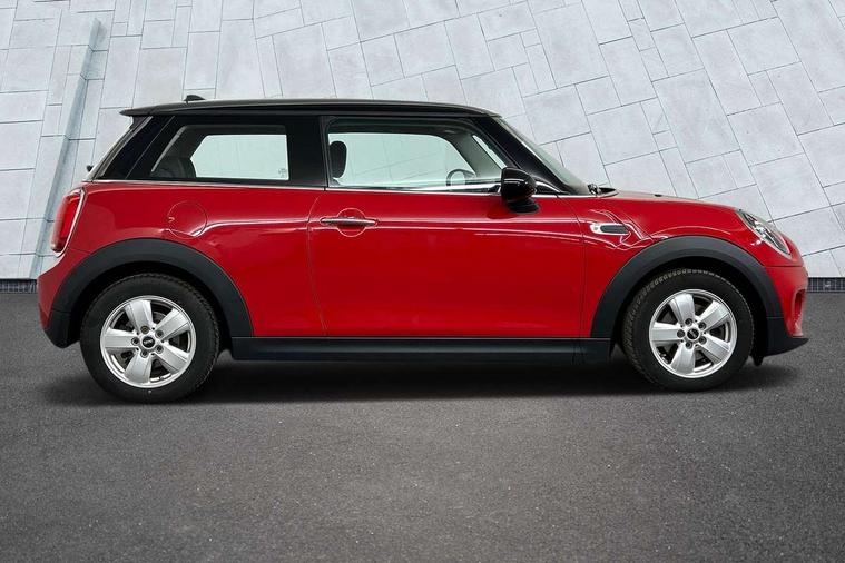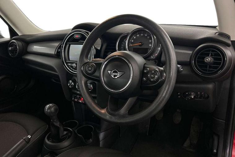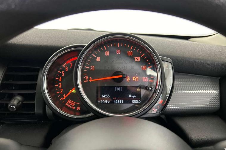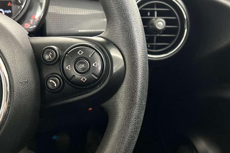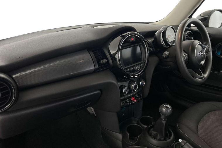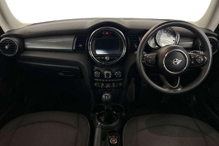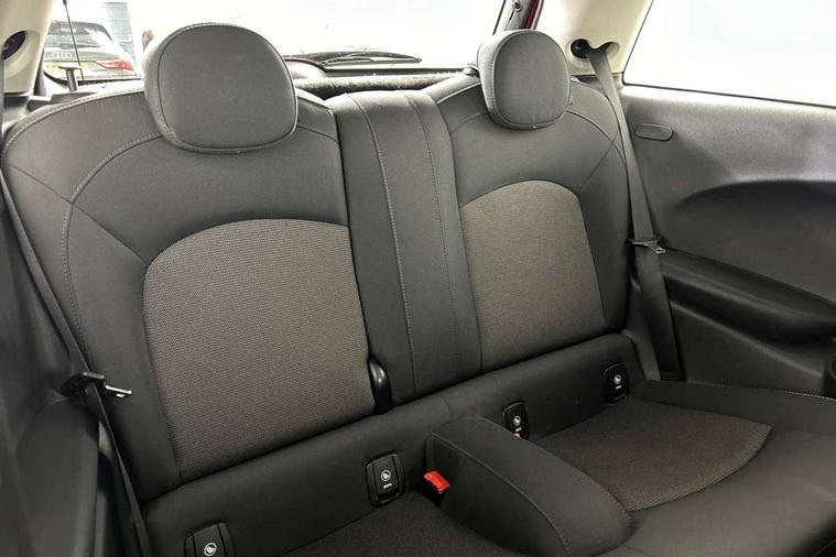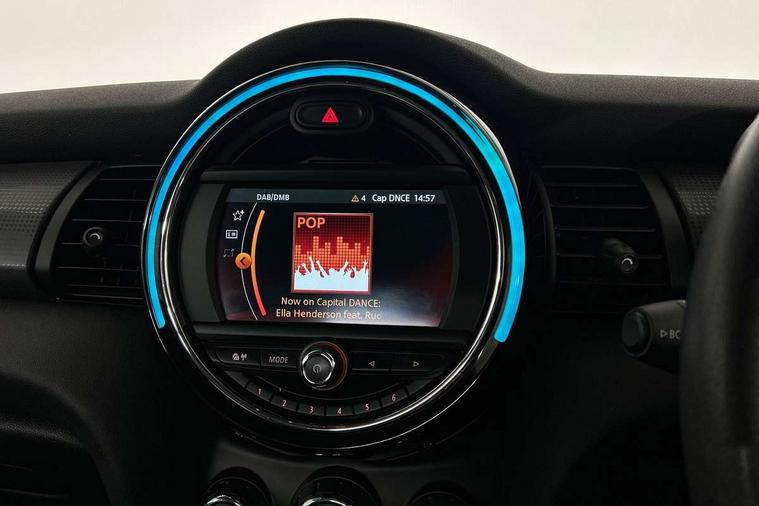 Alarm system with tilt sensor, monitoring doors, bonnet interior and tailgate, Electronic vehicle immobiliser, Start/stop toggle with keyless go, 6.5" touchscreen with LED ring, FM tuner and DAB digital radio, 3 point seatbelts on all four seats, 6 Airbags - front, side, head and seat belt tensioners, Anti-lock braking system (ABS), DSC - Dynamic Stability Control, Front and rear disc brakes, Hill start assist, Single tone fanfare horn, Tyre pressure monitoring system, Automatic headlight activation switch, Body colour fuel filler cap, Chrome border high gloss black slats radiator grille, Dynamic brake lights, Electric front+rear windows, Heated rear window, Heated windscreen washer jets, LED headlight with closed ring and daytime driving lights, Left exhaust tailpipe with chrome finisher, Metal door sill strips with MINI imprint, Model logo Cooper on right of tailgate, Rain sensor window wipers, Rear fog lights, Rear LED lights with union jack design, Rear window wiper, Side scuttle panel with integrated indicator, Sun/heat protection glass, White indicator lenses, 12V Accessory socket in centre console, 4 lashing eyes in luggage compartment, 60/40 split folding rear seat, Chrome interior highlights, Colour line - Carbon black, Cupholders, Front and rear isofix with front passenger airbag deactivation, Glove compartment, Height and length steering column adjustment, Interior lighting with 12 basic colours selectable via toggle switch in roof, Leather gearshift lever and handbrake gaiters, LED reading lights, vanity mirror lights, front foot well light and spotlight on front seats, Manual air conditioning, Mechanical seat adjustment, driver seat height adjust, forward/back and front seats backrest, Mini logo projection on floor from drivers exterior mirror, Multifunction steering wheel, Satellite grey headlining, Storage compartments in doors, Sunvisors with vanity mirrors, Tool kit, Compatible mobile phone bluetooth with audio streaming, Instrument cluster, Mini E-call, MINI TeleServices, On board computer, Service interval indicator,