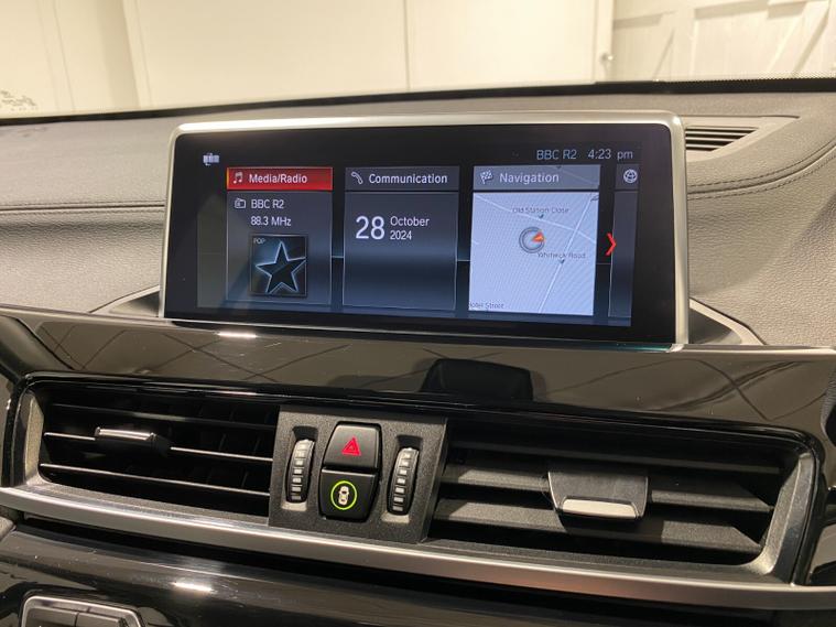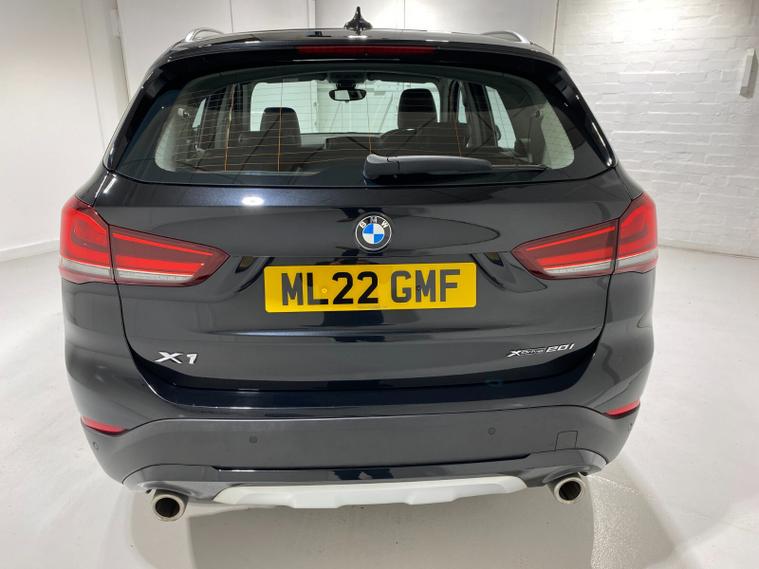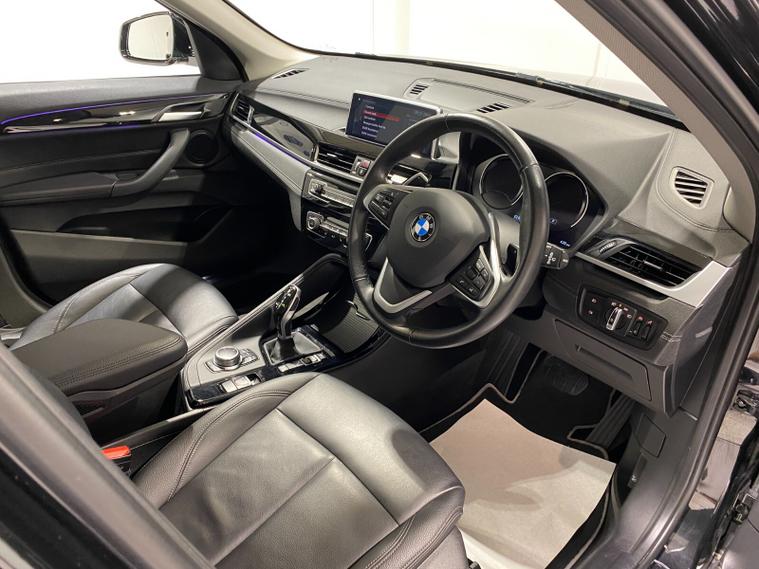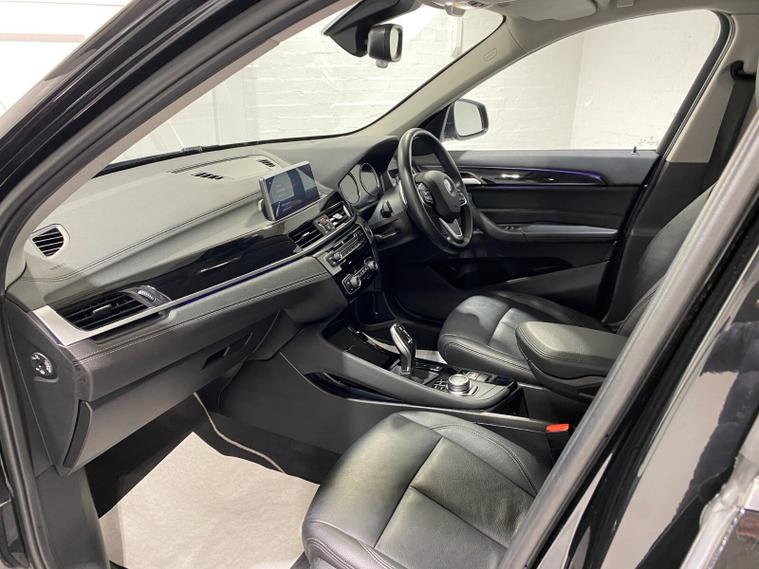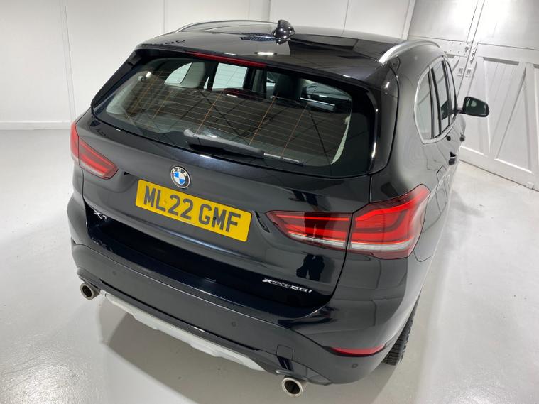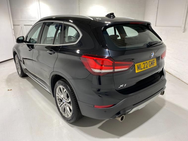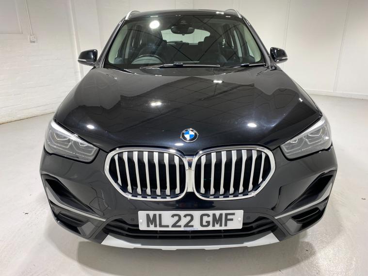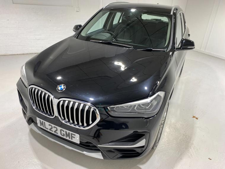 2022 22 Reg BMW X1 20i 2.0 (178PS) xDRIVE X-LINE AUTOMATIC 5dr. Black Sapphire metallic with black ‘Dakota’ FULL LEATHER interior, , 18 inch alloy wheels, DUAL ZONE CLIMATE CONTROL, HEATED FRONT SEATS, LED ambient lighting, BMW Professional DAB radio and CD with BLUETOOTH USB, PARK ASSIST with FRONT and REAR PARKING SENSORS, electrically operated, heated and power folding mirrors, electric opening tailgate, front and rear electric windows, auto headlights and rain sensing wipers, LED headlights, silver roof rails, remote central locking, push button start, CRUISE CONTROL with speed limiter, tyre pressure monitor, hill start assist, ABS, EBD, drivers and passengers front and side airbags, 26, 752 miles (ML 22 GMF).