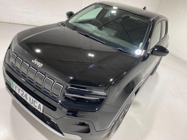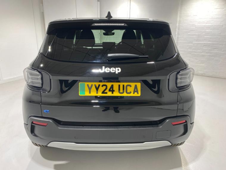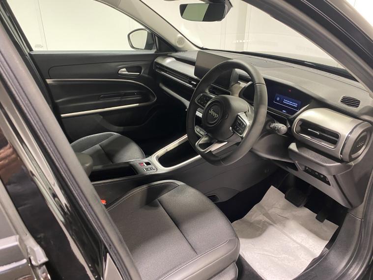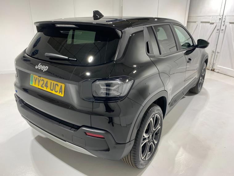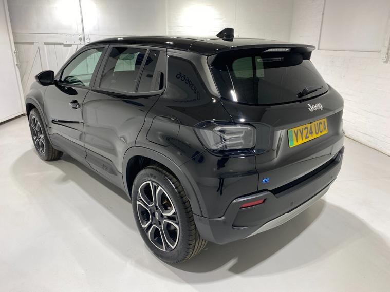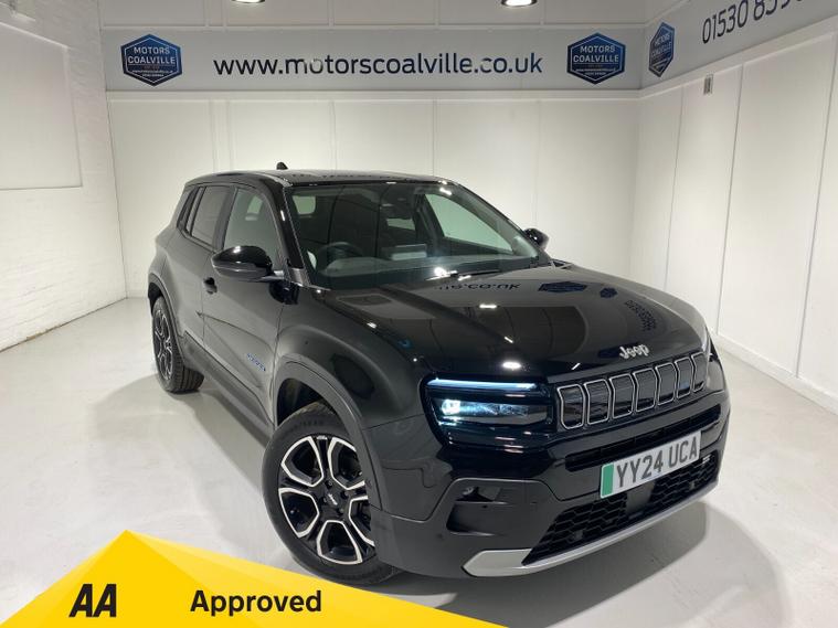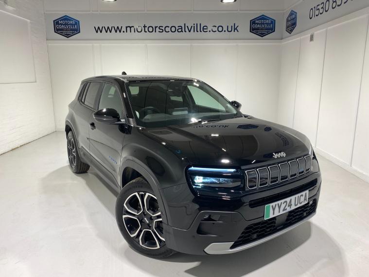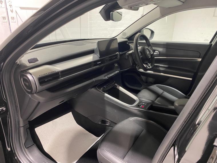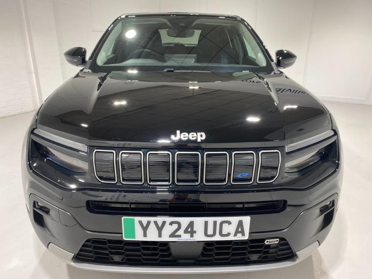 2024 24 Reg JEEP Avenger 54kWh EV (156PS) Automatic SUMMIT 5dr. Volcano Black with Black interior, 18 inch alloy wheels, TOUCHSCREEN SATELLITE NAVIGATION, Bluetooth USB, Android Auto, Apple CarPlay, DAB, wireless charger, PRIVACY GLASS, LED PROJECTOR HEADLIGHTS, CLIMATE CONTROL AIR CON, HEATED FRONT SEATS, electrically adjustable, heated and power folding mirrors, rain sensing wipers, auto lights, auto high beam, keyless entry and start, URBAN BLIND SPOT MONITOR, ADVANCED PARK ASSIST with FRONT, REAR and SIDE PARKING SENSORS and REAR CAMERA, ADAPTIVE CRUISE CONTROL with lane centring, handsfree power tailgate, All-Terrain Mode selector, hill decent control, passive entry, hill start assist, lane departure warning, ABS, ESP, ESC, 8, 300 miles (YY 24 UCA).