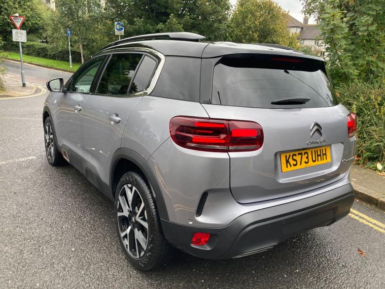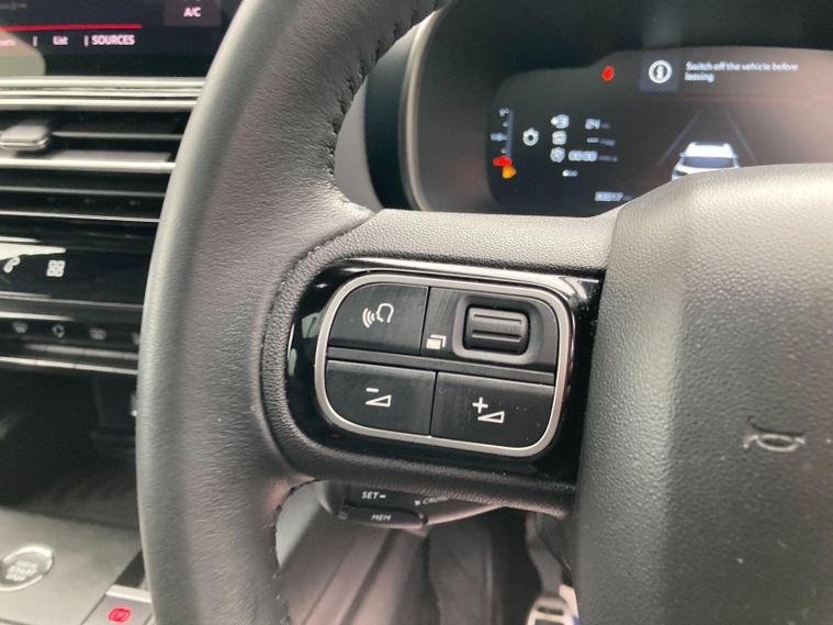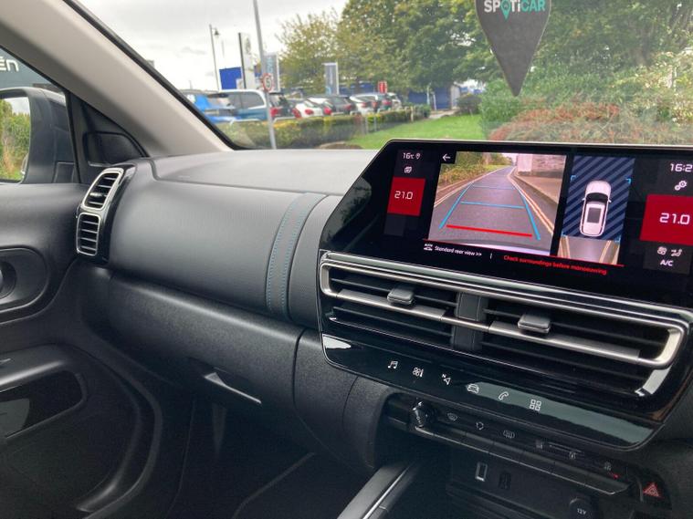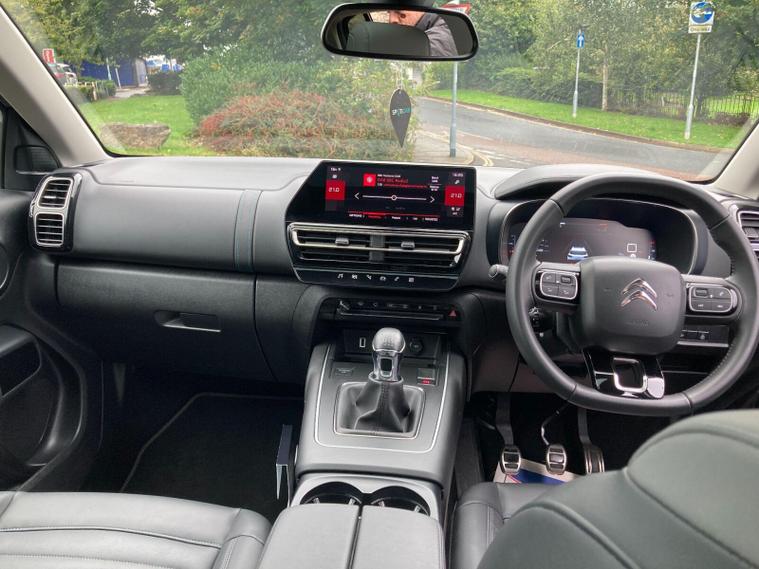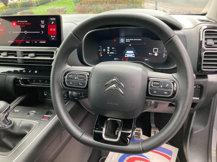 This C5 Aircross C Series Edition also boasts automatic dual zone climate control for personalised comfort, and an acoustic laminated windscreen with rain and brightness sensors for enhanced visibility and convenience. The electric, heated, and folding door mirrors feature LED approach lighting and blind spot monitoring indicators, adding an extra layer of safety. With an impressive fuel economy of up to 49 miles per gallon, low CO2 emissions, and generous boot space, this Citroen C5 Aircross stands out as a sensible and well equipped choice for your next vehicle.