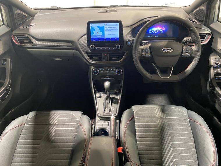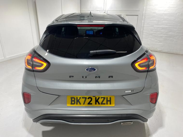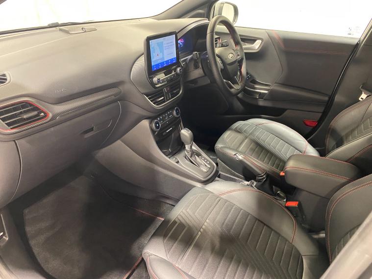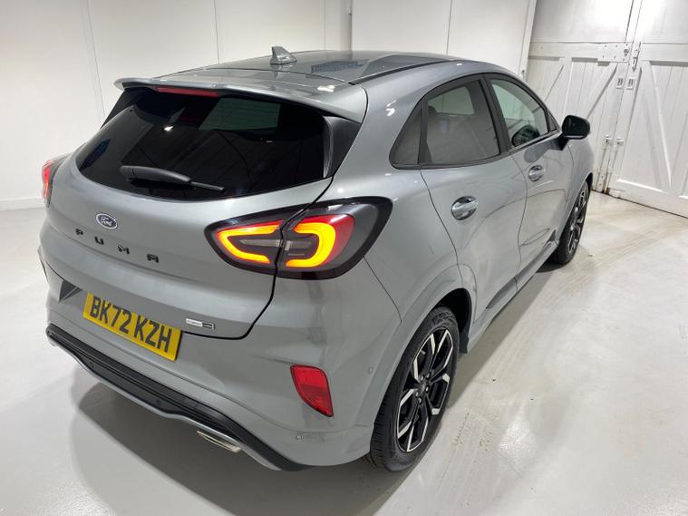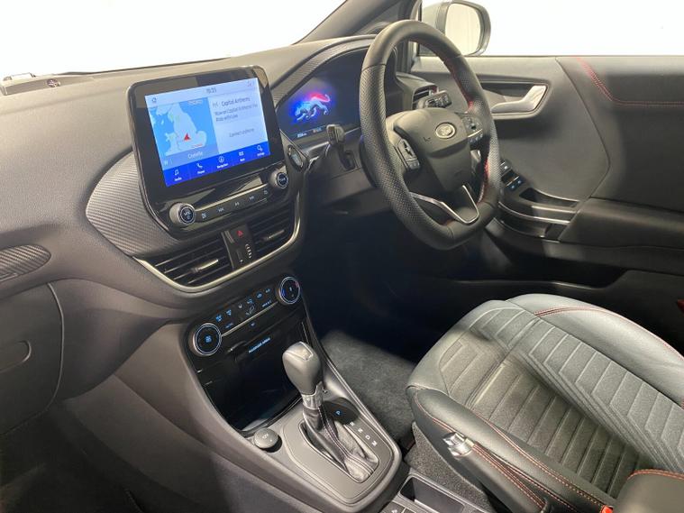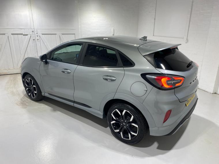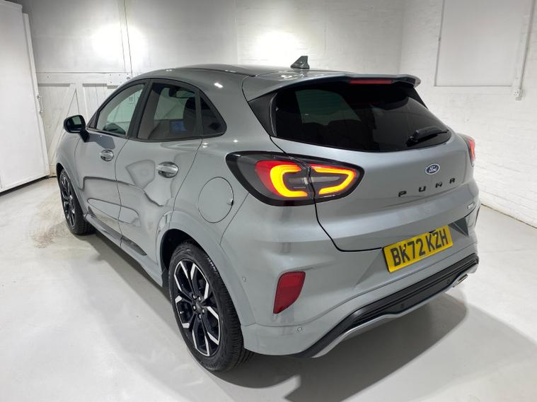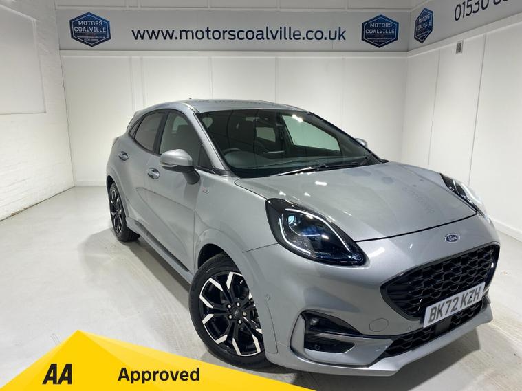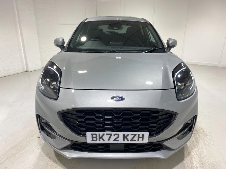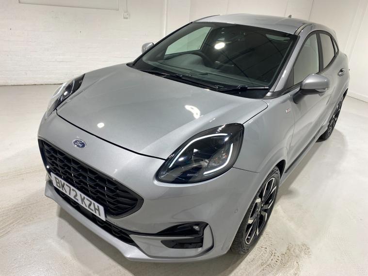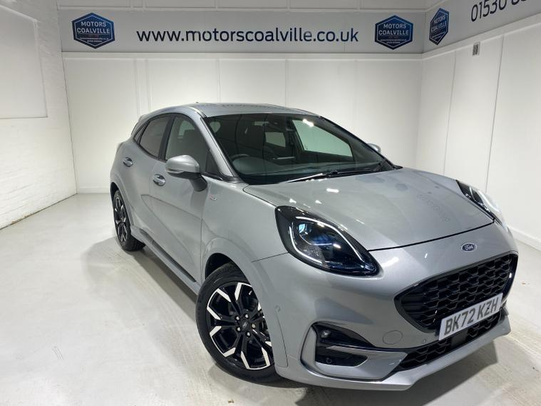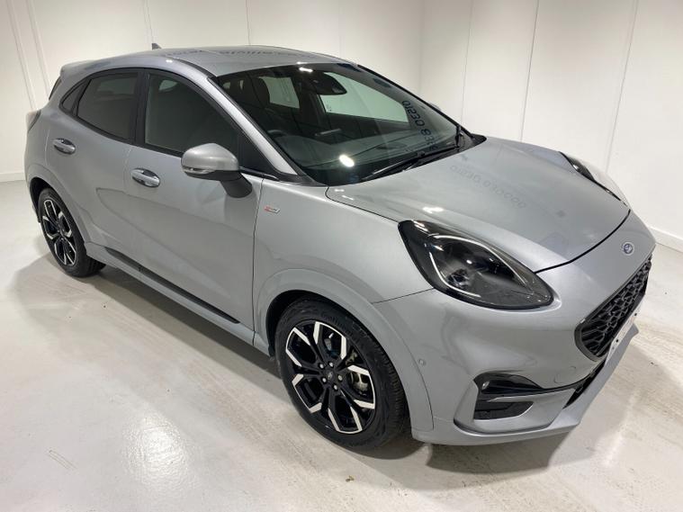2022 72 Reg Ford Puma 1.0 EcoBoost mHEV (125PS) ST Line X AUTOMATIC 5dr. Solar Silver metallic with Part LEATHER/Cloth interior, ST -LINE BODY KIT with LARGE REAR SPOILER, SYNC 3 DAB SATELLITE NAVIGATION, DRIVERS ASSISTANCE PACK with BLIND SPOT INFORMATION with CROSS TRAFFIC ALERT, ADAPTIVE CRUISE CONTROL Pre COLLISION ASSIST, ACTIVE PARK ASSIST and REAR CAMERA, B&O sound system, selectable drive modes- Normal, Eco, Sport, Slippery & Trail, drivers & passenger seat lumbar & heights adjust, FORD MEGABOX EXTENDED BOOT SPACE, 18 inch Matt Black machined alloy wheels, EATC AIR CON, KEYLESS entry and start with FORD power start button, PRIVACY GLASS, power folding door mirrors, auto light and rain sensing wipers, tyre pressure monitoring system, Thatcham alarm, NCAP Pack (lane-keeping alert & lane-keeping aid, speed limiter, rear seat belt minder, rear centre head restraint & auto-headlamps), front fog lamps with cornering lights, heated front screen, remote central locking, electric front windows, ESP, Hill start assist, trip computer, ambient lighting, 2, 089 miles (BK 72 KZH).