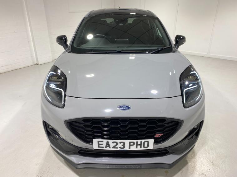 2023 23 Reg Ford Puma 1.5 EcoBoost (200PS) ST 6spd Manual 5dr. Grey Matter metallic with Ford Performance Part LEATHER/ALCANTARA interior, Front and Rear Parking Sensors, 19 inch alloy wheels, ST BODY KIT with LARGE REAR SPOILER, SYNC 3 DAB SATELLITE NAVIGATION, B&O sound system, LED headlights, selectable drive modes- Normal, Eco, Sport, Slippery & Trail, drivers & passenger seat lumbar & heights adjust, FORD MEGABOX EXTENDED BOOT SPACE, EATC AIR CON, KEYLESS entry and start with FORD power start button, PRIVACY GLASS, power folding door mirrors, Drivers Assistance features to include traffic sign recognition, auto high beam & driver alert, auto light and rain sensing wipers, centre console with arm rest, tyre pressure monitoring system, Thatcham alarm, NCAP Pack (lane-keeping alert & lane-keeping aid, speed limiter, rear seat belt minder, rear centre head restraint & auto-headlamps), front fog lamps with cornering lights, heated front screen, remote central locking, electric front windows, ESP, Hill start assist, trip computer, ambient lighting, 17, 948 miles (EA 23 PHO).