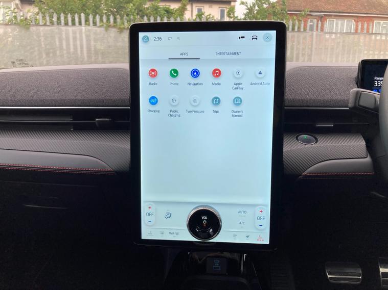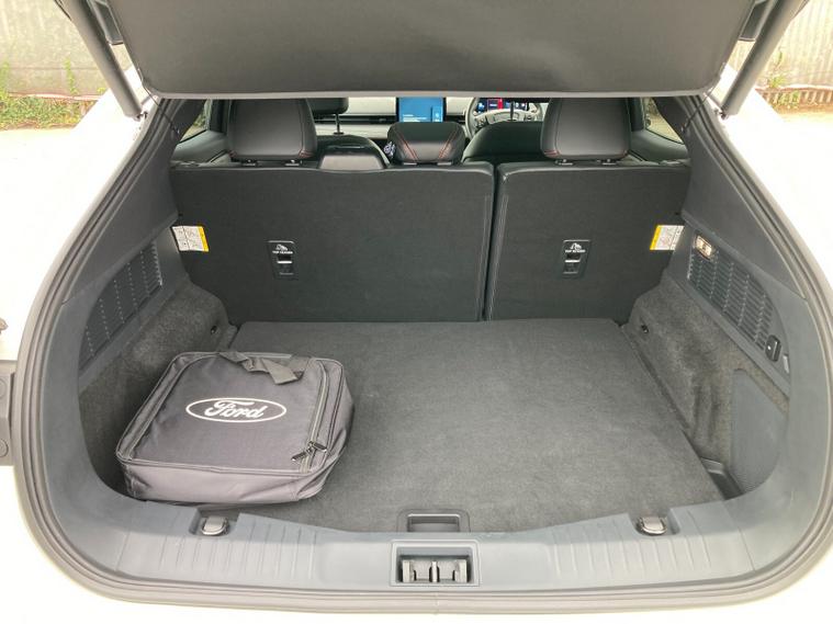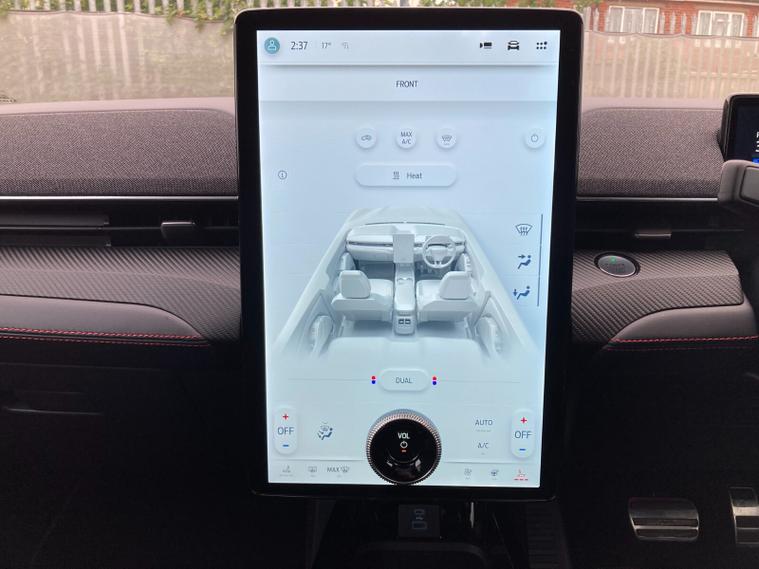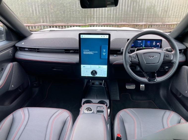 Inside, full Sensico upholstery with red stitching is paired with heated front seats, heated steering wheel, panoramic roof and dual-zone climate control. Tech highlights include a 10.2-inch digital driver cluster, 15.5-inch central touchscreen with SYNC connected navigation, natural voice recognition and FordPass Connect. Wireless charging, a premium 10-speaker B&O audio system and a front trunk add convenience.