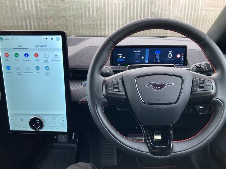 Design features include adaptive LED Mustang signature headlights, LED tail lamps, 19-inch black machined alloys, red brake calipers, privacy glass, Quickclear heated windscreen, Mustang logo puddle lamps, and E-Latch keyless entry with B-pillar keypad. Selectable drive modes (Active, Whisper, Untamed) and one-pedal driving ensure every journey feels unique.