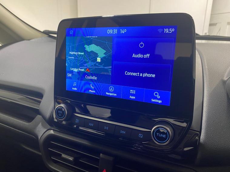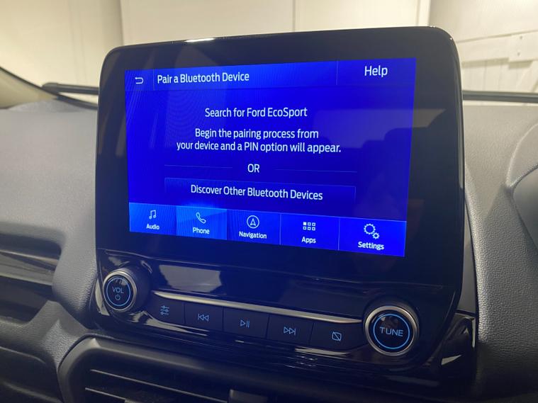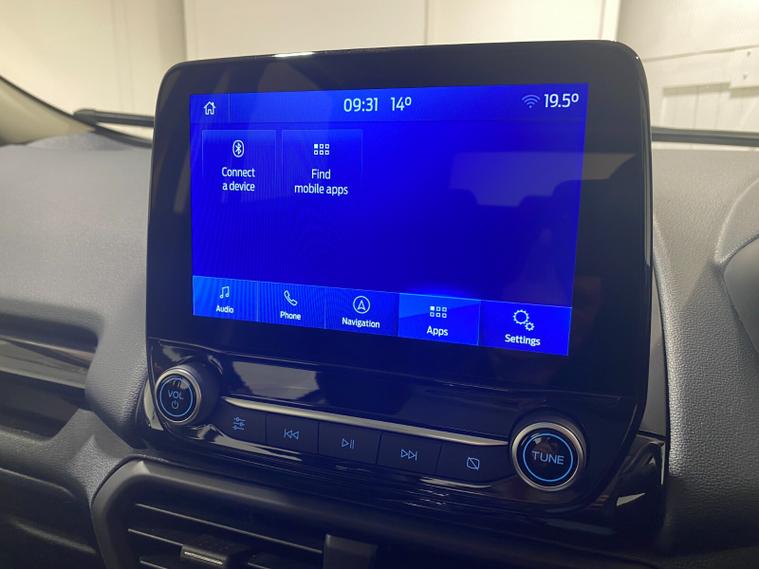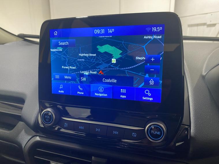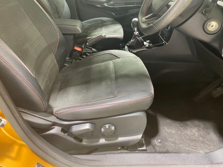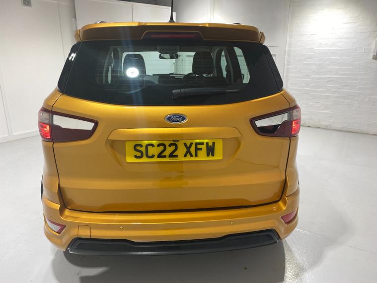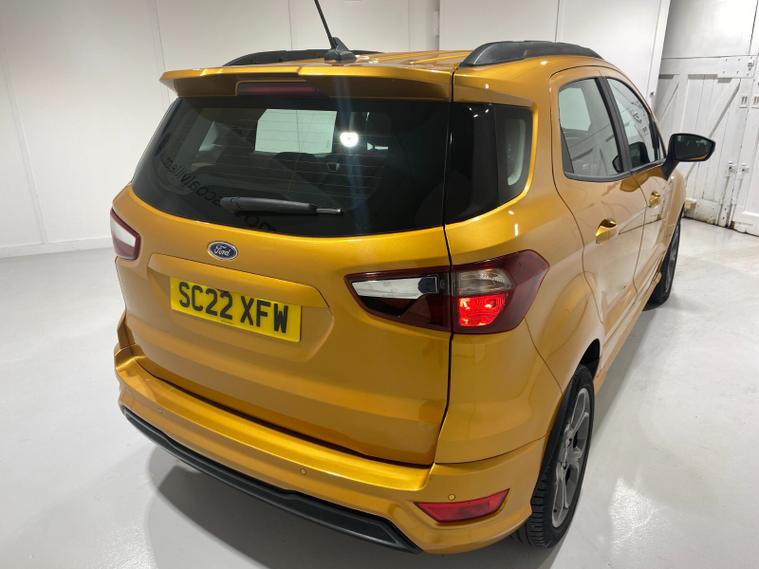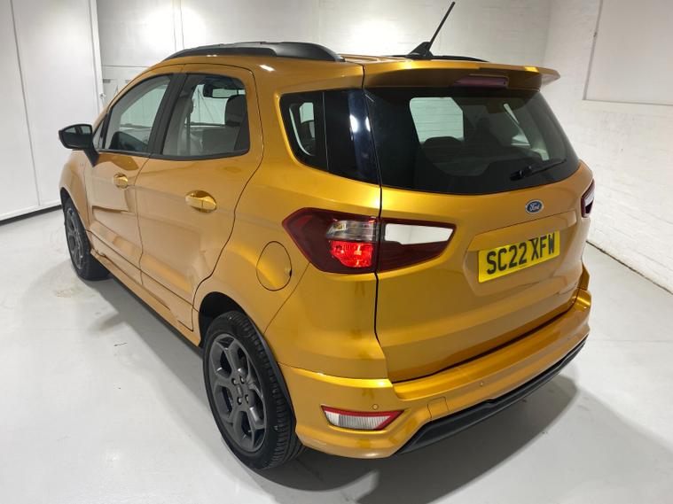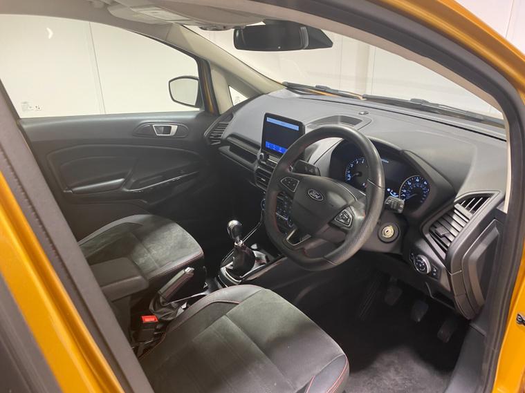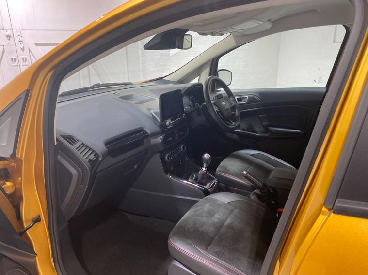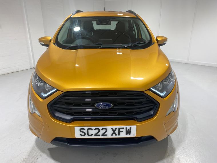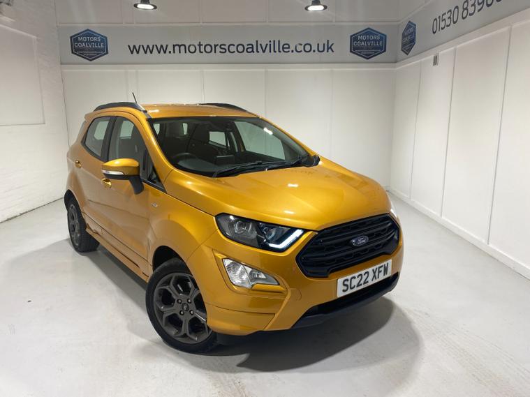 2022 22 Reg EcoSport 1.0 Turbo Ecoboost (125PS) 6 spd ST-LINE 5dr. Luxe Yellow metallic, Ebony part LEATHER interior, WINTER PACK with HEATED FRONT SEATS and HEATED STEERING WHEEL, SYNC 3 DAB SATELLITE NAVIGATION with 8 inch touch screen with REAR VIEW CAMERA, REAR PARKING SENSORS, Bluetooth USB, Apple CarPlay, Android Auto, 17 inch alloys, tyre pressure monitoring system, Thatcham alarm, front fog lamps with cornering lights, heated front screen, remote central locking, electric front windows, ESP, Hill start assist, trip computer, ambient lighting, 24, 640 miles (SC 22 XFW).