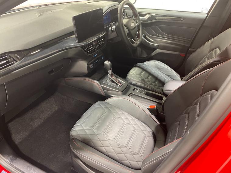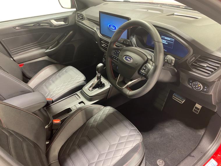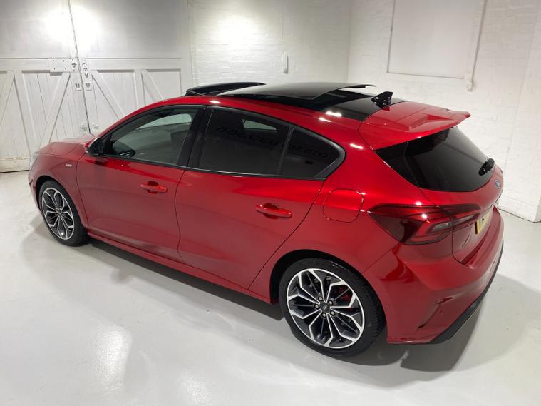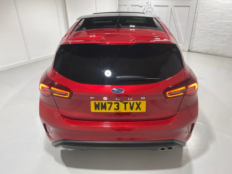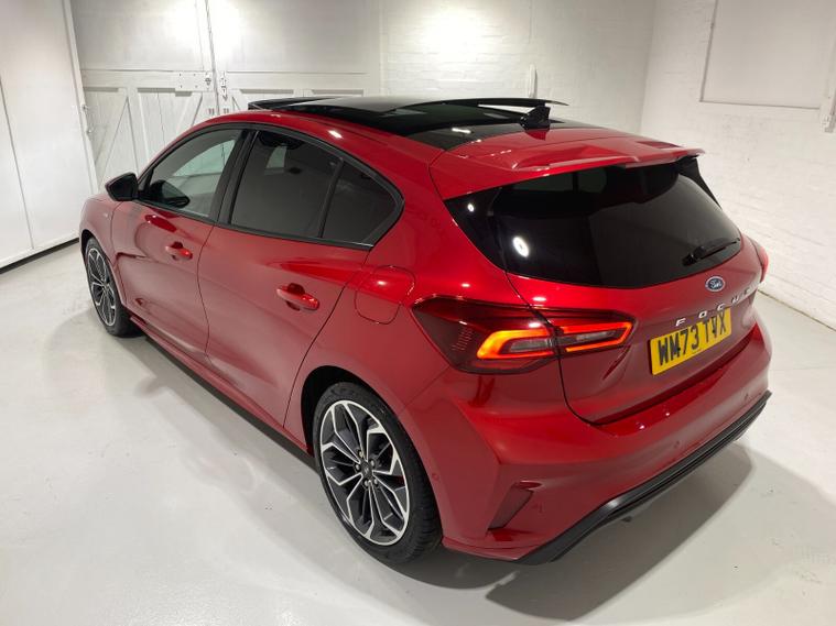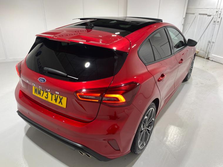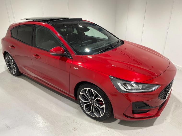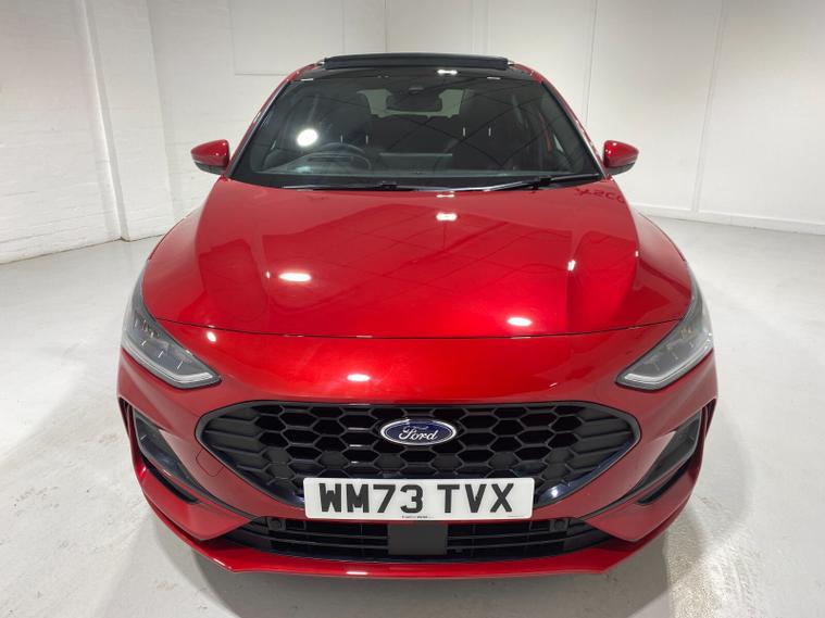 2023 73 Reg Ford Focus 1.0 EcoBoost mHEV (155PS) 8 spd Automatic ST LINE X 5dr***HIGH SPEC***. Fantastic Red metallic with Ebony full Premium Sensico interior, ELECTRICALLY OPENING PANORAMIC ROOF with blind, HEAD UP DISPLAY, PARKING PACK with ACTIVE PARK ASSIST featuring PERPENDICULAR/PARALELL and PARK OUT ASSIST, DOOR EDGE PROTECTORS and REAR VIEW CAMERA, DRIVER ASSISTANCE PACK with TRAFFIC SIGN RECOGNITION, AUTO HIGH BEAM and ADAPTIVE CRUISE CONTROL featuring lane-centring assist, and stop/go function, B&O PREMIUM AUDIO SYSTEM, HEATED STEERING WHEEL, LED HEADLIGHTS, HEATED FRONT SEATS, drivers 4-way electric seat adjust, SYNC 4 TOUCHSCREEN SATELLITE NAVIGATION, Bluetooth USB, Apple CarPlay and Android Auto, wireless charge pad, 18 inch alloy wheels, FRONT and REAR PARKING SENSORS, PRIVACY GLASS, POWER FOLDING DOOR MIRRORS with puddle lights, wireless charging, DEATC AIR CON, lane keeping aid with lane keeping alert, electric park brake with auto hold, auto lights, wipers & auto dimming rear view mirror, electrically operated, heated and power folding mirrors, cruise control with speed limiter, rear spoiler, power start button, hill start, trip computer, ESP, quickclear heated front screen, Thatcham Cat 1 alarm, 1, 453 miles (WM 73 TVX).