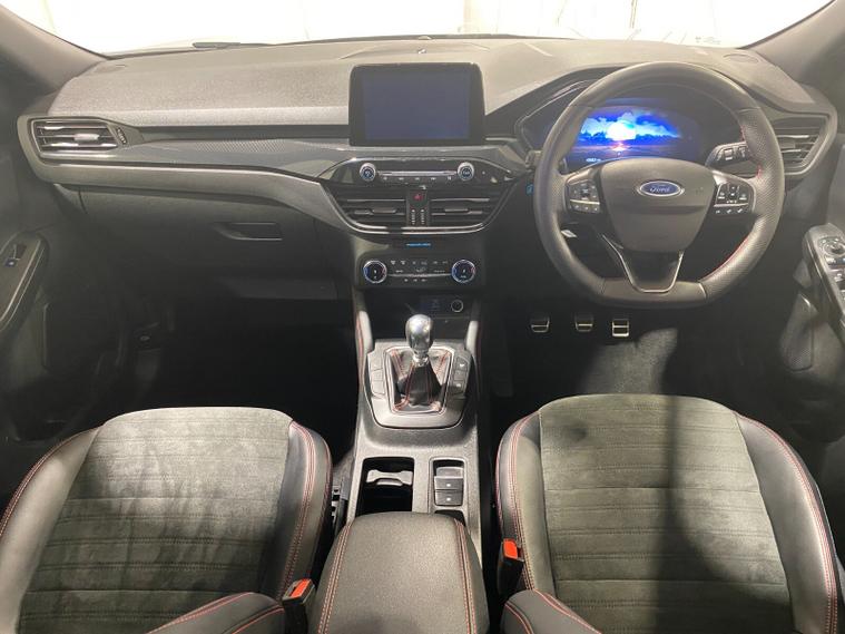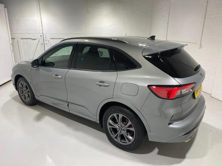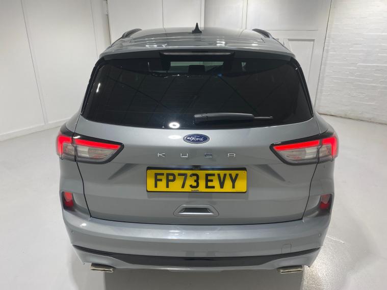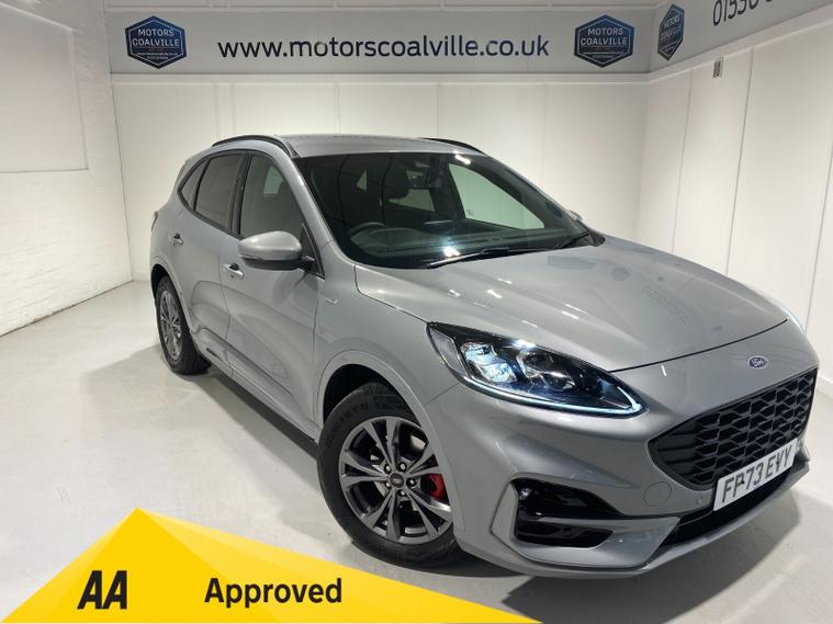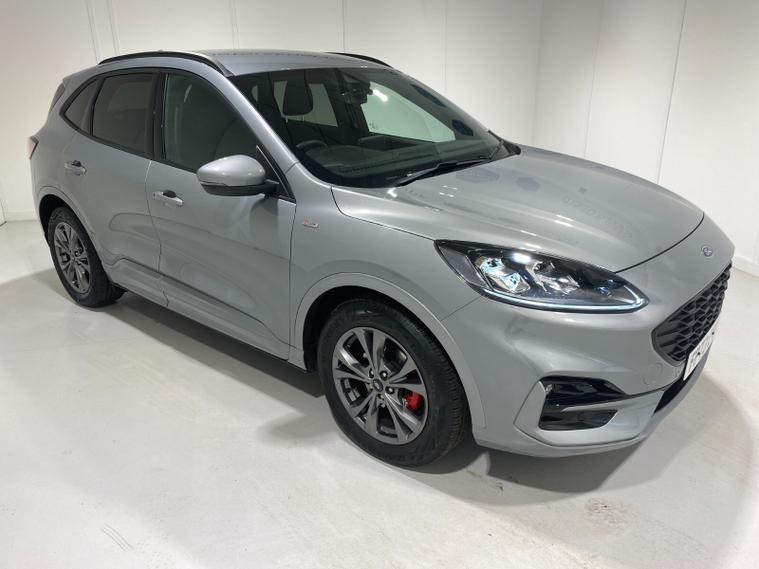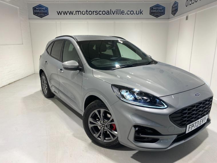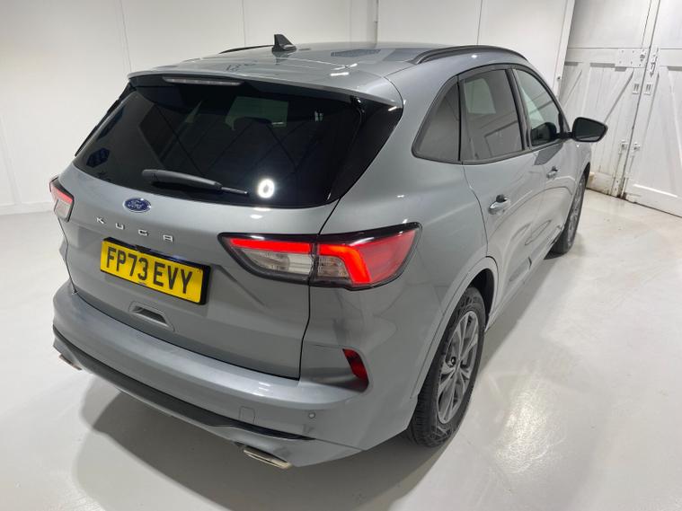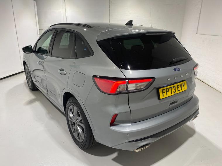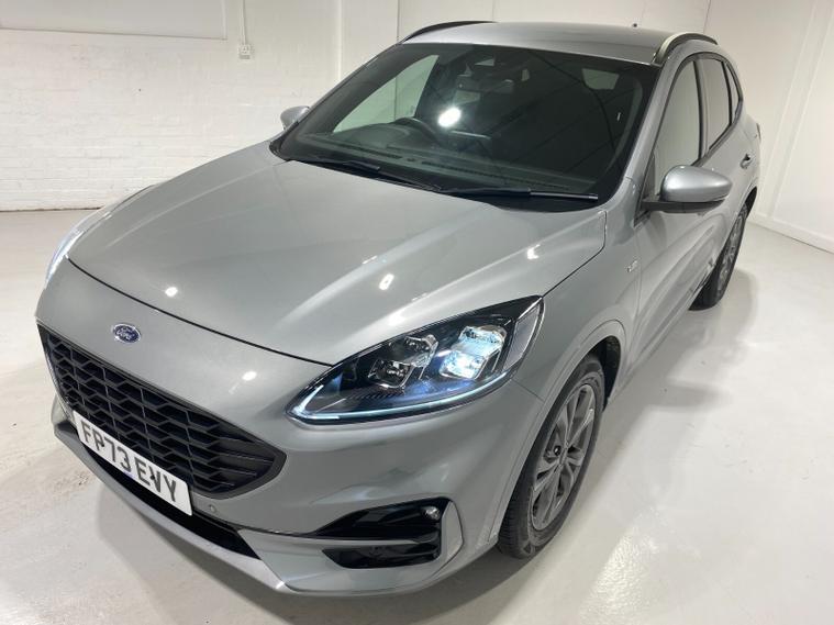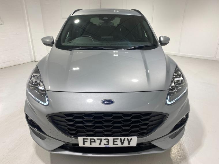 2023 73 Reg Ford Kuga 1.5T Turbo Ecoboost (150PS) 6 spd ST-LINE EDITION 5dr. Solar Silver with Part Sensico interior, SYNC3 TOUCHSCREEN DAB NAVIGATION, 18 inch grey alloy wheels, Apple CarPlay and Android Auto, BLUETOOTH USB, cruise control, front and rear electric windows, DUAL ZONE CLIMATE CONTROL, auto lights, rain sensing wipers, electrically operated, heated and POWER FOLDING mirrors, FRONT and REAR PARKING SENSORS, keyless entry and push button start, quickclear heated front windscreen, privacy glass, LED daytime running lights, ESP, Hill start assist, trip computer, ambient lighting, 4, 538 miles (FP 73 EVY).