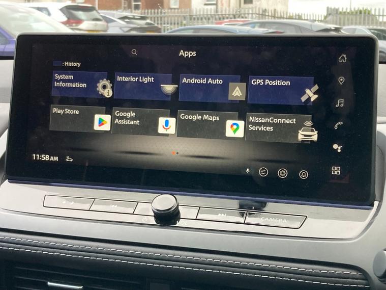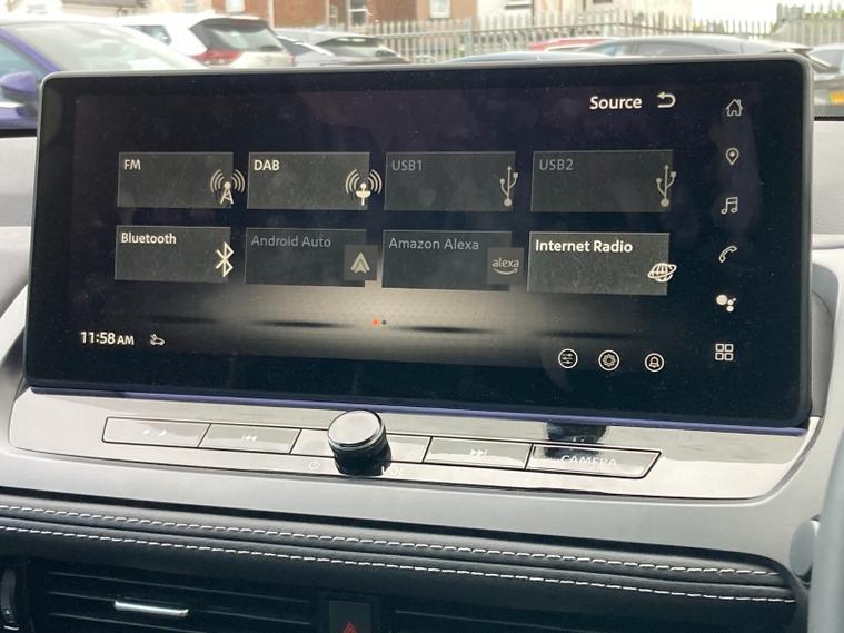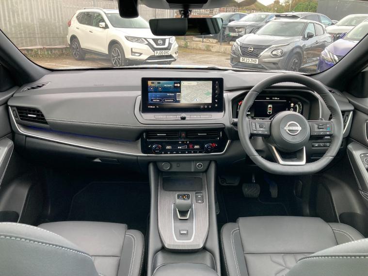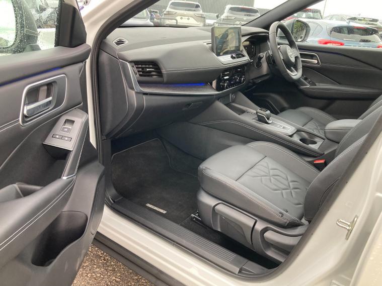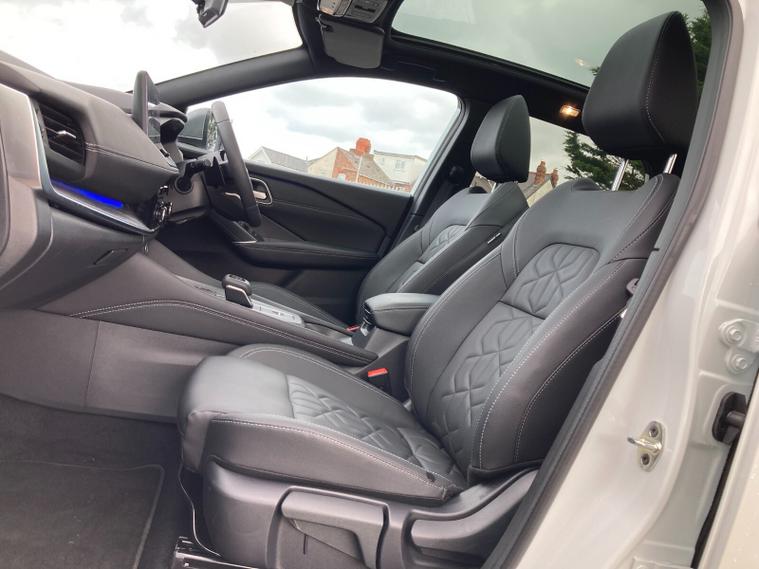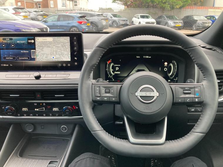 Step inside and you’re met with quilted upholstery, heated front seats, a heated steering wheel, dual-zone climate control, and a panoramic glass roof with electric sunshade. A 12.3" NissanConnect touchscreen with Google Maps, wireless Apple CarPlay/Android Auto, Bluetooth, DAB radio, wireless charging, and a premium 12.3" digital driver display provide seamless connectivity. Added convenience comes from a head-up display, hands-free power tailgate, and intelligent key with walk-away lock.