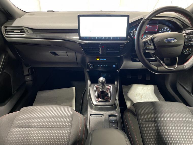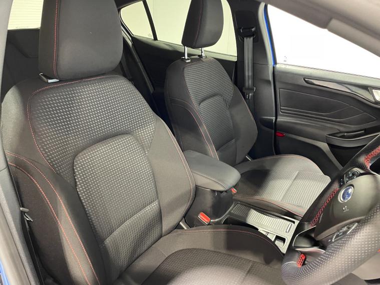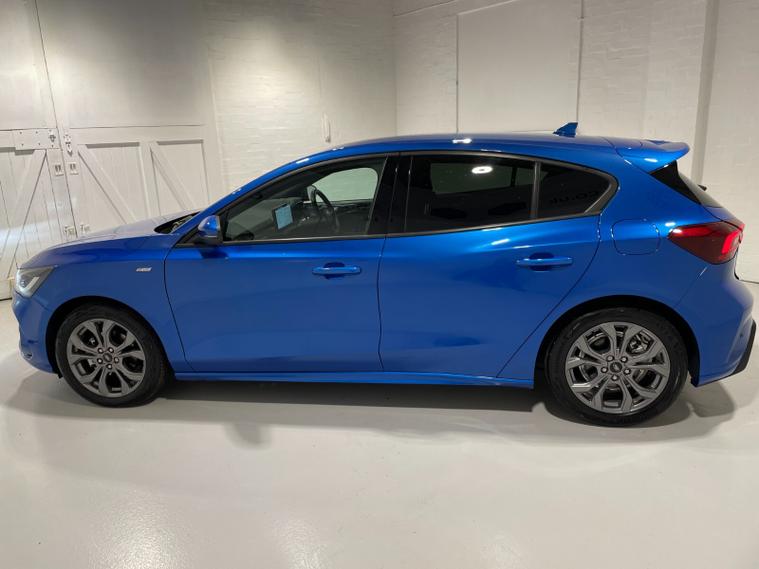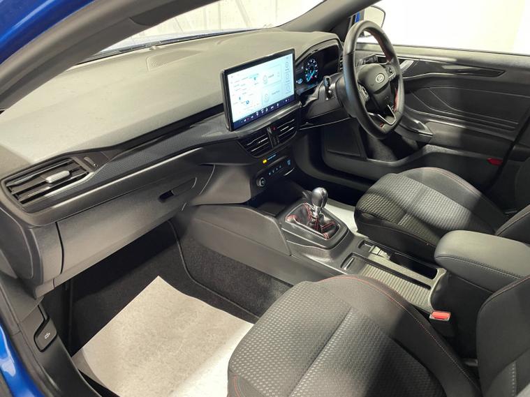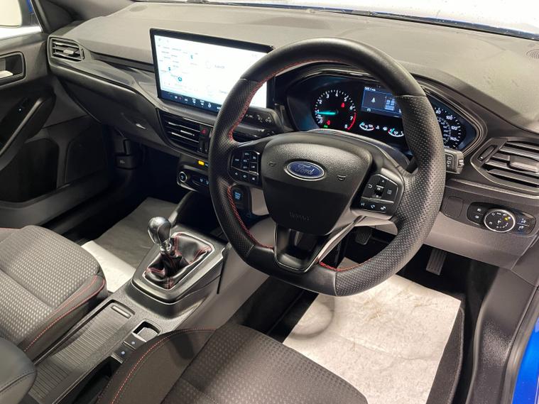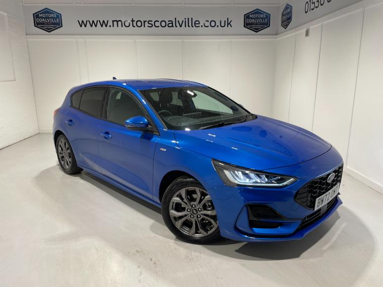 2023 72 Reg Ford Focus 1.0 EcoBoost (125PS) 6 spd ST-LINE 5dr**LOW MILES**. Desert Island Blue metallic with Ebony cloth interior, SYNC 4 TOUCHSCREEN SATELLITE NAVIGATION, Bluetooth USB, Apple CarPlay and Android Auto, 17 inch alloy wheels, FRONT and REAR PARKING SENSORS, PRIVACY GLASS, DEATC AIR CON, lane keeping aid with lane keeping alert, electric park brake with auto hold, auto lights, wipers & auto dimming rear view mirror, electrically operated and heated mirrors, cruise control with speed limiter, rear spoiler, power start button, hill start, trip computer, ESP, quickclear heated front screen, Thatcham Cat 1 alarm, ONLY 569 miles (BW 72 OMT).