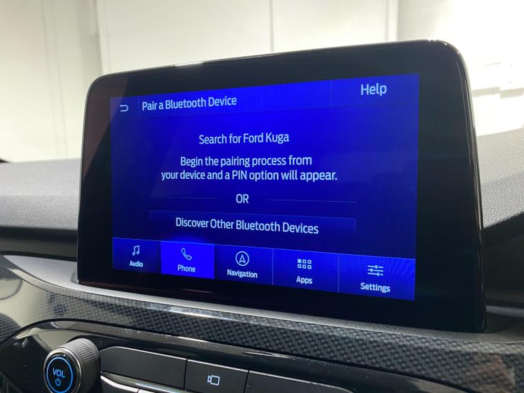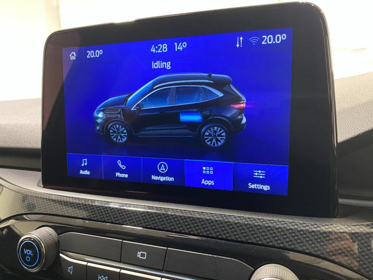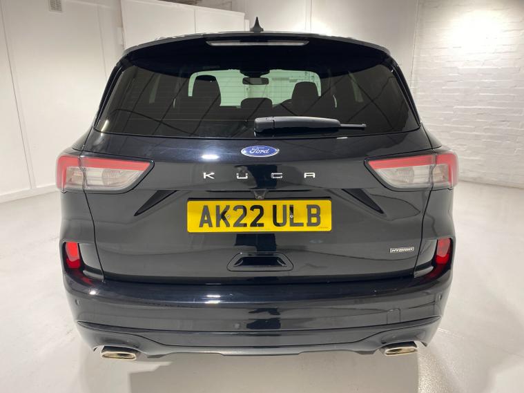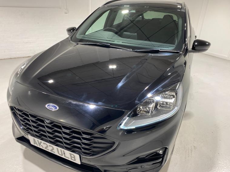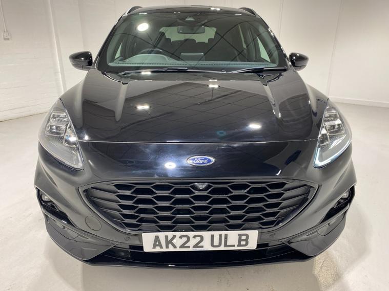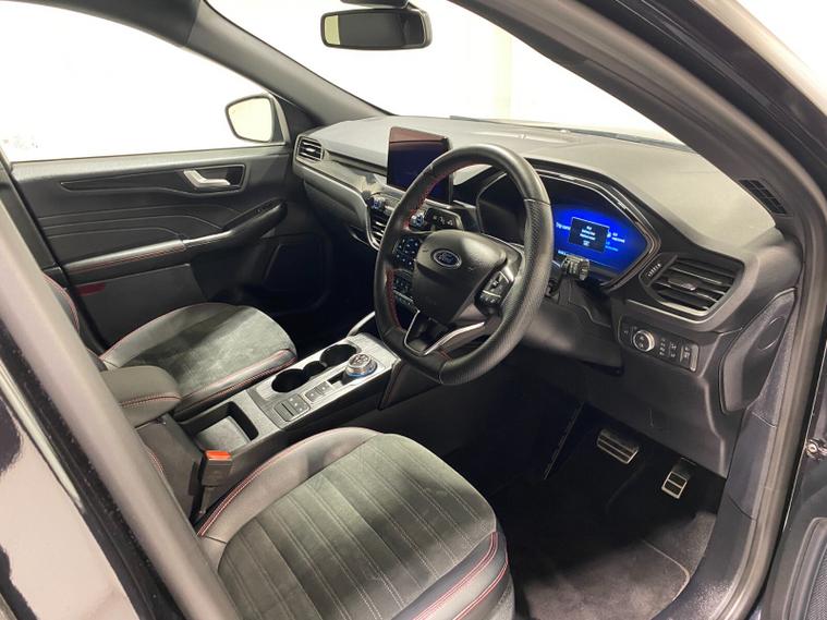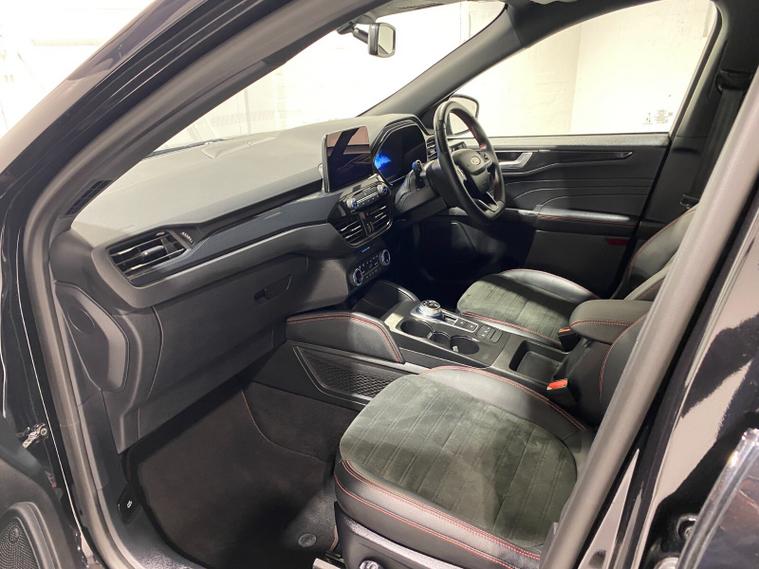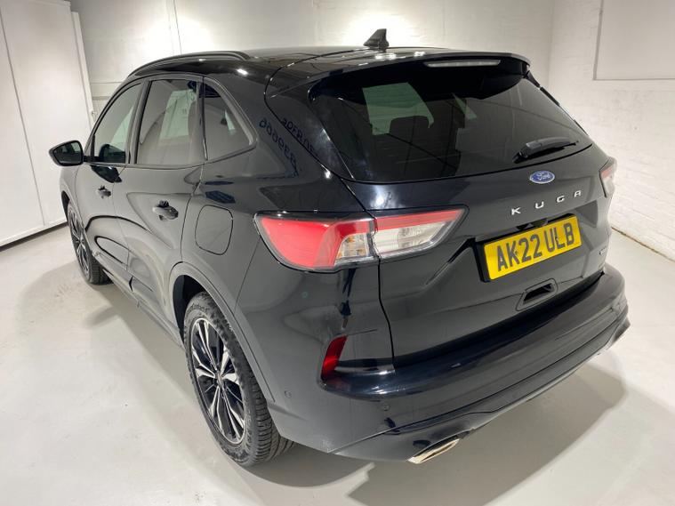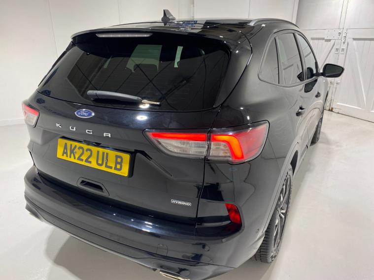 2022 22 Reg Ford Kuga 2.5 FHEV (190PS) Automatic ST LINE EDITION 5dr. Agate Black metallic with Part Sensico interior, WINTER PACK with HEATED FRONT and REAR SEATS and HEATED STEERING WHEEL, DRIVER ASSISTANCE PACK with ADAPTIVE CRUISE CONTROL, TRAFFIC SIGN RECOGNITION, BLIND SPOT INFORMATION with PARK OUT ASSIST, DOOR EDGE GUARDS, ACTIVE PARK ASSIST and FRONT AND REAR CAMERA, SYNC3 TOUCHSCREEN DAB NAVIGATION, HEATED SEATS, HANDSFREE ELECTRIC TAILGATE, 19” machined alloy wheels, Apple CarPlay and Android Auto, BLUETOOTH USB, front and rear electric windows, DUAL ZONE CLIMATE CONTROL, auto lights, rain sensing wipers, electrically operated, heated and POWER FOLDING mirrors, keyless entry and push button start, quickclear heated front windscreen, privacy glass, LED daytime running lights, ESP, Hill start assist, trip computer, ambient lighting, 15, 924 miles (AK 22 ULB).