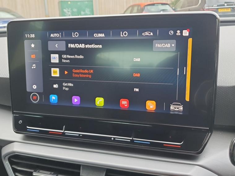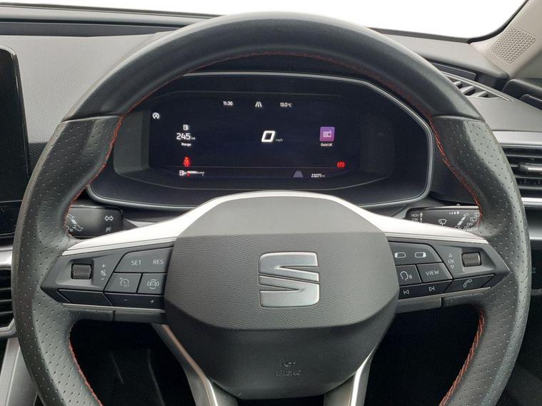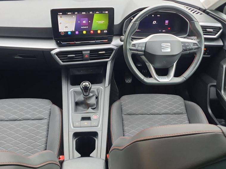 - Flat bottomed perforated leather steering wheel with red stitching and FR logo and leather gear stick