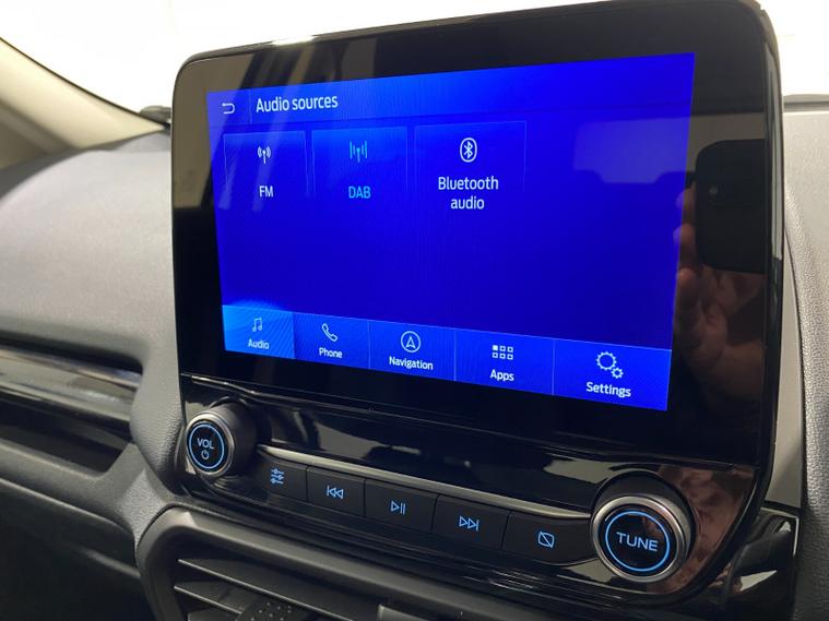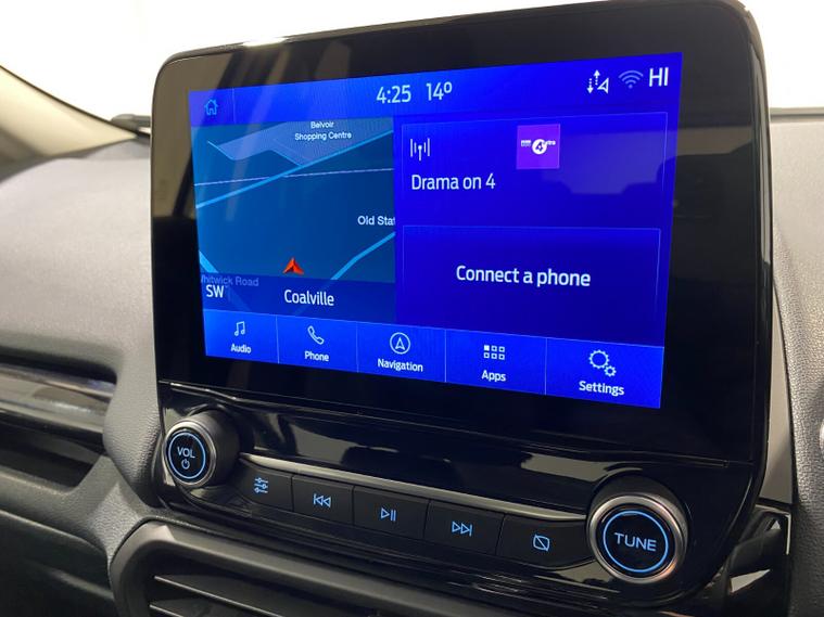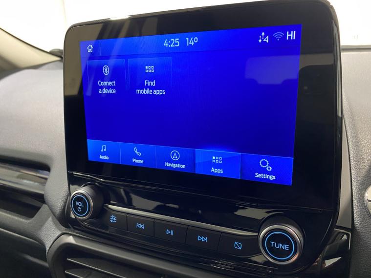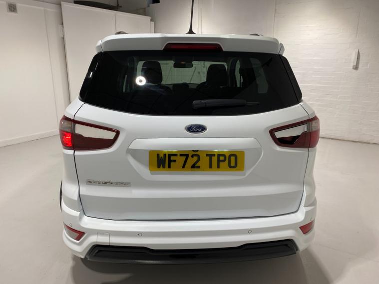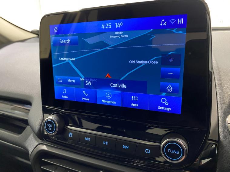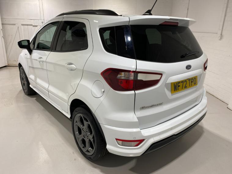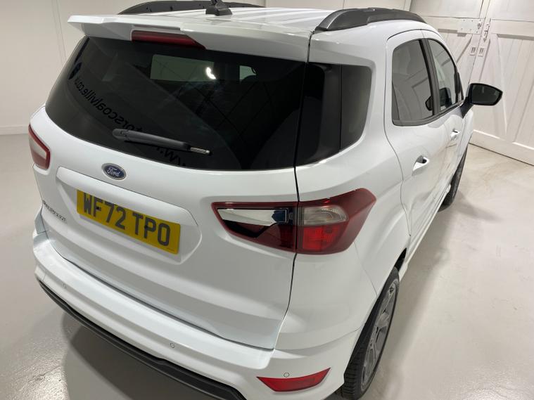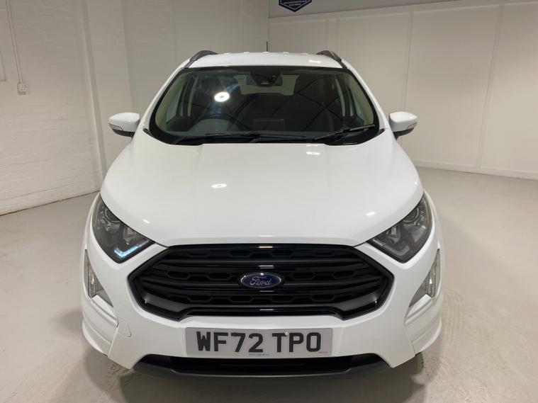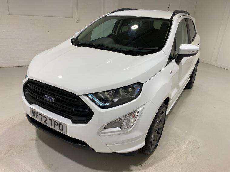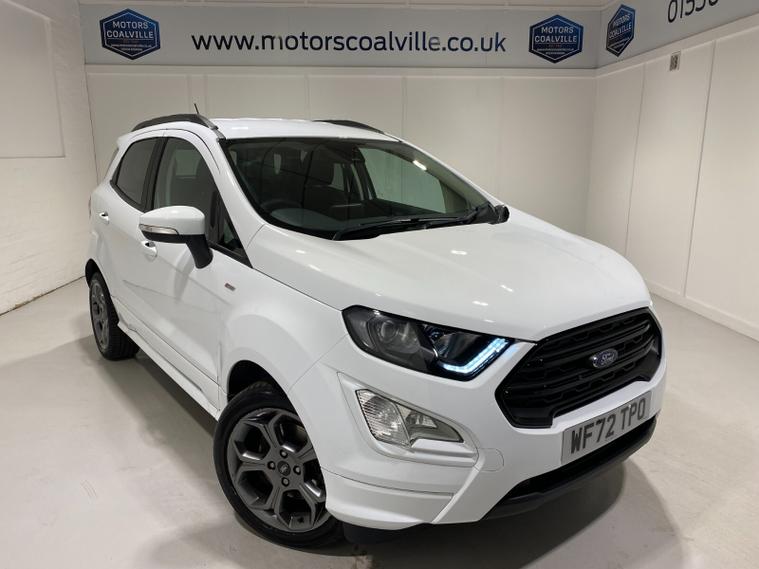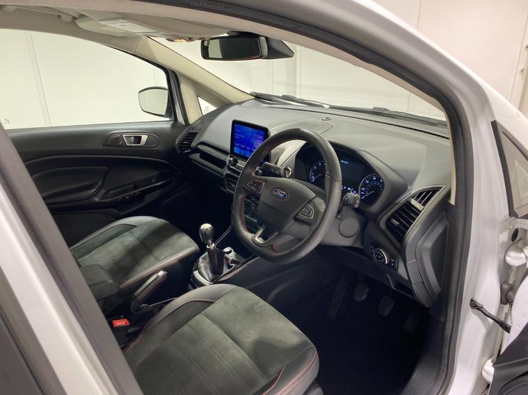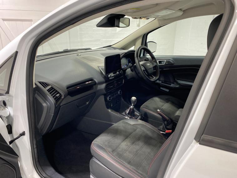 2022 72 Reg EcoSport 1.0 Turbo Ecoboost (140PS) 6 spd ST-LINE 5dr. Frozen White with Ebony part LEATHER interior, X-PACK SYNC3 with B&O premium sound system with subwoofer, PRIVACY GLASS and KEYLESS ENTRY, WINTER Pack HEATED STEERING WHEEL & HEATED FRONT SEATS, SATELLITE NAVIGATION with 8 inch touch screen with REAR VIEW CAMERA, REAR PARKING SENSORS, Bluetooth USB, Apple CarPlay, Android Auto, 17 inch alloys, tyre pressure monitoring system, Thatcham alarm, front fog lamps with cornering lights, heated front screen, remote central locking, electric front windows, ESP, Hill start assist, trip computer, ambient lighting, 35, 892 miles (WF 72 TPO).