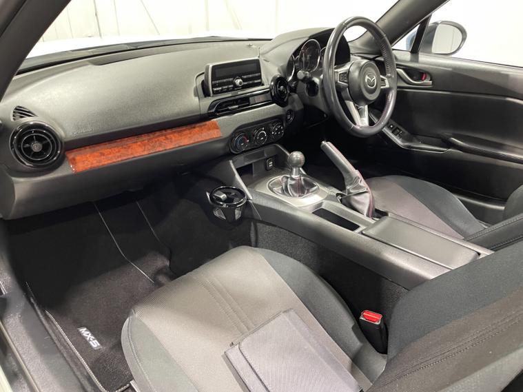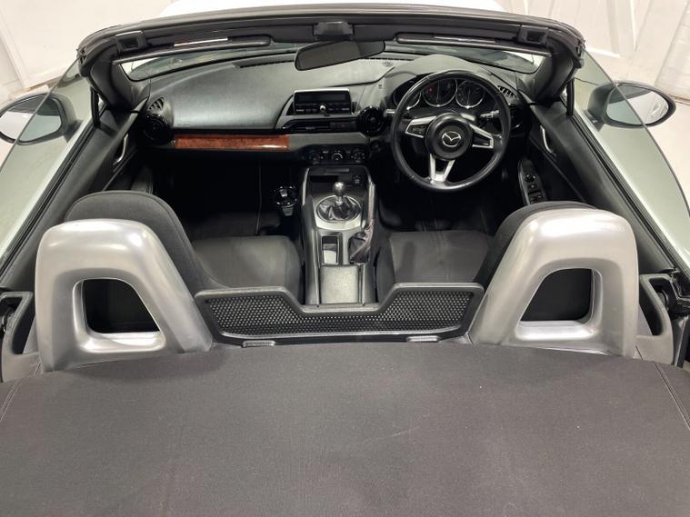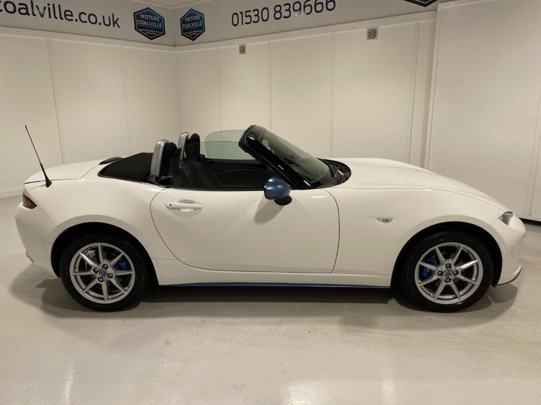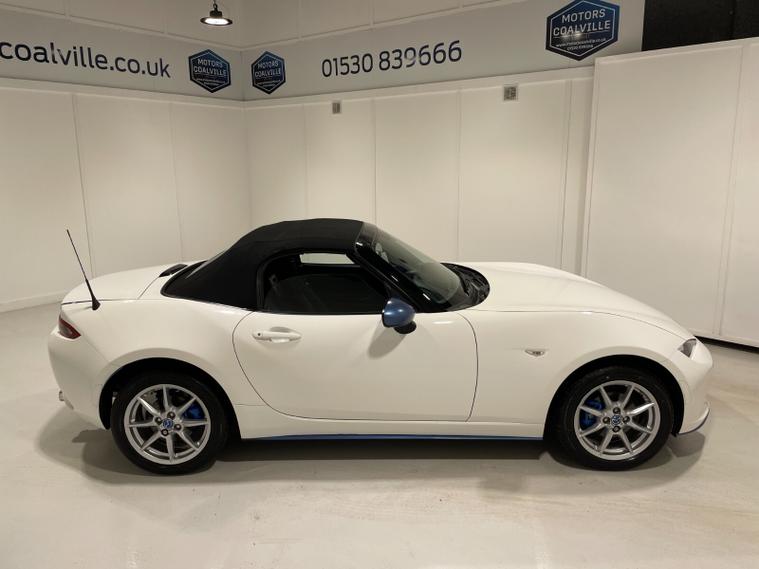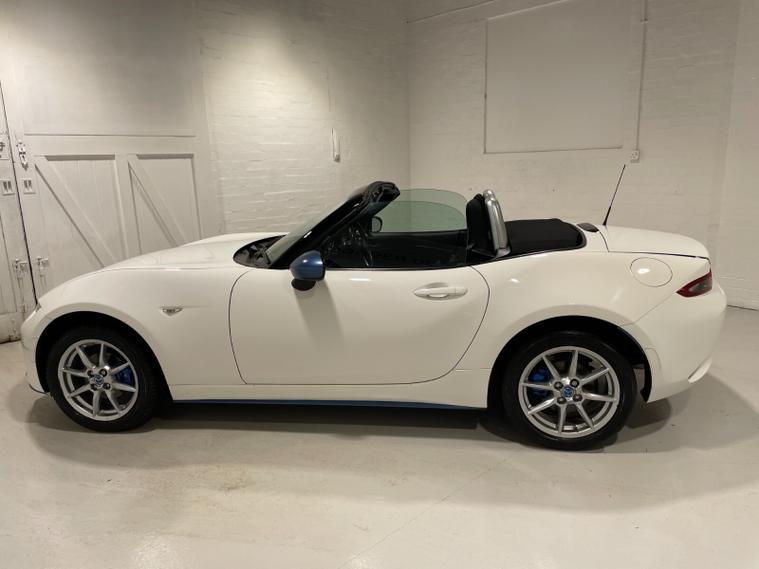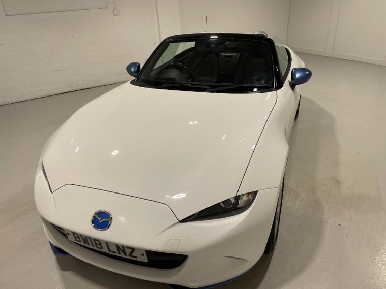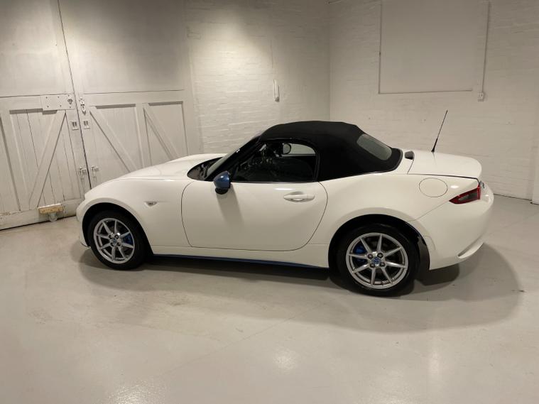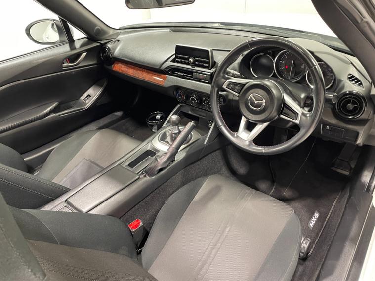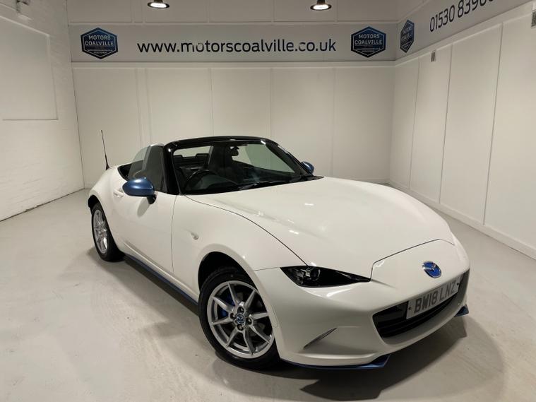 2018 18 Reg Mazda MX-5 1.5 SKYACTIV-G (131PS) 6 spd SE 2dr Convertible. Arctic White, Black cloth, AIR CON, Bluetooth USB, 16 inch alloys, LED headlights, wind blocker, power electric heated door mirrors, auto wipers, hill hold assist, tyre pressure monitoring, ESC, ABS, Alarm, 31, 594 miles (BW 18 LNZ).