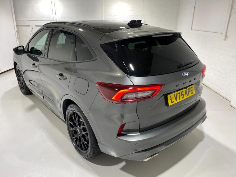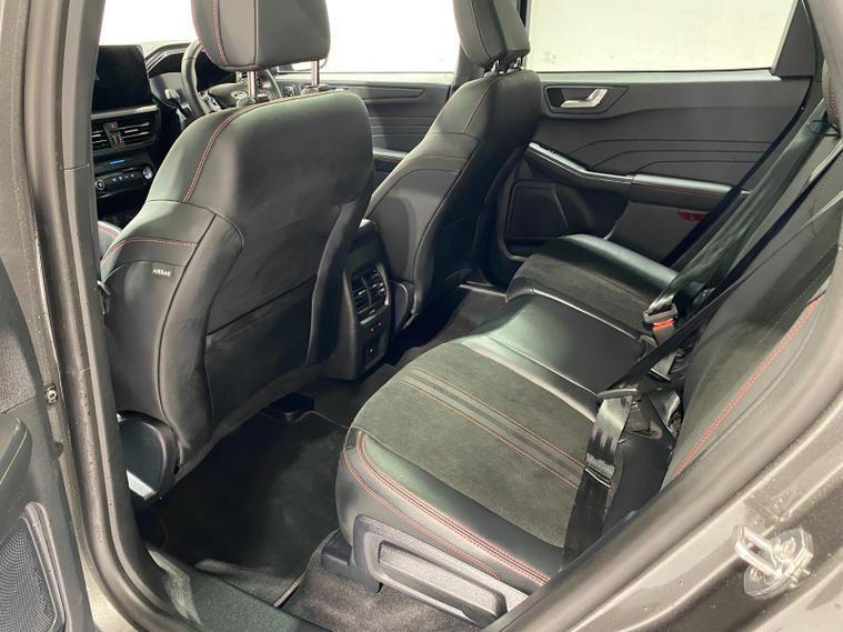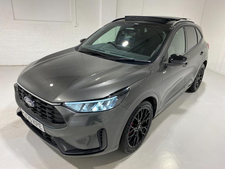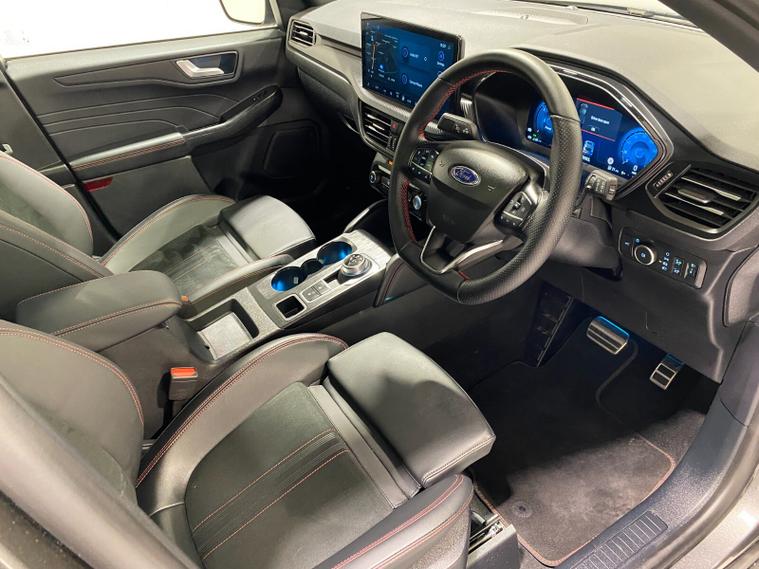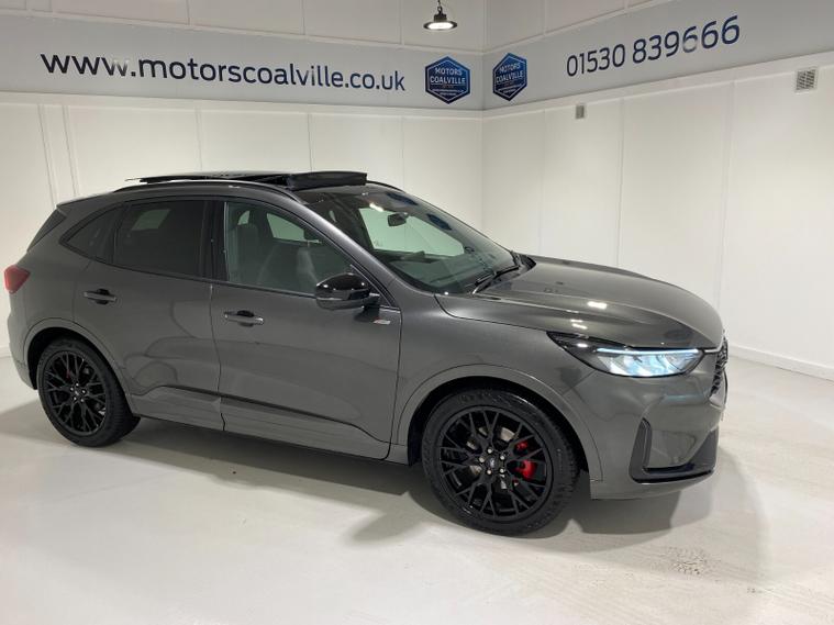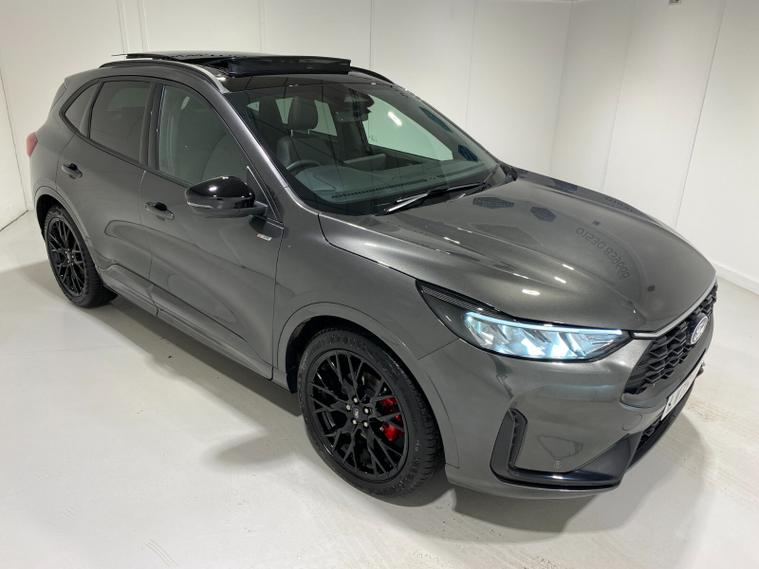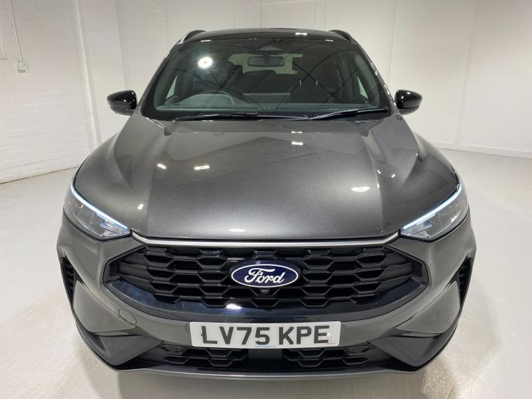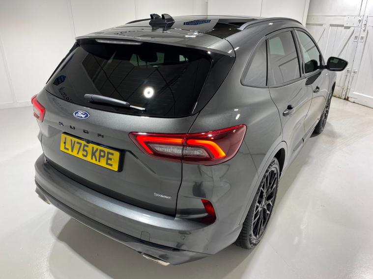 2025 75 Reg Ford Kuga 2.5 FHEV (180PS) AUTOMATIC ST-Line X BLACK PACKAGE 5dr. Magnetic Grey metallic with Part Sensico interior, 20 inch BLACK PERFORMANCE alloy wheels, BLACK PAINTED BUMPER ACCENTS and MIRROR CAPS, POWER OPENING PANORAMIC ROOF, FRONT and REAR HEATED SEATS, HEATED STEERING WHEEL, drivers and passengers 12-way Ergonomic power adjustable seats with memory function, ADAPTIVE CRUISE CONTROL, BLIND SPOT INFORMATION, DOOR EDGE GUARDS, SYNC4 13 inch DAB TOUCHSCREEN NAVIGATION with B&O Premium Audio, Apple Car Play, Android Auto, 360 degree camera with front and rear parking sensors, HANDS FREE ELECTRIC TAILGATE, red brake calipers, BLUETOOTH USB, front and rear electric windows, full LED headlamps, LED rear lights, EATC AIR CON, auto lights, rain sensing wipers, electrically operated, heated and POWER FOLDING mirrors with puddle lights, memory function and camera, cross traffic alert when reversing, lane keeping aid with lane-departure warning, lane centring assist, keyless entry and push button start, quickclear heated front windscreen, privacy glass, LED daytime running lights, ESP, Hill start assist, trip computer, ambient lighting, 2, 503 miles (LV 75 KPE).