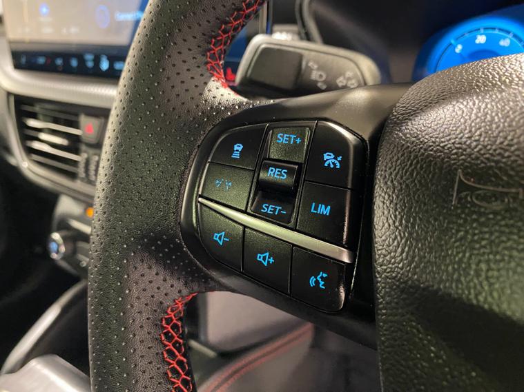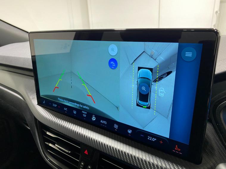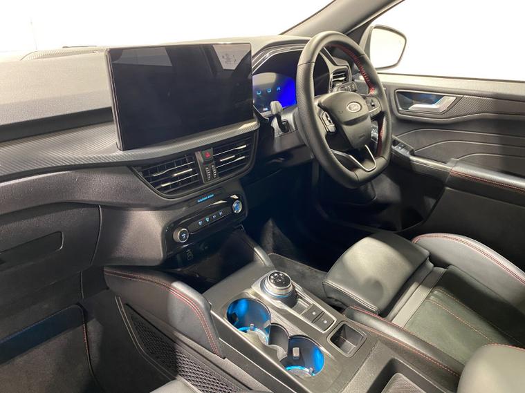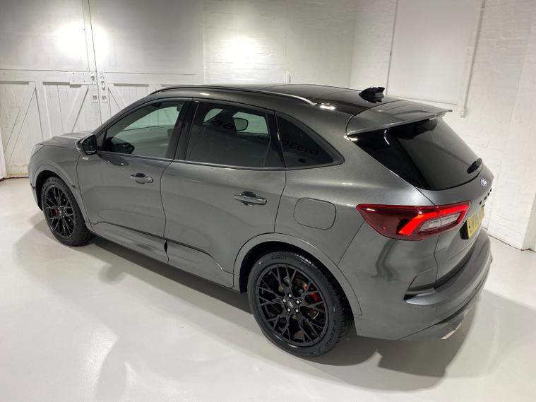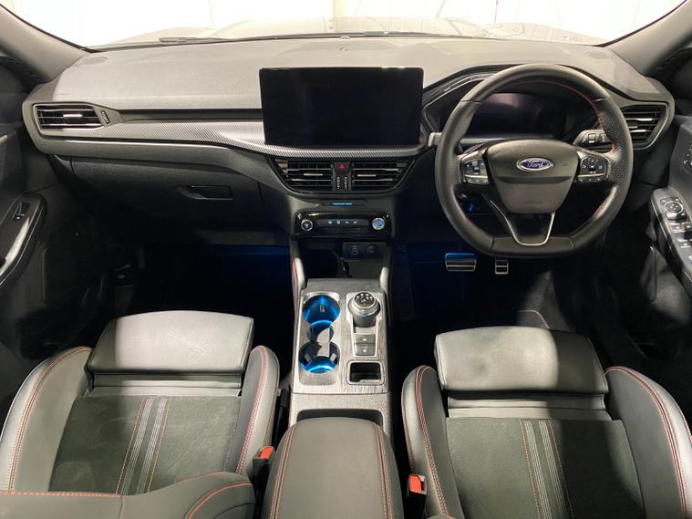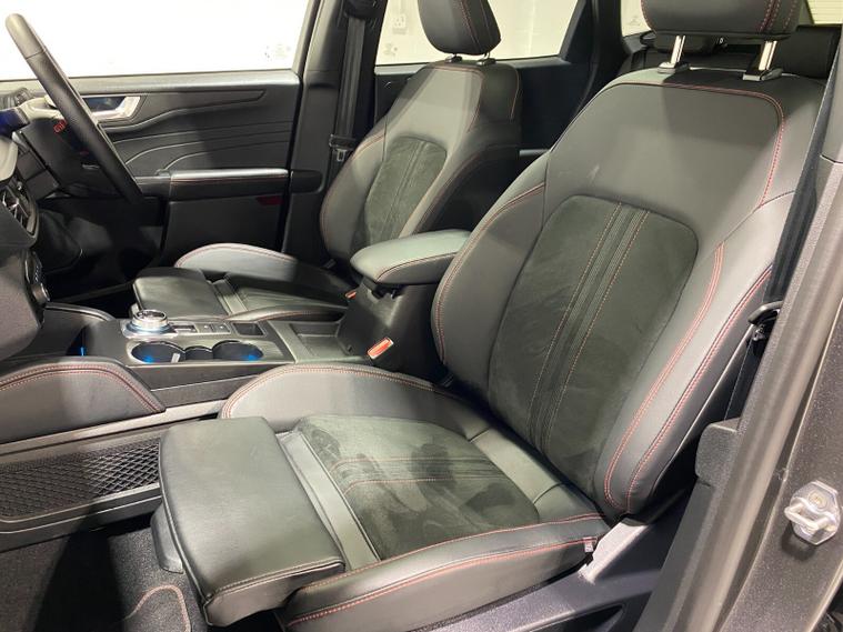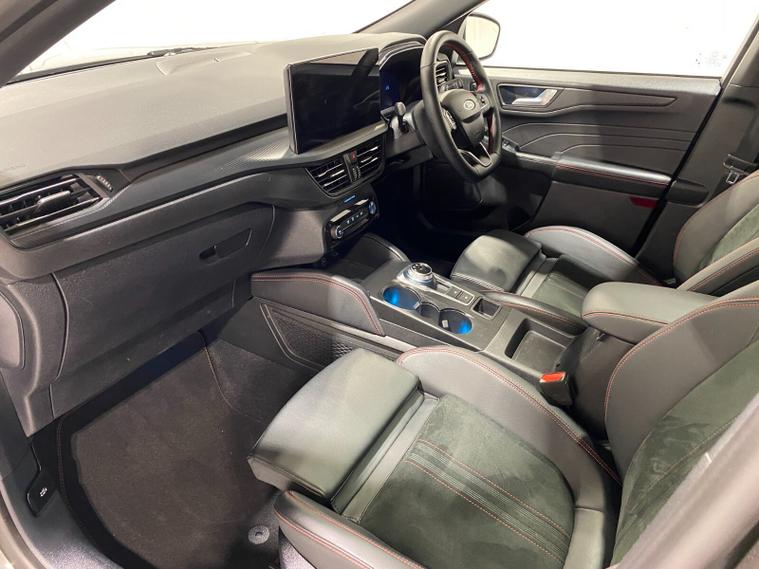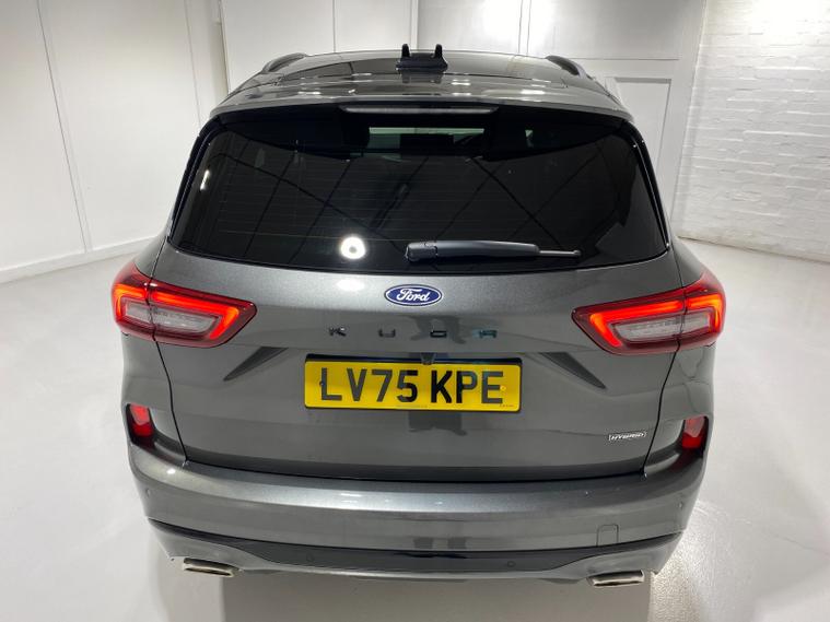 2025 75 Reg Ford Kuga 2.5 FHEV (180PS) AUTOMATIC ST-Line X BLACK PACKAGE 5dr. Magnetic Grey metallic with Part Sensico interior, 20 inch BLACK PERFORMANCE alloy wheels, BLACK PAINTED BUMPER ACCENTS and MIRROR CAPS, POWER OPENING PANORAMIC ROOF, FRONT and REAR HEATED SEATS, HEATED STEERING WHEEL, drivers and passengers 12-way Ergonomic power adjustable seats with memory function, ADAPTIVE CRUISE CONTROL, BLIND SPOT INFORMATION, DOOR EDGE GUARDS, SYNC4 13 inch DAB TOUCHSCREEN NAVIGATION with B&O Premium Audio, Apple Car Play, Android Auto, 360 degree camera with front and rear parking sensors, HANDS FREE ELECTRIC TAILGATE, red brake calipers, BLUETOOTH USB, front and rear electric windows, full LED headlamps, LED rear lights, EATC AIR CON, auto lights, rain sensing wipers, electrically operated, heated and POWER FOLDING mirrors with puddle lights, memory function and camera, cross traffic alert when reversing, lane keeping aid with lane-departure warning, lane centring assist, keyless entry and push button start, quickclear heated front windscreen, privacy glass, LED daytime running lights, ESP, Hill start assist, trip computer, ambient lighting, 2, 503 miles (LV 75 KPE).