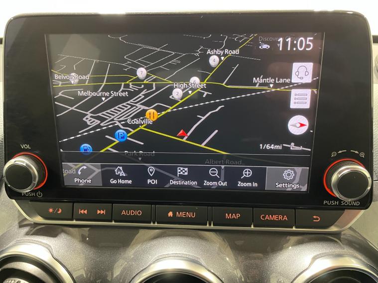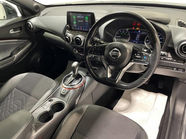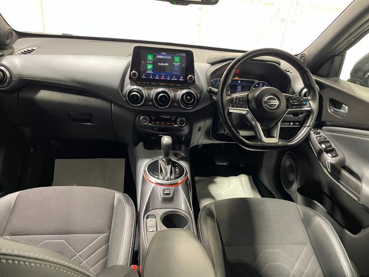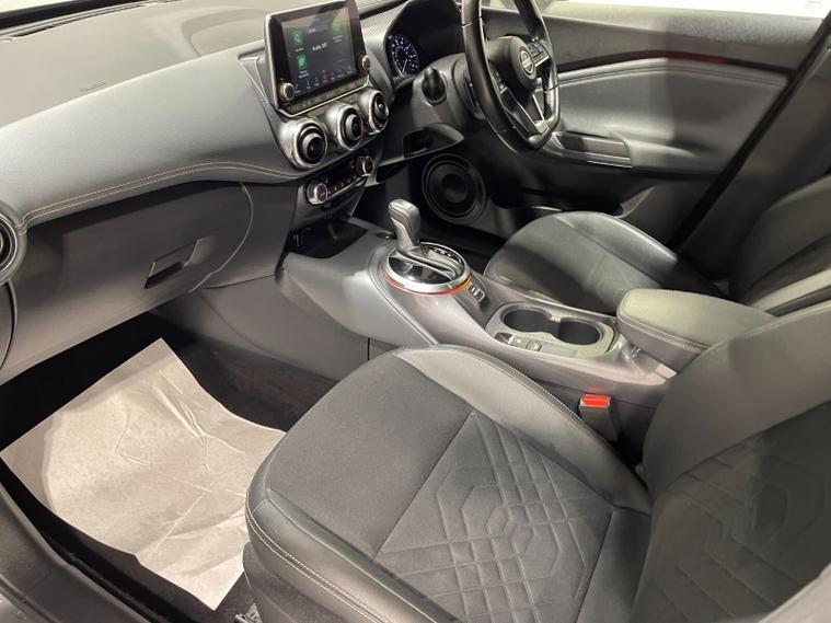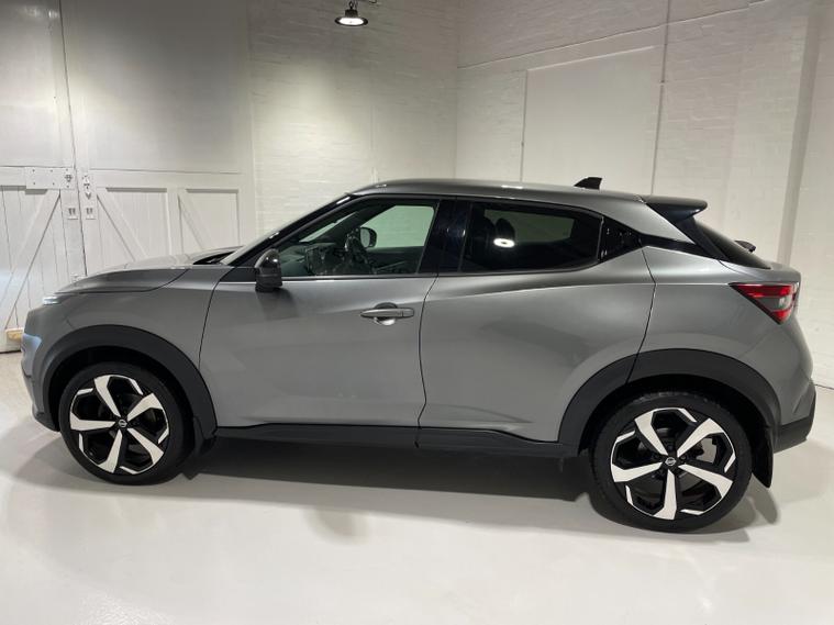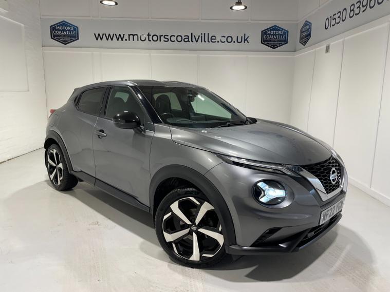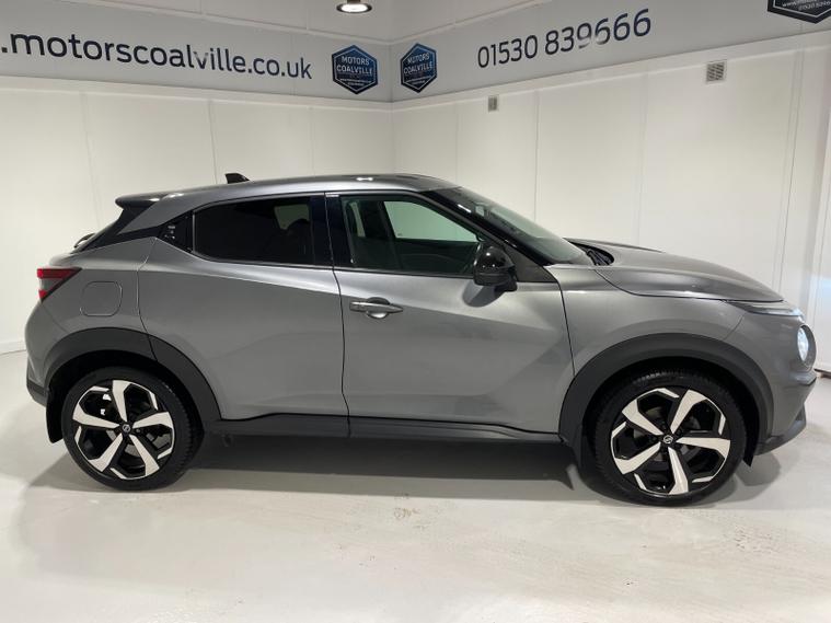 2022 22 Reg Nissan Juke 1.0 DIG-T (114PS) DCT Automatic TEKNA 5dr. Gun metallic with Black PARTIAL LEATHER interior, 19 inch alloy wheels, TOUCHSCREEN SATELLITE NAVIGATION with Bluetooth USB, Apple CarPlay, Android Auto, HEATED FRONT SEATS, BLIND SPOT INFORMATION, LANE KEEPS ASSIST, BOSE personal sound, DAB, CLIMATE CONTROL AIR CON, REAR CAMERA, REAR PARKING SENSORS, LED headlights, high beam assist, auto lights, rain sensing wipers, lane keeping aid, privacy glass, intelligent emergency braking, cruise control, push button start, front and rear electric windows, electrically operated mirrors, hill start assist, tyre pressure monitoring, 8, 861 miles (WF 22 YGM).