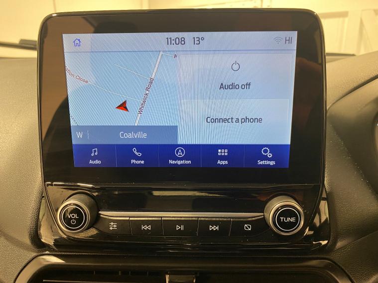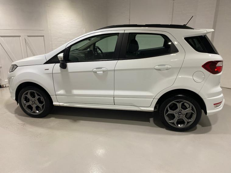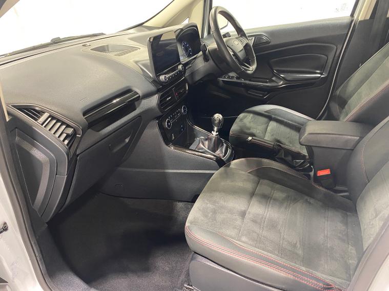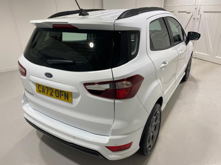 2022 72 Reg EcoSport 1.0 Turbo Ecoboost (125PS) ST-LINE 6spd Manual 5dr. Frozen White with Ebony part LEATHER interior, SYNC 3 DAB SATELLITE NAVIGATION with 8 inch touch screen with REAR VIEW CAMERA, REAR PARKING SENSORS, Bluetooth USB, Apple CarPlay, Android Auto, 17” alloys, tyre pressure monitoring system, Thatcham alarm, front fog lamps with cornering lights, heated front screen, remote central locking, electric front windows, ESP, Hill start assist, trip computer, ambient lighting, 24, 550 miles (CA 72 OFN).
