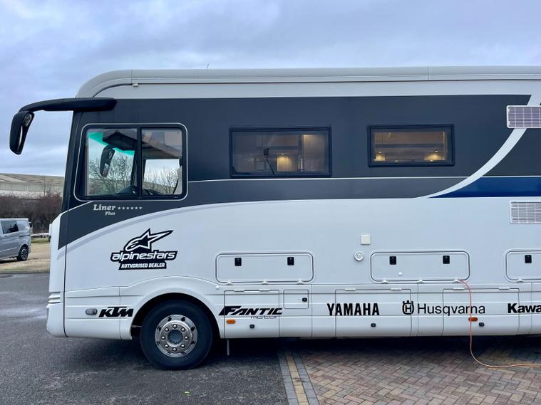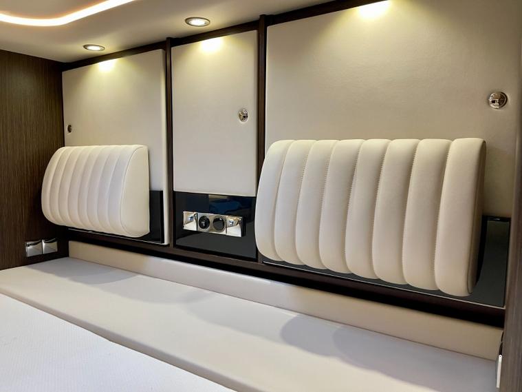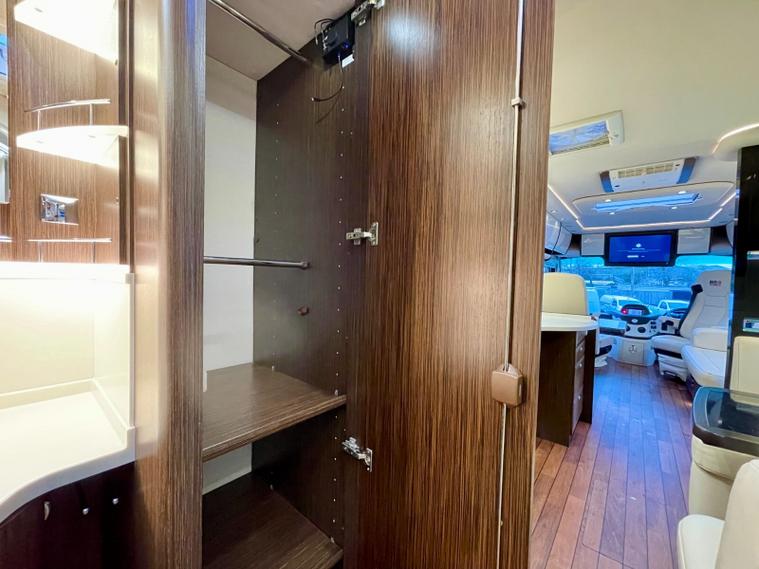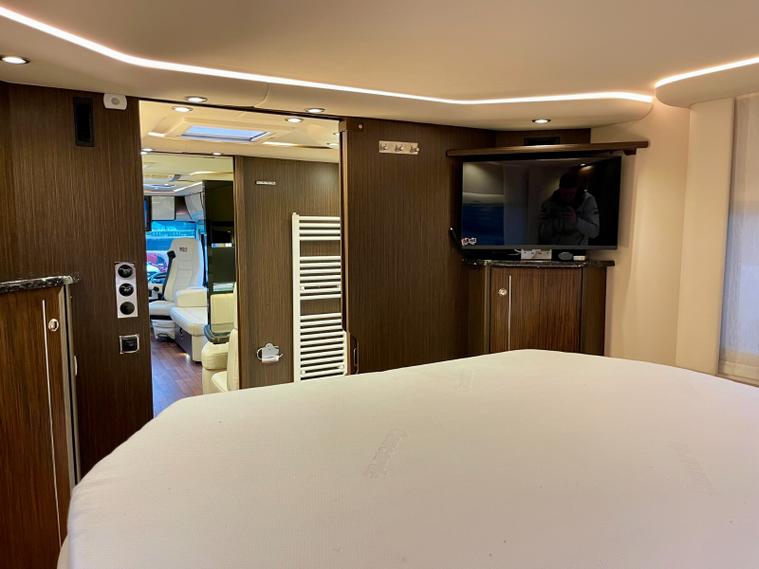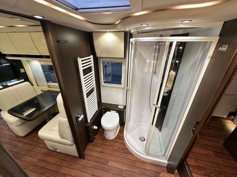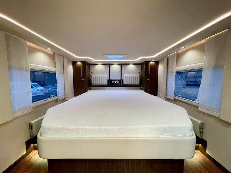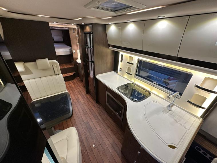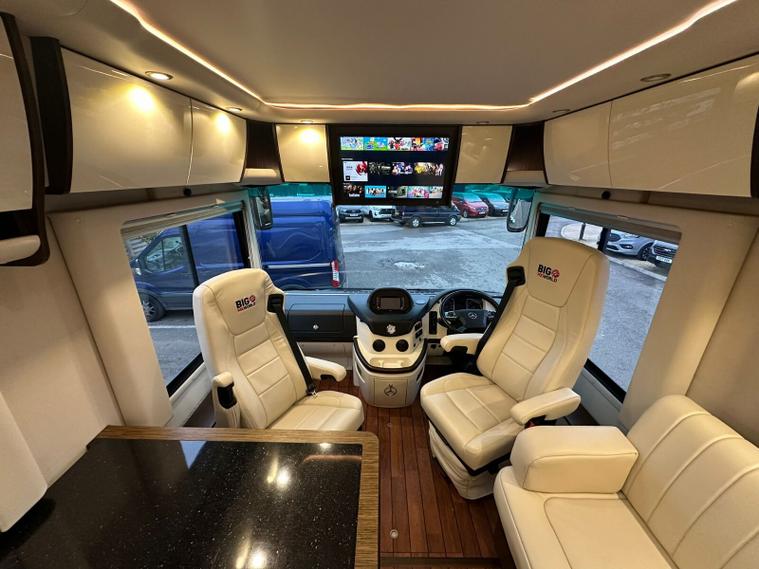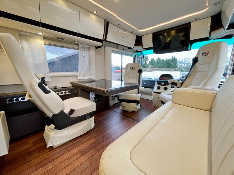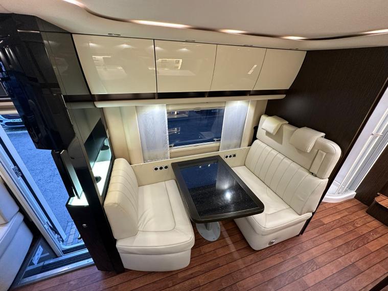 Specification: Mercedes Benz Atego 7.7L 299bhp Diesel engine with the 8 speed automatic gearbox, Full air suspension with auto level air suspension, E&P hydraulic automatic levelling system, Air-Horns, Air adjustable height assist captains chairs, Truma roof mounted Air-Con system, under floor bench air-conditioner, Dometic Twin lens reverse camera system, Navigation system with Bluetooth, Cat 1 alarm system with Cat 5 tracking, Full Jehnert sound system with sub woofer, Teleco 85cm Automatic satellite system with Twin LNB setup to 3 tv's, 32" TV above cab, 24" TV/Sat decoder 12v in both dinette area and rear bedroom area, Sat-Fi Automatic satellite dome system, fixed safe, Full Savanah leather throughout, LED ambient lighting throughout, the interior consists of Wenge wood & cream high gloss furniture, The dinette converts to double bed option if required, spacious kitchen with Corian worktops, built in microwave oven under counter, Tech tower oven/grill, Dometic 190L Auto energy select fridge freezer, Alde central heating, 3 burner gas hob with glass lid, Turbo roof vent over kitchen area, City water connection point, SOG toilet system, Porcelain toilet, 5 built in wardrobes giving ample hanging storage space, 3x New 170ah Gel batteries, Mastervolt mains combi charger/2500 watt pure sinewave inverter system and network voltage compensator with above door digital control display panel, Victron MPPT solar regulator and control, On board 120L Gas tank, External gas BBQ point, space for 1x 13kg & 1x 6kg bottle, Panda onboard Diesel 5000i generator 5000 watt, External shower in rear car garage area, Electronic key pad code entrance lock system, electric fold away step, 2x Thule electric 4m awnings, Car garage with ramps and electric car winch remote controlled.