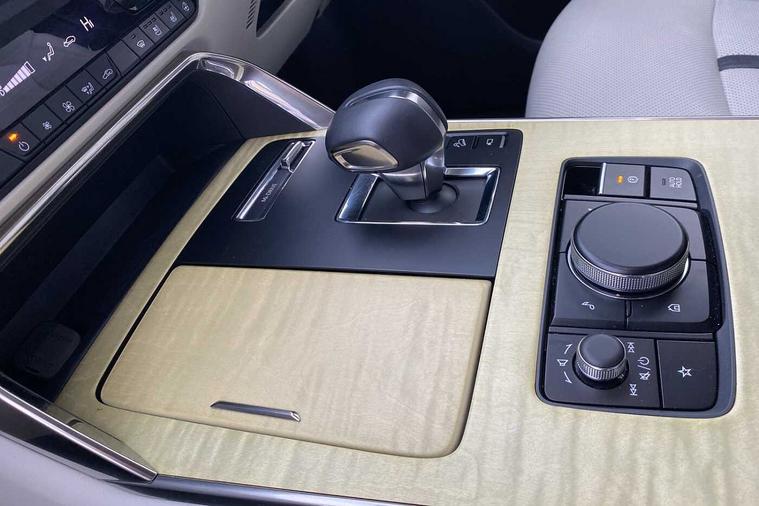 - White woven fabric dashboard with KAKENUI detailed stitching and genuine maple wood accents