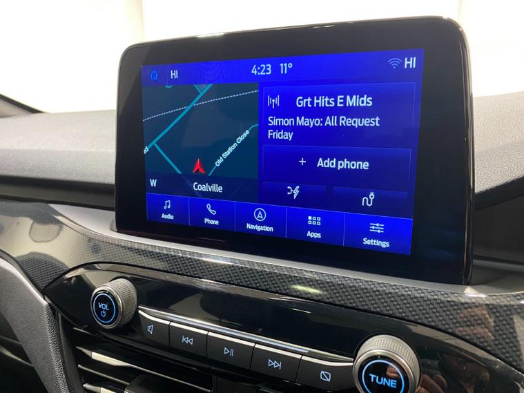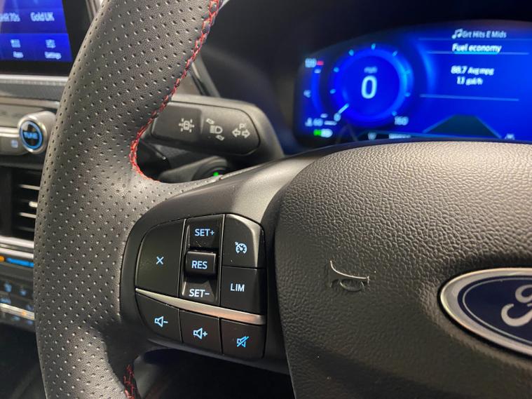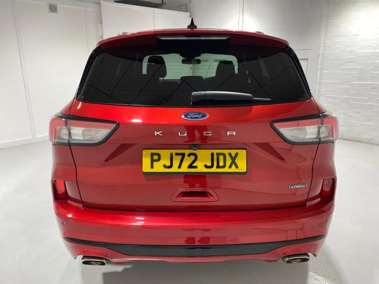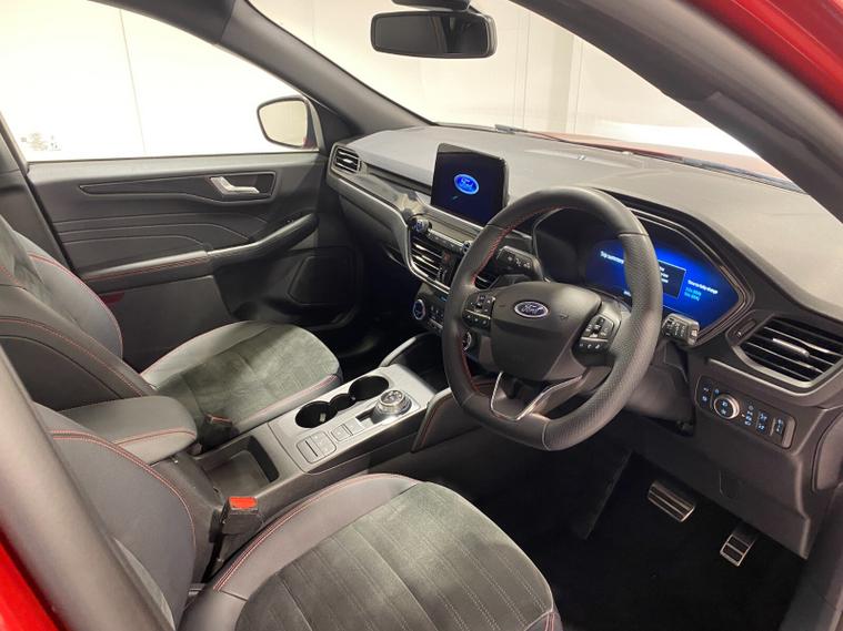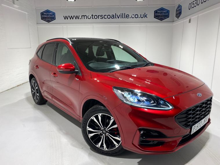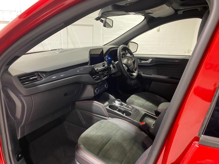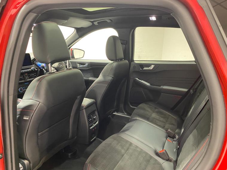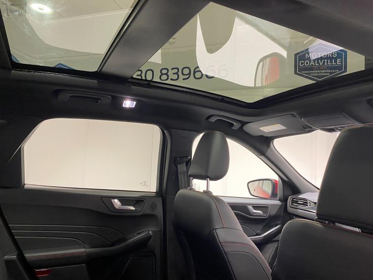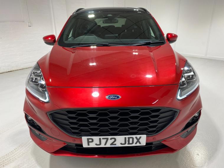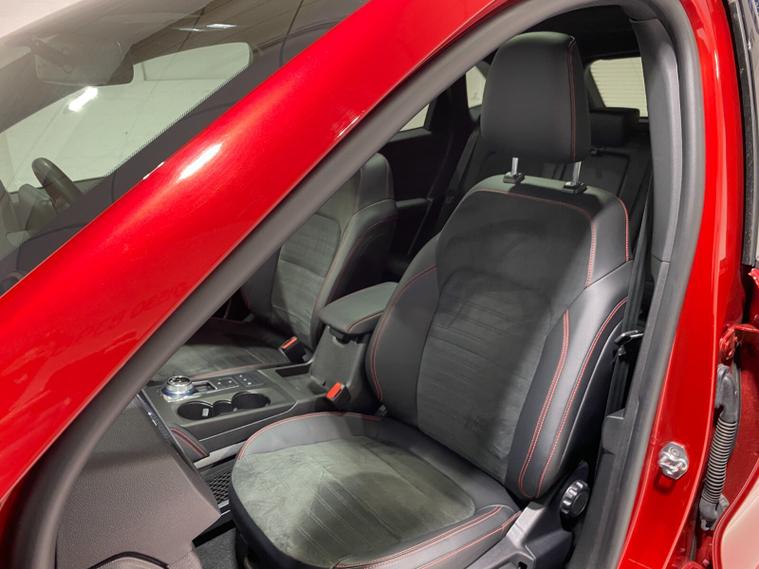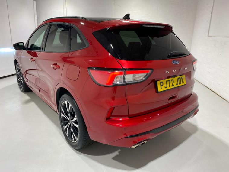 2022 72 Reg Kuga 2.5 PHEV (225PS) Automatic ST-Line X Edition 5dr. Lucid Red with Part Sensico interior, ELECTRIC OPENING PANORAMIC SUNROOF, SYNC3 TOUCHSCREEN DAB NAVIGATION, HEATED FRONT SEATS and HEATED STEERING WHEEL, HEATED OUTER REAR SEATS, REAR VIEW CAMERA, HANDSFREE ELECTRIC TAILGATE, WIRELESS CHARGING PAD, 19 inch machined alloy wheels with red brake calipers, 10 way POWER ADJUSTABLE DRIVERS SEAT, Apple CarPlay and Android Auto, BLUETOOTH USB, cruise control, front and rear electric windows, DUAL ZONE CLIMATE CONTROL, auto lights, rain sensing wipers, electrically operated, heated and POWER FOLDING mirrors, FRONT and REAR PARKING SENSORS, keyless entry and push button start, quickclear heated front windscreen, privacy glass, LED daytime running lights, ESP, Hill start assist, trip computer, ambient lighting, 18, 084 miles (PJ 72 JDX).