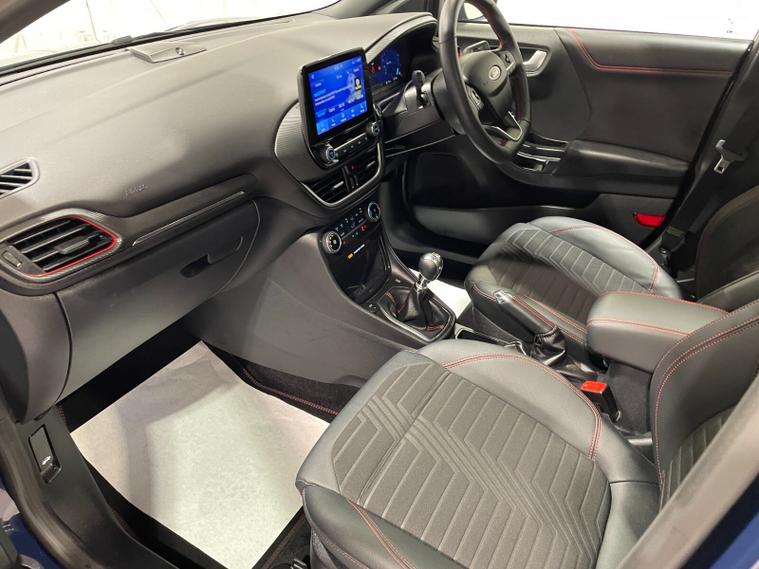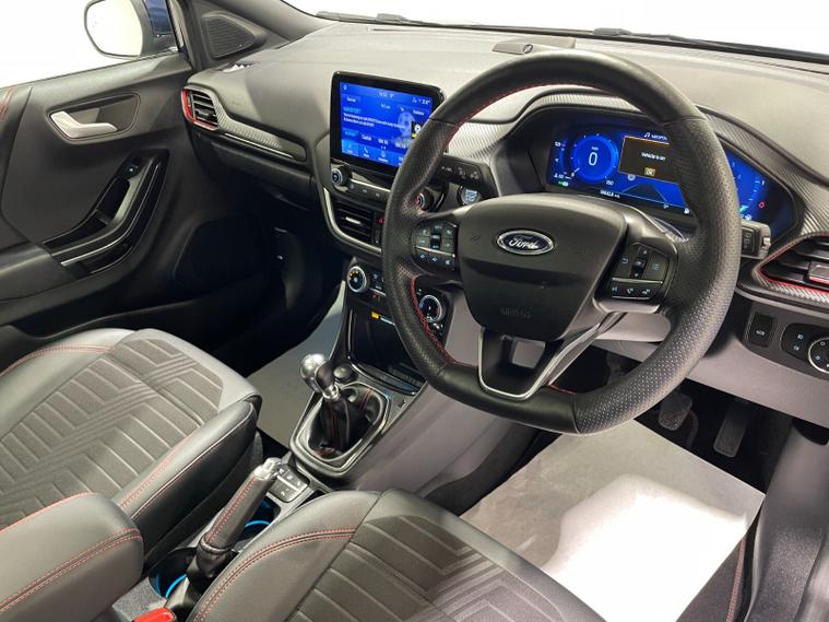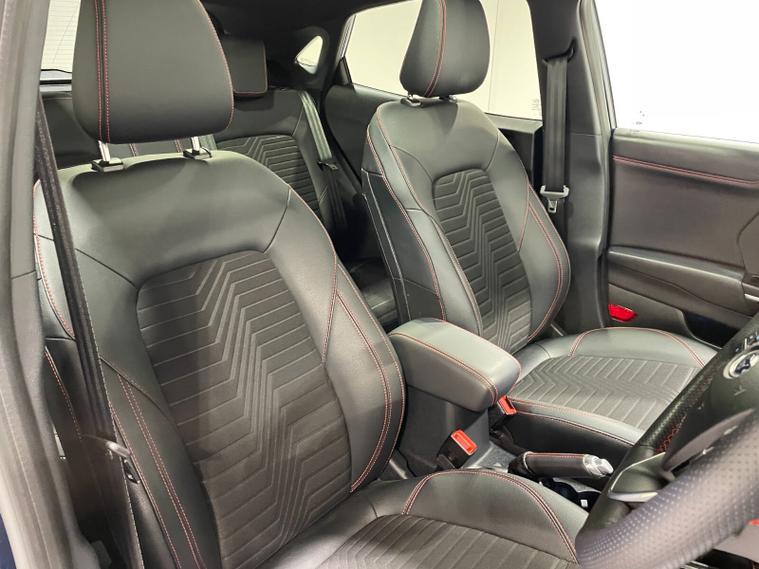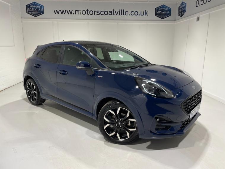 2023 73 Reg Ford Puma 1.0 EcoBoost mHEV (155PS) 6 spd ST Line X 5dr. Blazer Blue with Part Sensico interior, WINTER PACK with HEATED FRONT SEATS and HEATED STEERING WHEEL, ST -LINE BODY KIT with LARGE REAR SPOILER, SYNC 3 DAB SATELLITE NAVIGATION, OPENABLE PANORAMIC SUNROOF, DRIVERS ASSISTANCE PACK with BLIND SPOT INFORMATION with CROSS TRAFFIC ALERT, ADAPTIVE CRUISE CONTROL Pre COLLISION ASSIST, ACTIVE PARK ASSIST and REAR CAMERA, POWER OPENING TAILGATE, B&O sound system, selectable drive modes- Normal, Eco, Sport, Slippery & Trail, drivers & passenger seat lumbar & heights adjust, FORD MEGABOX EXTENDED BOOT SPACE, 18 inch Matt Black machined alloy wheels, EATC AIR CON, KEYLESS entry and start with FORD power start button, PRIVACY GLASS, power folding door mirrors, auto light and rain sensing wipers, tyre pressure monitoring system, Thatcham alarm, NCAP Pack (lane-keeping alert & lane-keeping aid, speed limiter, rear seat belt minder, rear centre head restraint & auto-headlamps), front fog lamps with cornering lights, heated front screen, remote central locking, electric front windows, ESP, Hill start assist, trip computer, ambient lighting, 10, 632 miles (FE 73 YBN).