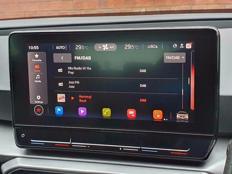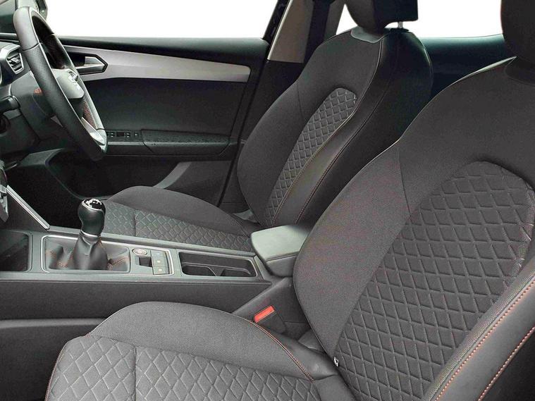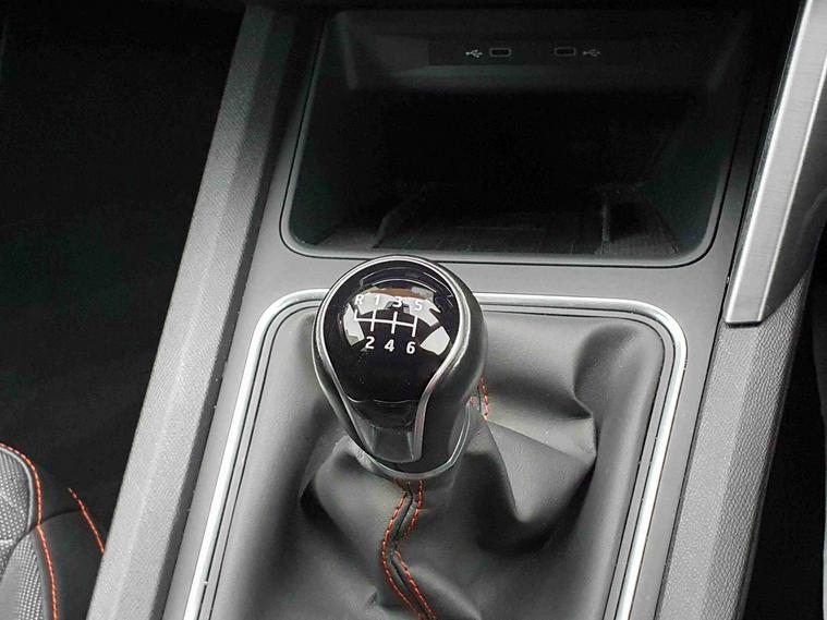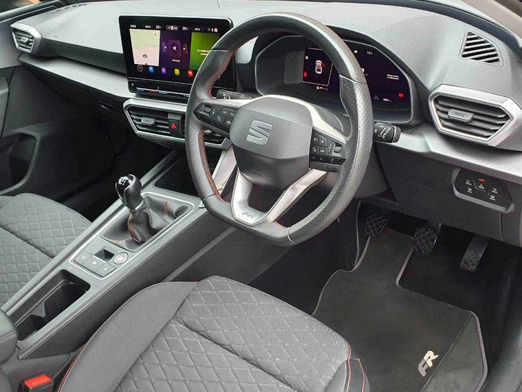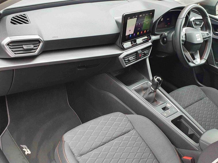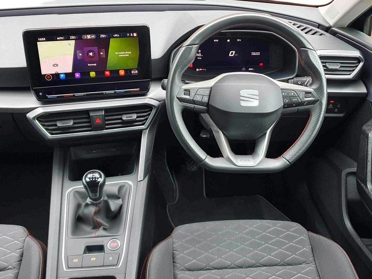 - Flat bottomed perforated leather steering wheel with red stitching and FR logo and leather gear stick