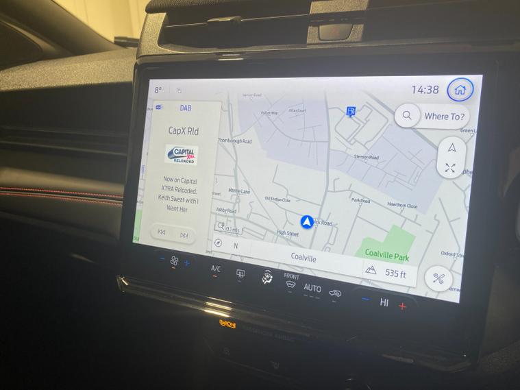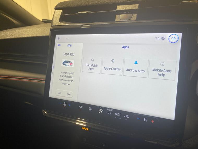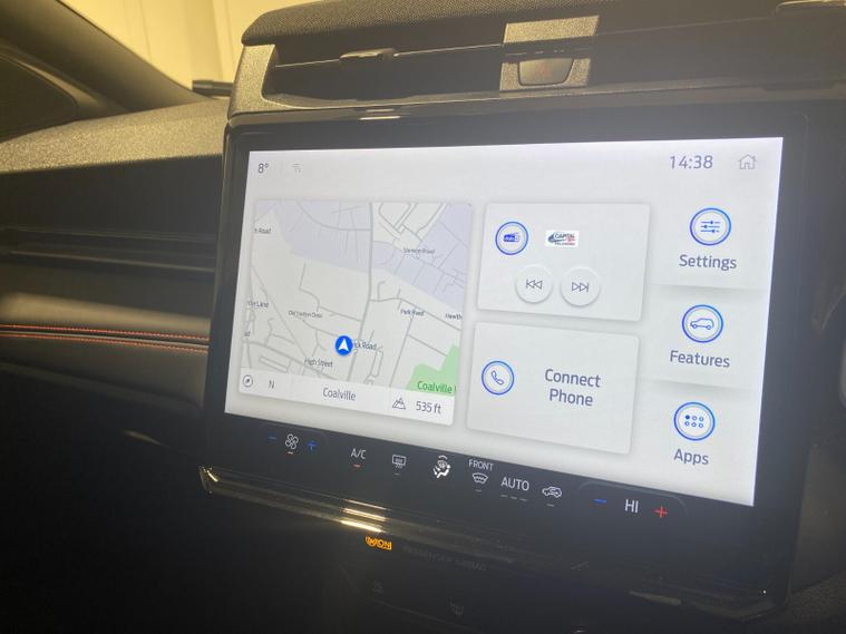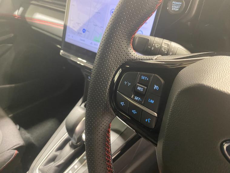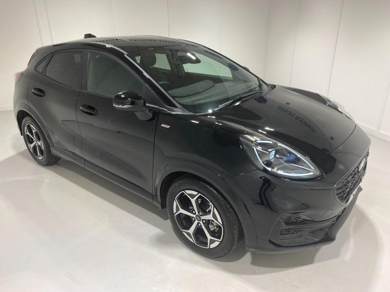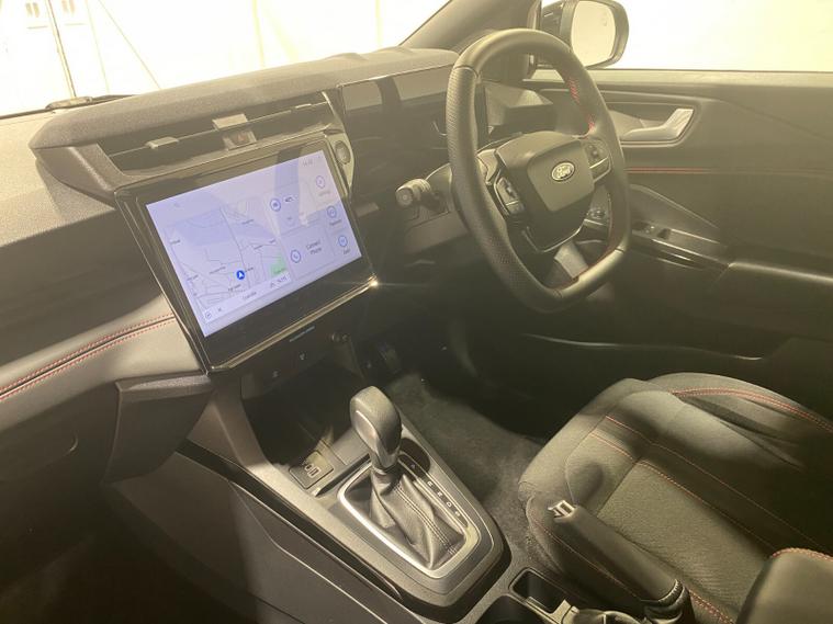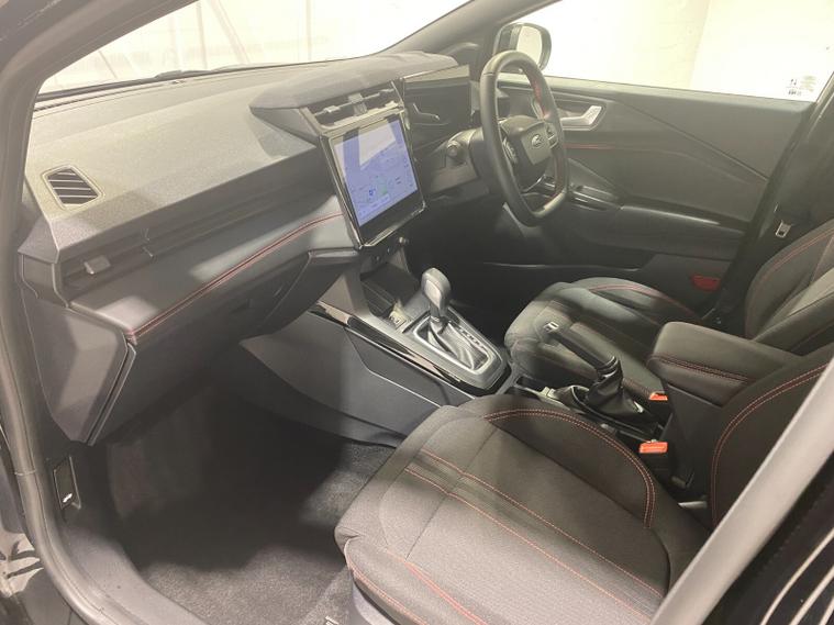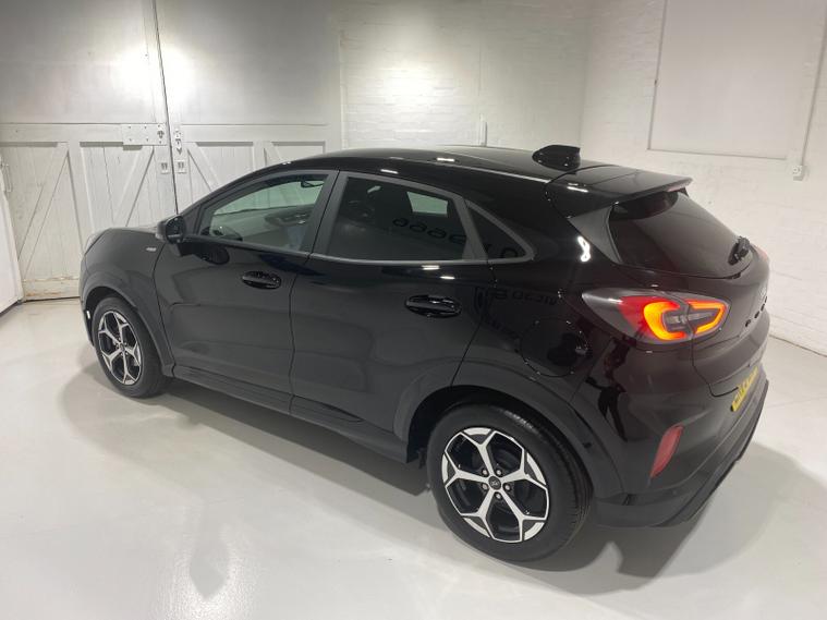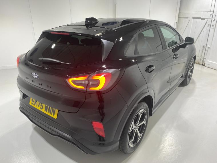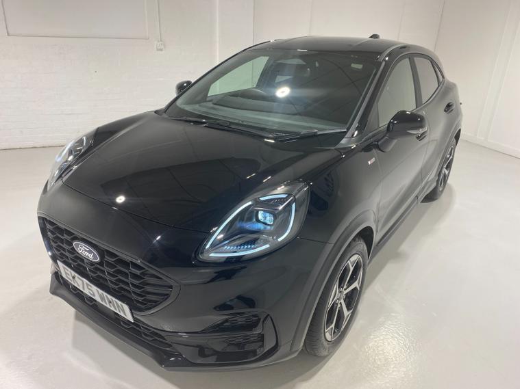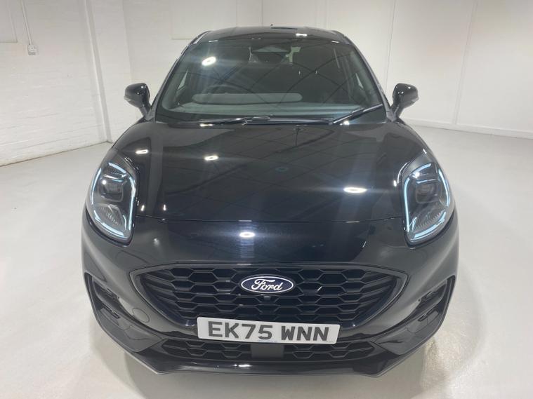 2025 25 Reg New Model Ford Puma 1.0 EcoBoost (125PS) mHEV Automatic ST-Line 5dr. Agate Black with Charcoal cloth interior, SYNC4 TOUCHSCREEN DAB SATELLITE NAVIGATION, REAR CAMERA, Bluetooth USB, Apple CarPlay, Android Auto, ST-LINE BODY KIT with LARGE REAR SPOILER, FORD MEGABOX EXTENDED BOOT SPACE, REAR parking sensors, 17 inch alloy wheels, AIR CON, FORD power start button, Drivers Assistance features to include traffic sign recognition, auto high beam & driver alert, centre console with arm rest, tyre pressure monitoring system, Thatcham alarm, NCAP Pack (lane-keeping alert & lane-keeping aid, speed limiter, rear seat belt minder, rear centre head restraint & auto-headlamps), front fog lamps with cornering lights, heated front screen, privacy glass, remote central locking, electric front windows, ESP, Hill start assist, trip computer, ambient lighting, 5, 856 miles (EK 75 WNN).