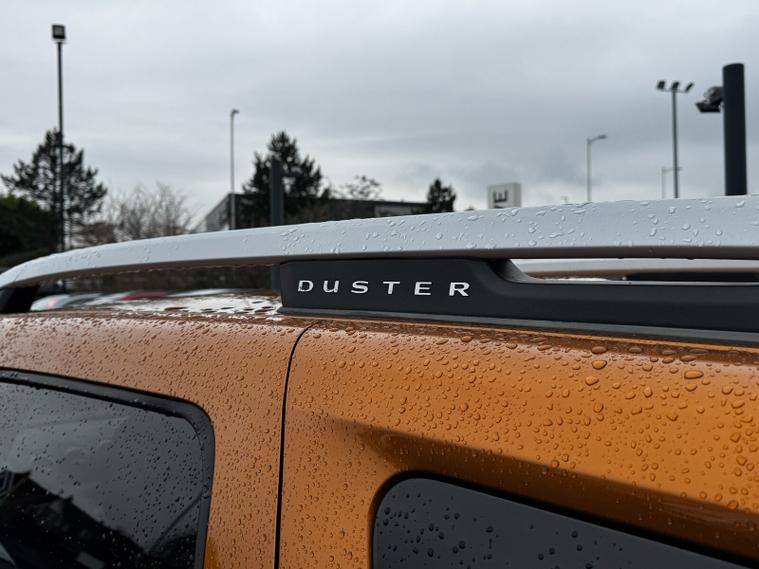 - Tailgate trim with satin chrome Duster inscription in black background