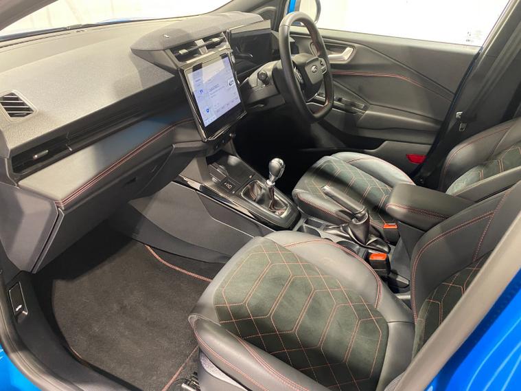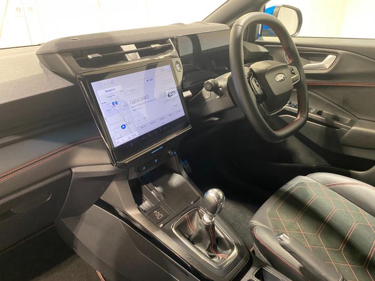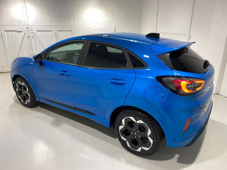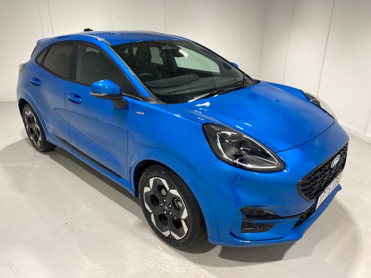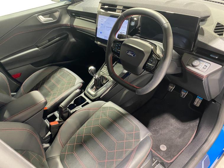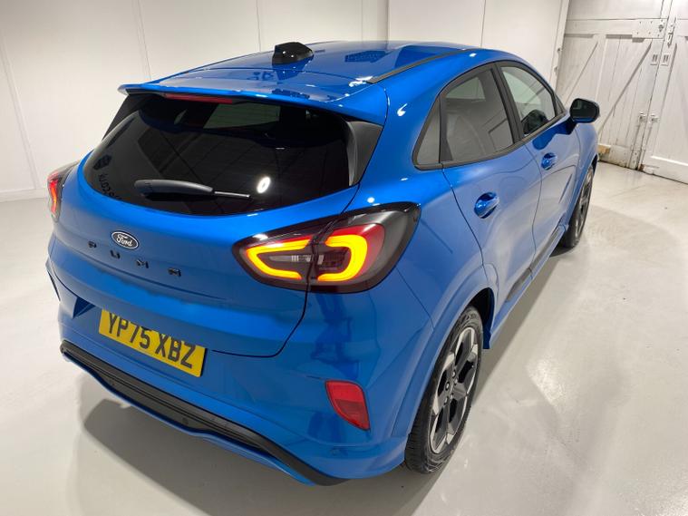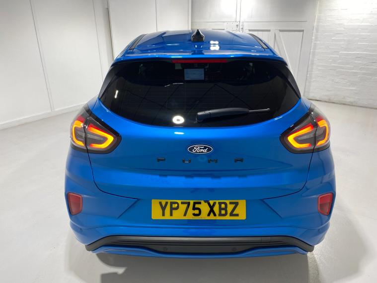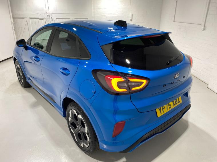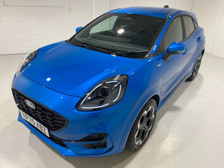 2025 75 Reg Ford Puma 1.0 EcoBoost (125PS) mHEV 6 spd ST Line X 5dr. Digital Aqua Blue metallic with Part Sensico interior, ST -LINE BODY KIT with LARGE REAR SPOILER, SYNC 3 DAB SATELLITE NAVIGATION, B&O 360 degree sound system, REAR PARKING SENSORS, selectable drive modes- Normal, Eco, Sport, Slippery & Trail, drivers & passenger seat lumbar & heights adjust, FORD MEGABOX EXTENDED BOOT SPACE, 18 inch Matt Black machined alloy wheels, EATC AIR CON, KEYLESS entry and start with FORD power start button, PRIVACY GLASS, power folding door mirrors, auto light and rain sensing wipers, centre console with arm rest, tyre pressure monitoring system, Thatcham alarm, NCAP Pack (lane-keeping alert & lane-keeping aid, speed limiter, rear seat belt minder, rear centre head restraint & auto-headlamps), front fog lamps with cornering lights, heated front screen, remote central locking, electric front windows, ESP, Hill start assist, trip computer, ambient lighting, 1, 359 miles (YP 75 XBZ).