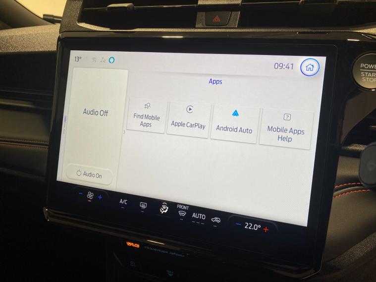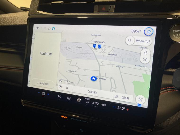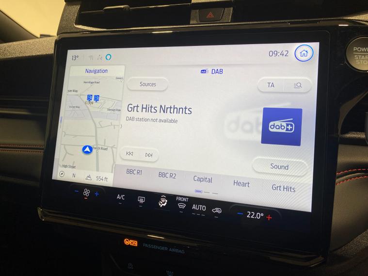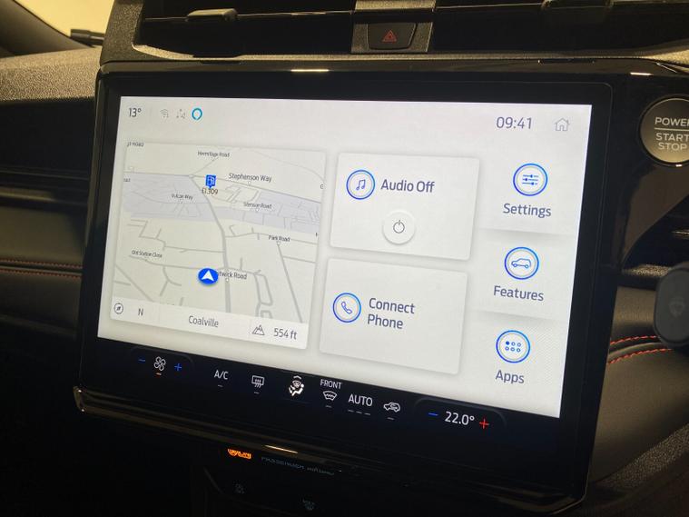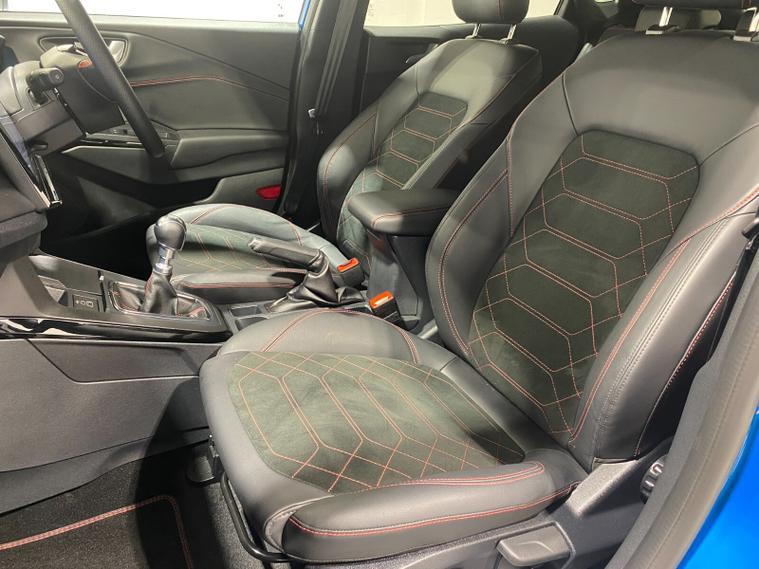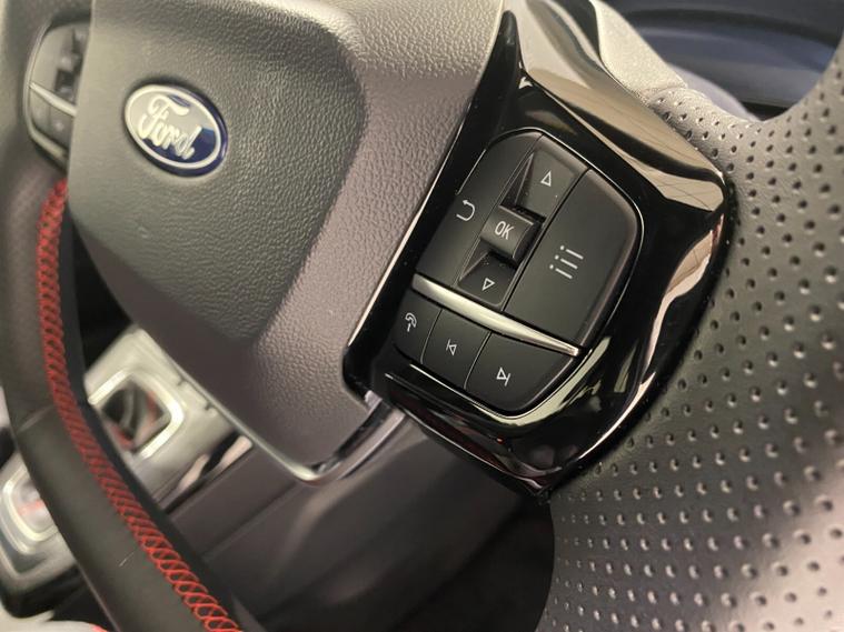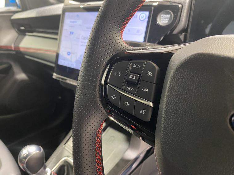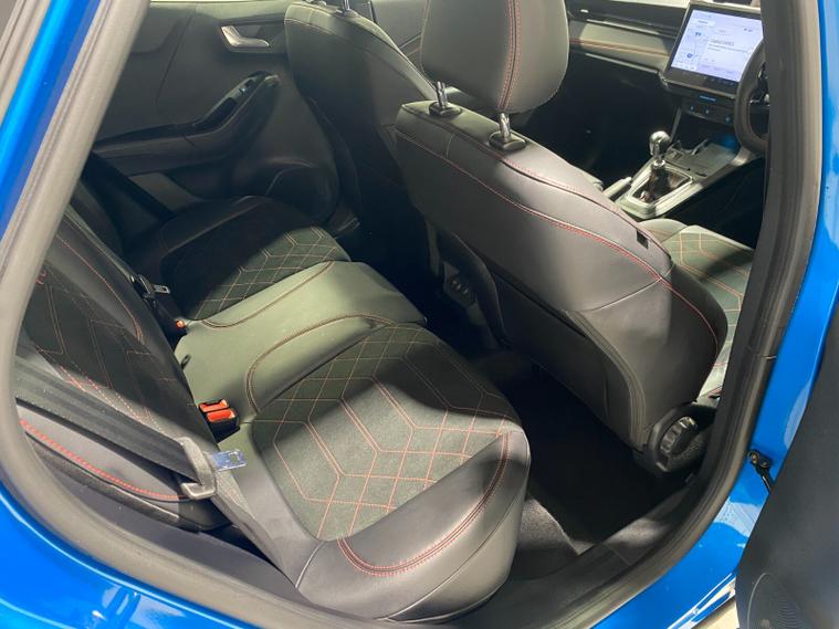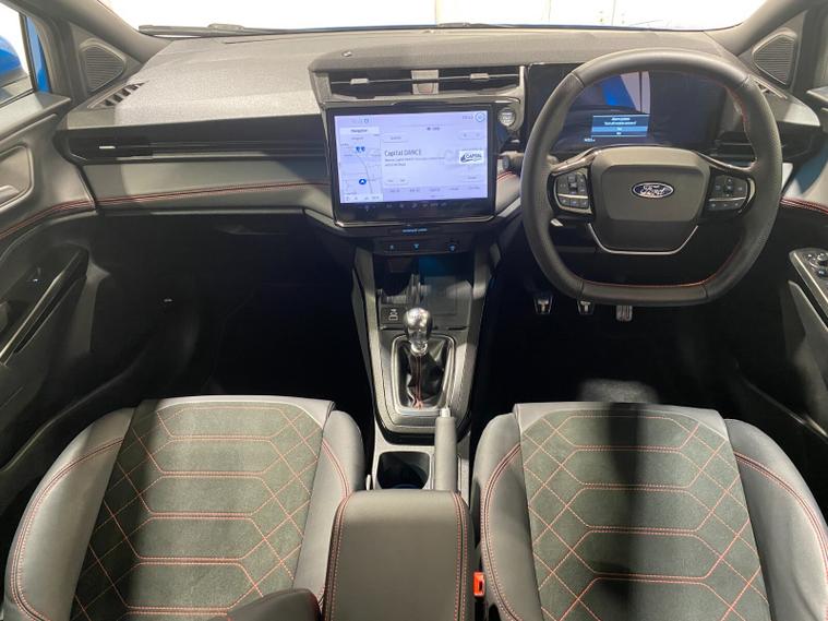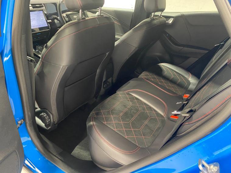 2025 75 Reg Ford Puma 1.0 EcoBoost (125PS) mHEV 6 spd ST Line X 5dr. Digital Aqua Blue metallic with Part Sensico interior, ST -LINE BODY KIT with LARGE REAR SPOILER, SYNC 3 DAB SATELLITE NAVIGATION, B&O 360 degree sound system, REAR PARKING SENSORS, selectable drive modes- Normal, Eco, Sport, Slippery & Trail, drivers & passenger seat lumbar & heights adjust, FORD MEGABOX EXTENDED BOOT SPACE, 18 inch Matt Black machined alloy wheels, EATC AIR CON, KEYLESS entry and start with FORD power start button, PRIVACY GLASS, power folding door mirrors, auto light and rain sensing wipers, centre console with arm rest, tyre pressure monitoring system, Thatcham alarm, NCAP Pack (lane-keeping alert & lane-keeping aid, speed limiter, rear seat belt minder, rear centre head restraint & auto-headlamps), front fog lamps with cornering lights, heated front screen, remote central locking, electric front windows, ESP, Hill start assist, trip computer, ambient lighting, 1, 359 miles (YP 75 XBZ).