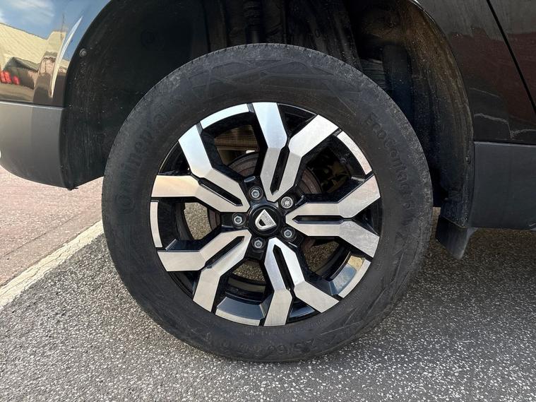 - Black/satin chrome tailgate trim with Duster inscription in black background and lettering