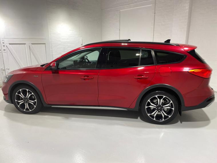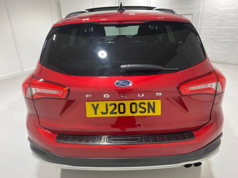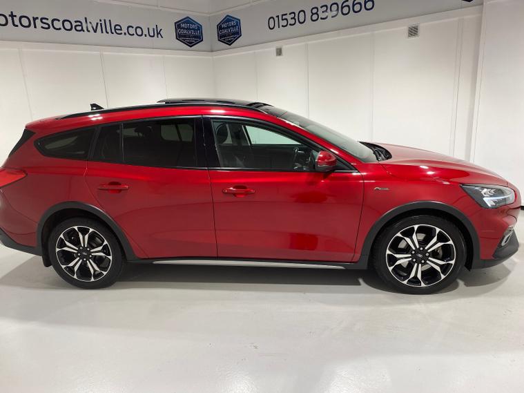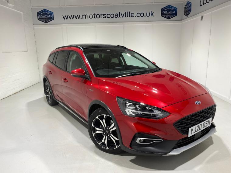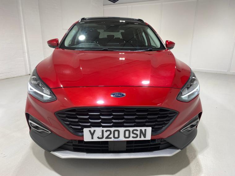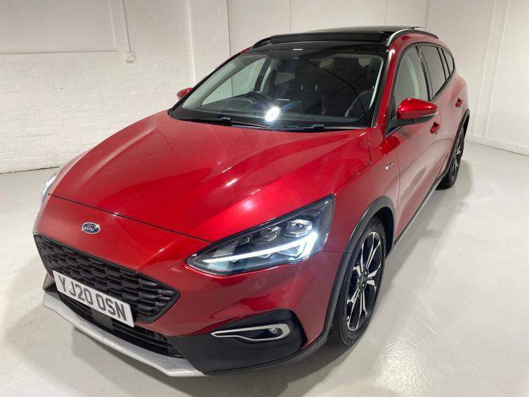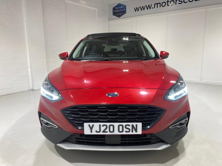 2020 20 Reg Ford Focus 1.5 Ecoblue (120PS) 8 spd Automatic Active X 5dr ESTATE. Fantastic Red with Ebony part LEATHER interior with Blue stitching & HEATED FRONT SEATS, drivers 6-way electric seat adjust, SYNC 3 SATELLITE NAVIGATION, Apple Car Play, Android Auto, PANORAMA ROOF, 18 inch Absolute Black painted/machined alloys, PRIVACY GLASS, LED HEADLAMPS, FRONT & REAR PARK ASSIST, POWER FOLDING DOOR MIRRORS with puddle lights, LED front fog lamps with cornering function, DEATC AIR CON, Lane Keeping aid with lane keeping alert, post collision braking & pre-collision assist, intelligent speed assist (limiter), electric park brake with auto hold, Auto lights, wipers & auto dimming rear view mirror, Power start button, Hill start, trip computer, ESP, Quick clear front screen, Thatcham Cat 1 alarm, 26, 548 miles (YJ 20 OSN).