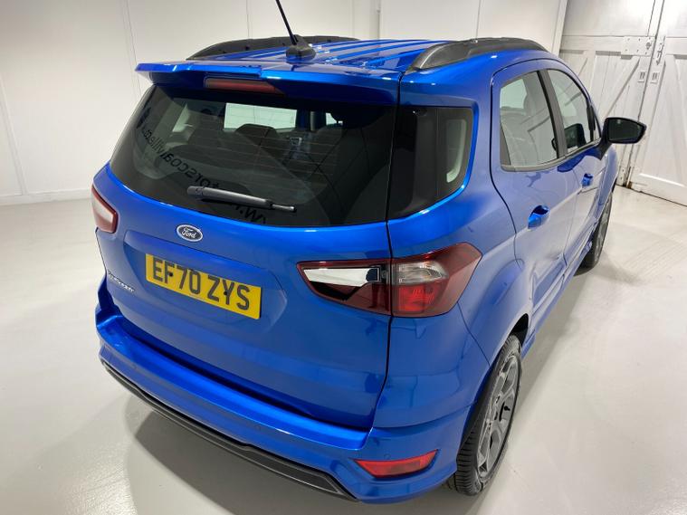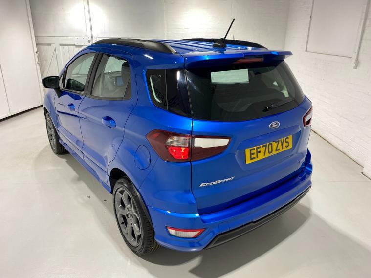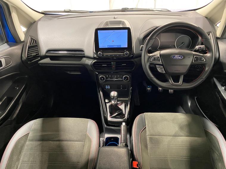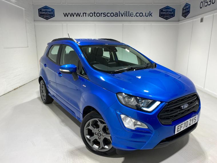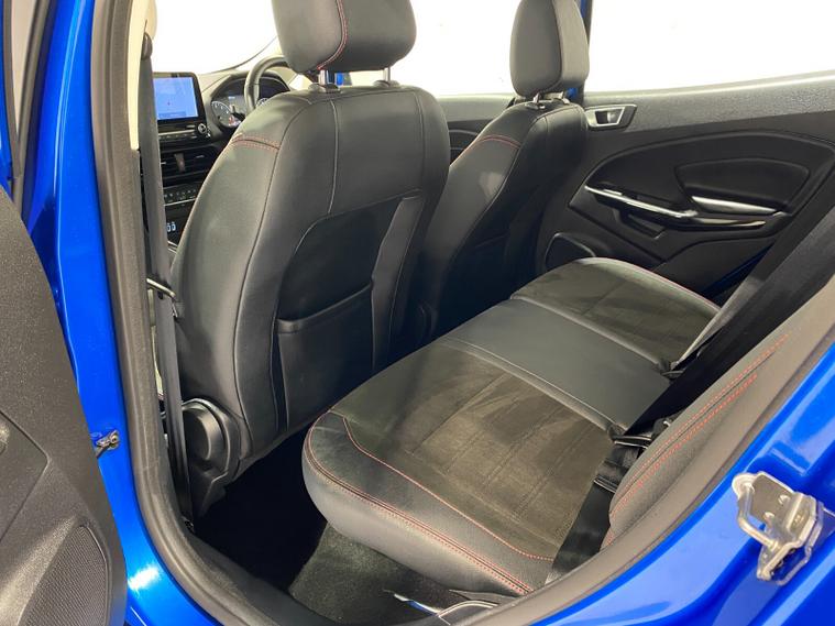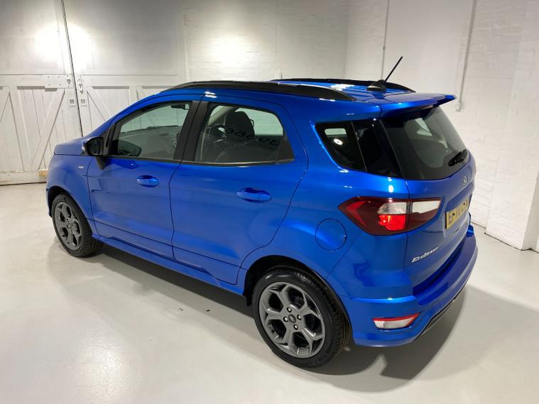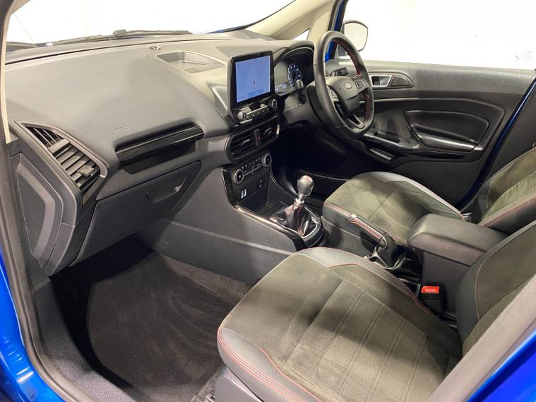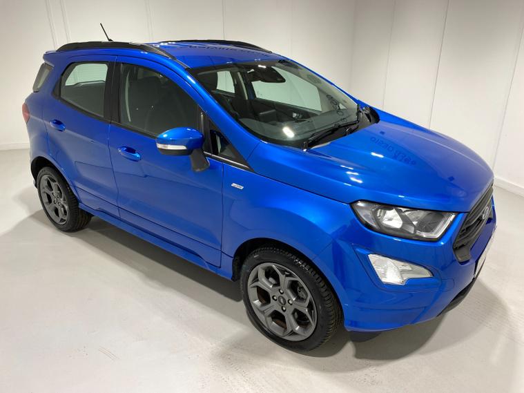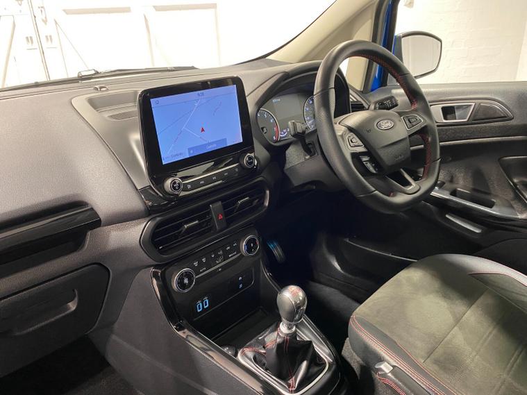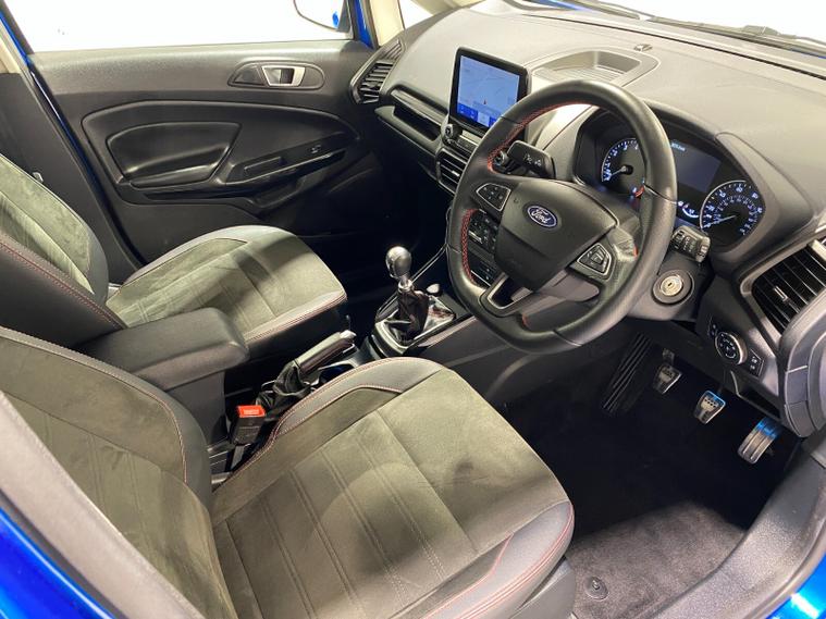2021 70 Reg EcoSport 1.0 Turbo Ecoboost (125PS) 6 spd ST-LINE 5dr. Blue Lightning metallic, Ebony part LEATHER interior, WINTER PACK with HEATED FRONT SEATS and HEATED STEERING WHEEL, SYNC 3 DAB SATELLITE NAVIGATION with 8 inch touch screen with REAR VIEW CAMERA, REAR PARKING SENSORS, Bluetooth USB, Apple CarPlay, Android Auto, 17 inch alloys, tyre pressure monitoring system, Thatcham alarm, front fog lamps with cornering lights, heated front screen, remote central locking, electric front windows, ESP, Hill start assist, trip computer, ambient lighting, 3, 671 miles (EF 70 ZYS).