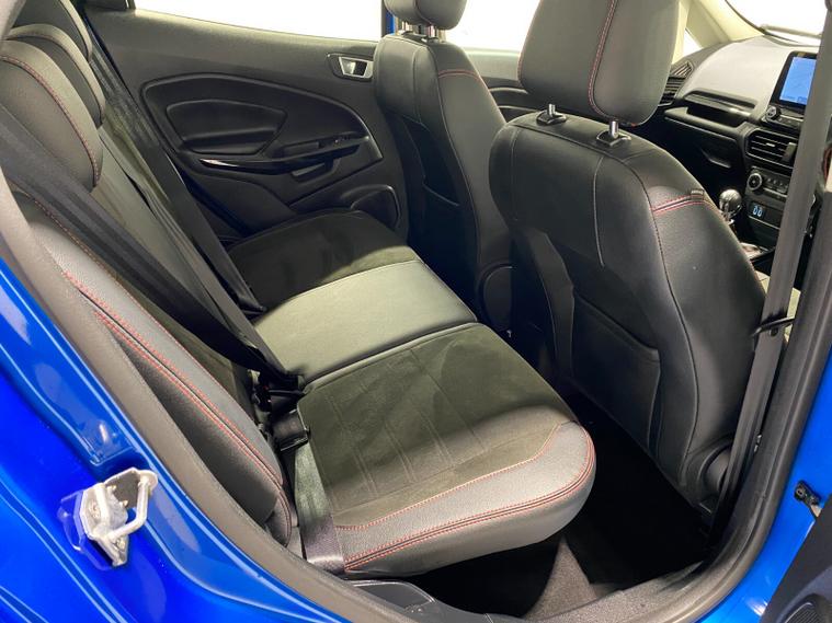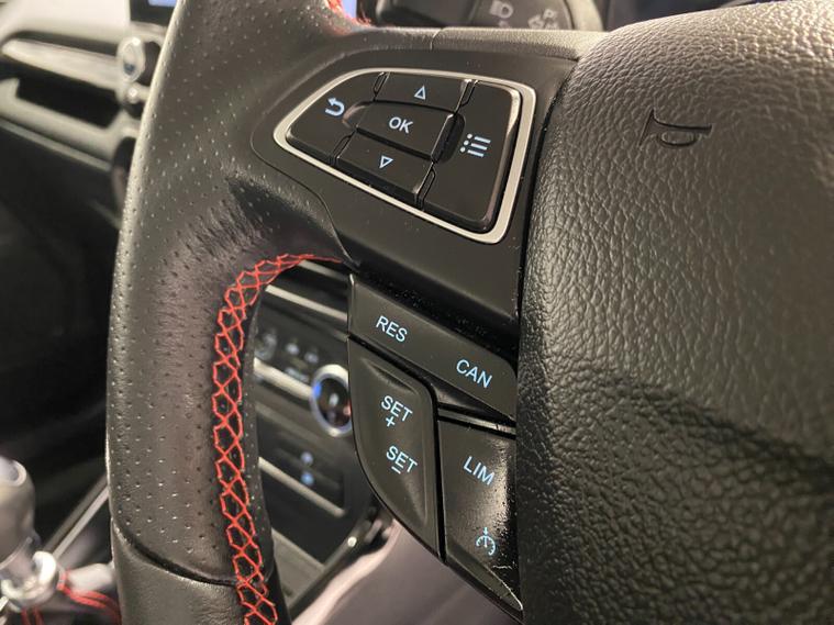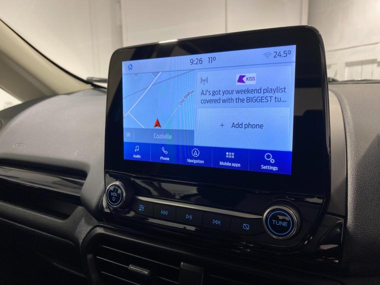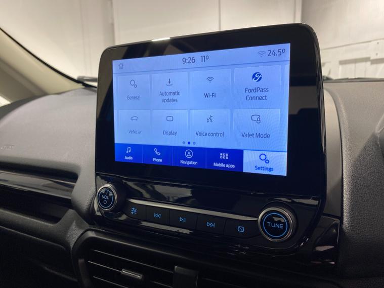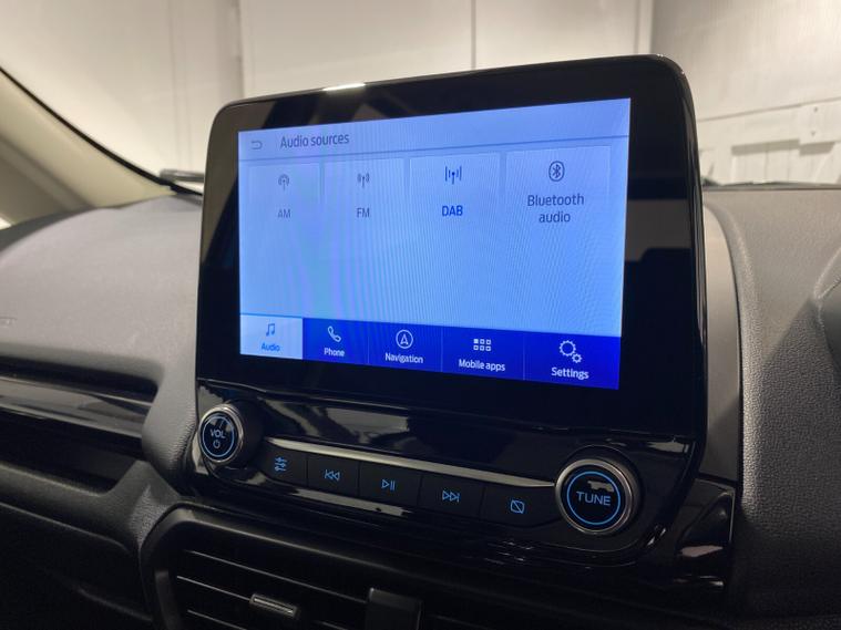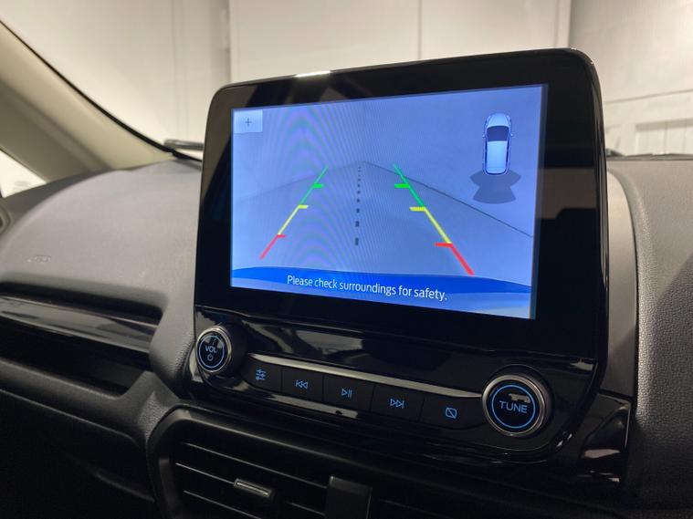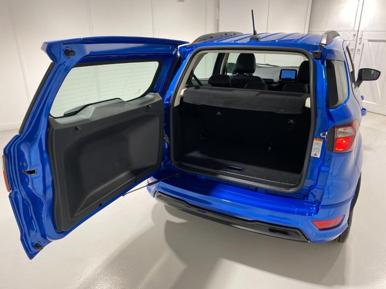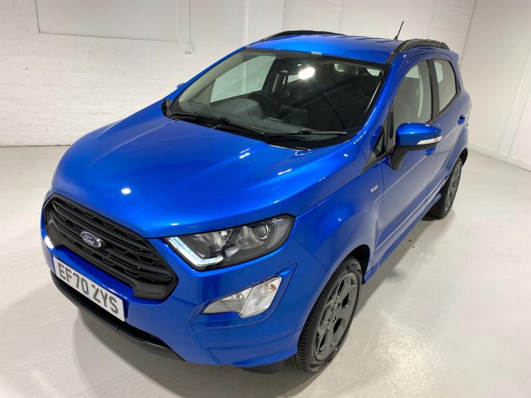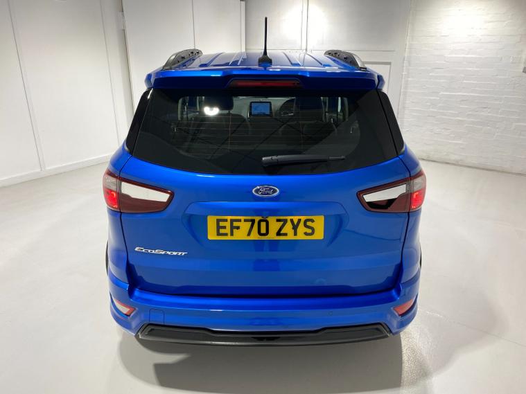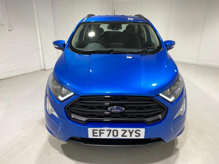 2021 70 Reg EcoSport 1.0 Turbo Ecoboost (125PS) 6 spd ST-LINE 5dr. Blue Lightning metallic, Ebony part LEATHER interior, WINTER PACK with HEATED FRONT SEATS and HEATED STEERING WHEEL, SYNC 3 DAB SATELLITE NAVIGATION with 8 inch touch screen with REAR VIEW CAMERA, REAR PARKING SENSORS, Bluetooth USB, Apple CarPlay, Android Auto, 17 inch alloys, tyre pressure monitoring system, Thatcham alarm, front fog lamps with cornering lights, heated front screen, remote central locking, electric front windows, ESP, Hill start assist, trip computer, ambient lighting, 3, 671 miles (EF 70 ZYS).
