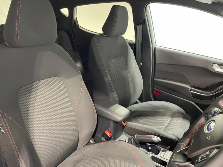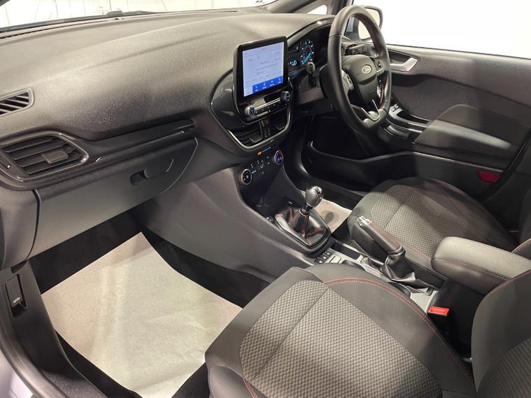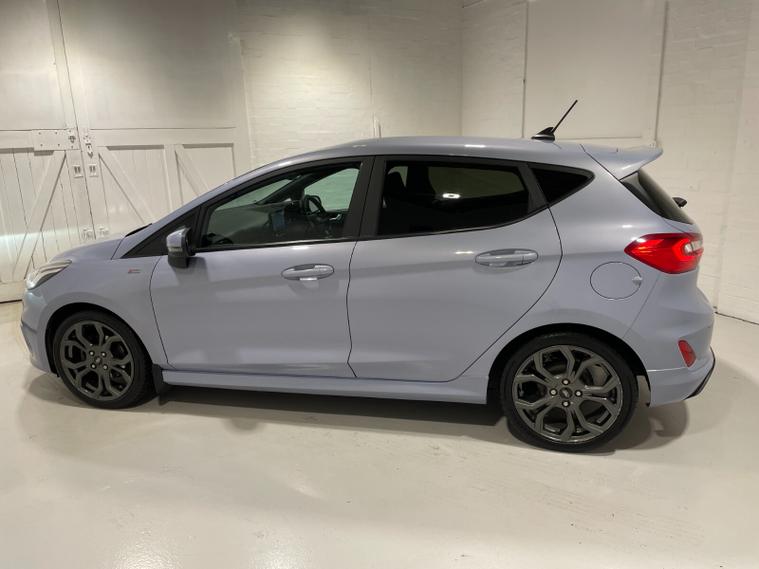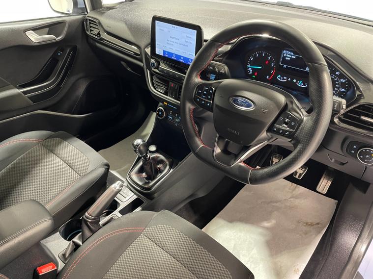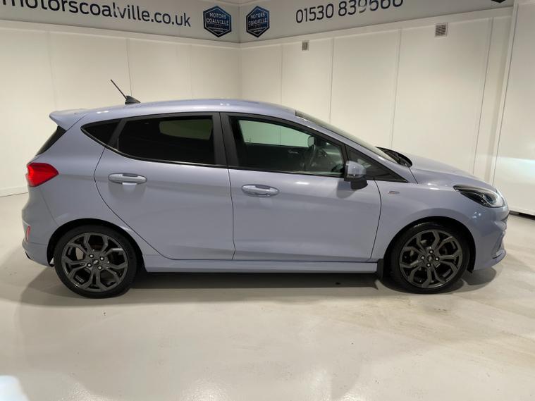 2021 21 Reg Fiesta 1.0 Turbo Ecoboost (125PS) mHEV 6 spd ST-LINE Edition 5dr. Freedom Blue, cloth interior, SYNC 3 DAB TOUCHSCREEN SATELLITE NAVIGATION, REAR PARK ASSIST, PRIVACY GLASS, 17 inch ROCK METALLIC alloys, tyre pressure monitoring system, Thatcham alarm, NCAP Pack (lane-keeping alert & lane-keeping aid, speed limiter, rear seat belt minder, rear centre head restraint & auto-headlamps), front fog lamps with cornering lights, heated front screen, remote central locking, electric front windows, ESP, Hill start assist, trip computer, ambient lighting, 48, 170 miles (FJ 21 SMO).