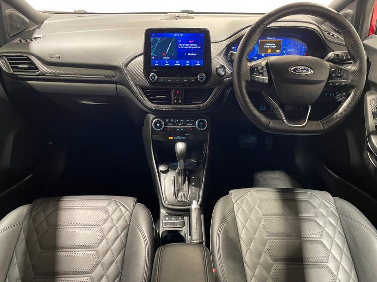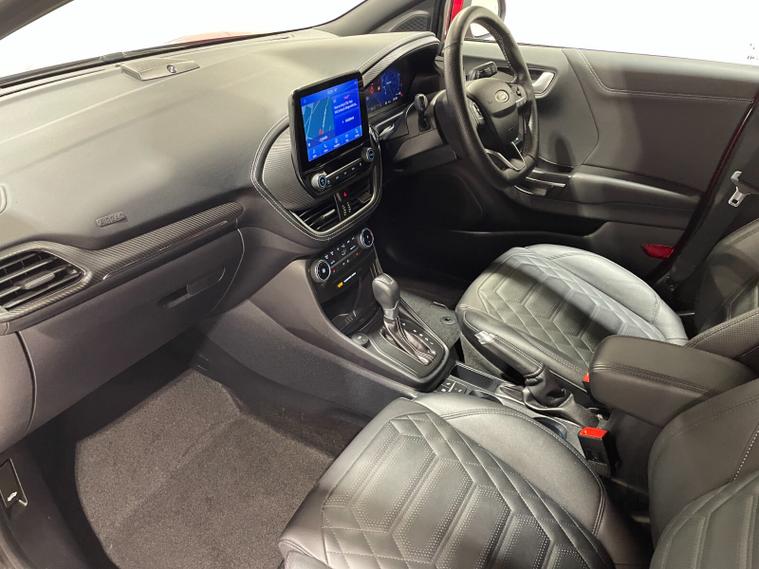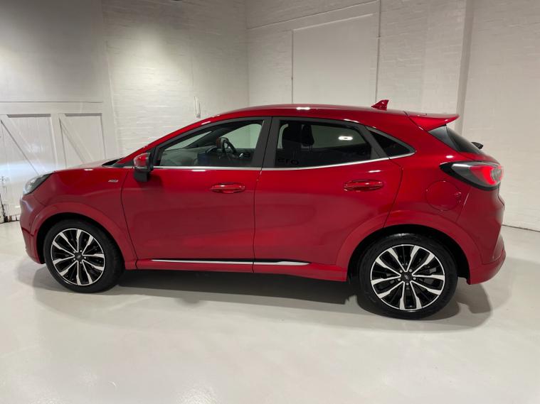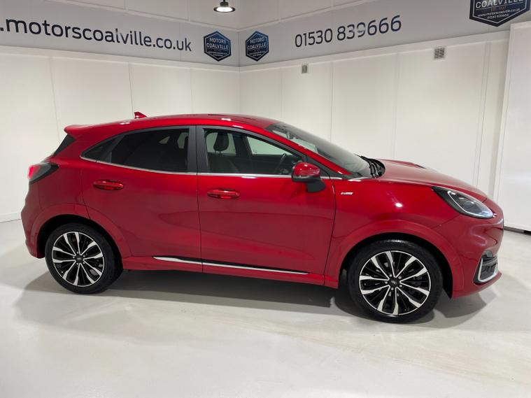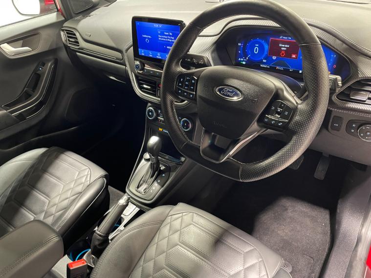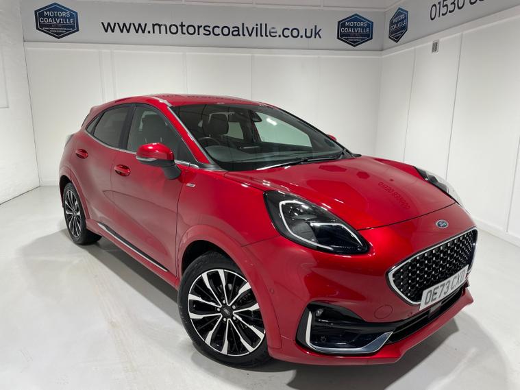 2023 73 Reg Ford Puma 1.0 EcoBoost (155PS) Automatic ST-LINE VIGNALE 5dr. Fantastic Red metallic with QUILTED, FULL LEATHER interior, DRIVERS ASSISTANCE PACK with BLIND SPOT INFORMATION with CROSS TRAFFIC ALERT, ADAPTIVE CRUISE CONTROL Pre COLLISION ASSIST, ACTIVE PARK ASSIST and REAR CAMERA, ST-LINE BODY KIT with LARGE REAR SPOILER, SYNC 3 DAB SATELLITE NAVIGATION, LED HEADLIGHTS, HEATED FRONT SEATS and STEERING WHEEL, KEYLESS ENTRY, lumbar massage front seats, privacy glass, B&O premium 675W sound system with subwoofer, FRONT and REAR parking sensors, 18 inch alloy wheels, CLIMATE CONTROL AIR CON, selectable drive modes- Normal, Eco, Sport, Slippery & Trail, drivers & passenger seat lumbar & heights adjust, FORD MEGABOX EXTENDED BOOT SPACE, FORD power start button, Drivers Assistance features to include traffic sign recognition, auto high beam & driver alert, centre console with arm rest, tyre pressure monitoring system, Thatcham alarm, NCAP Pack (lane-keeping alert & lane-keeping aid, speed limiter, rear seat belt minder, rear centre head restraint & auto-headlamps), front fog lamps with cornering lights, heated front screen, remote central locking, electric front windows, ESP, Hill start assist, trip computer, ambient lighting, 14, 233 miles (OE 73 CXD).
