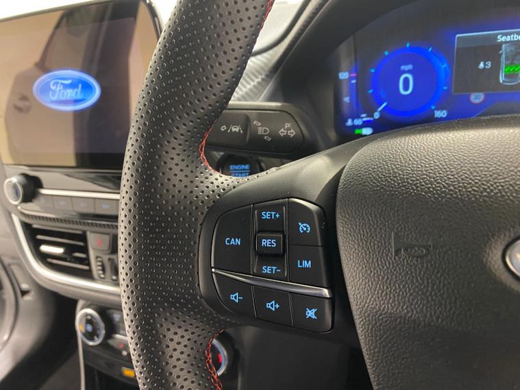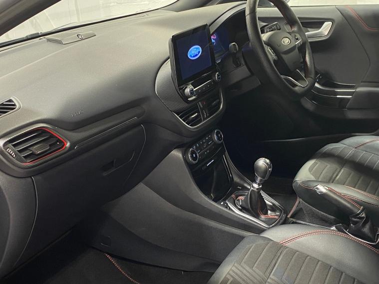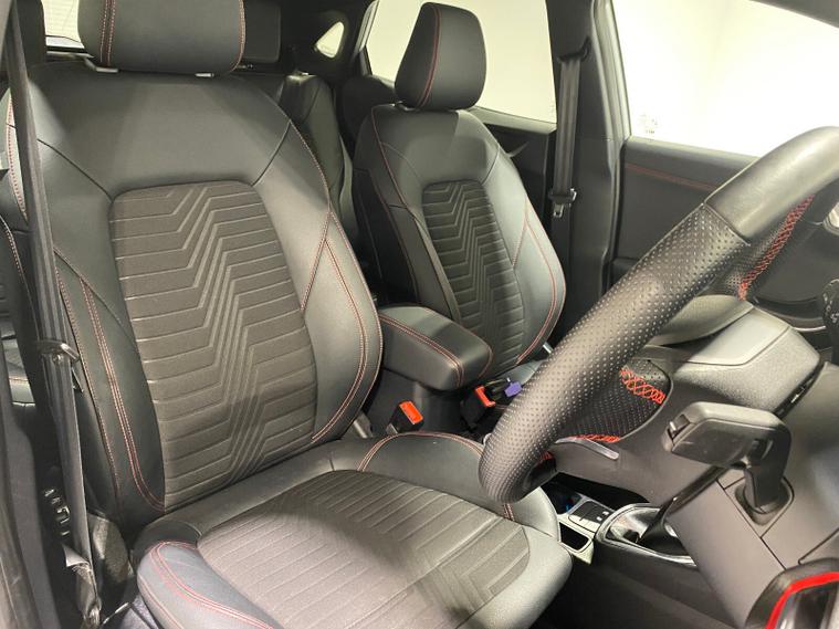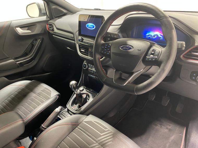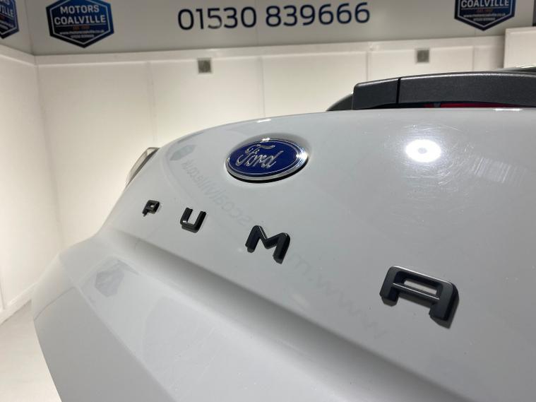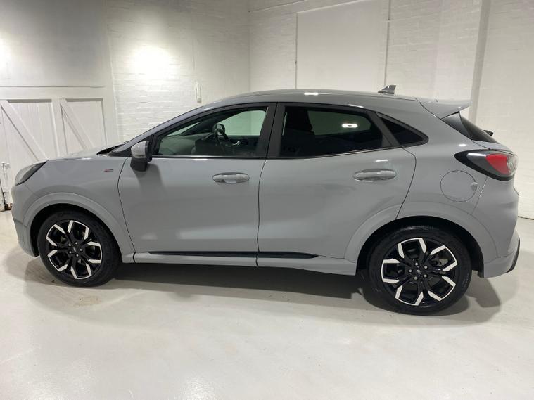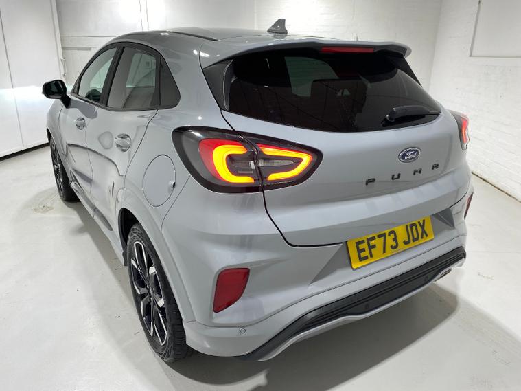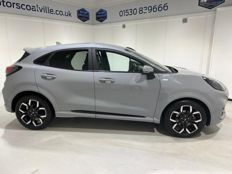 2023 73 Reg Ford Puma 1.0 EcoBoost MHEV (155PS) 6 spd ST Line X 5dr. Grey Matter with Part LEATHER/Cloth interior, ST -LINE BODY KIT with LARGE REAR SPOILER, SYNC 3 DAB SATELLITE NAVIGATION, B&O sound system, COMFORT PACK with HEATED FRONT SEATS and STEERING WHEEL, REAR PARKING SENSORS, selectable drive modes- Normal, Eco, Sport, Slippery & Trail, drivers & passenger seat lumbar & heights adjust, FORD MEGABOX EXTENDED BOOT SPACE, 18 inch Matt Black machined alloy wheels, EATC AIR CON, KEYLESS entry and start with FORD power start button, PRIVACY GLASS, power folding door mirrors, Drivers Assistance features to include traffic sign recognition, auto high beam & driver alert, auto light and rain sensing wipers, centre console with arm rest, tyre pressure monitoring system, Thatcham alarm, NCAP Pack (lane-keeping alert & lane-keeping aid, speed limiter, rear seat belt minder, rear centre head restraint & auto-headlamps), front fog lamps with cornering lights, heated front screen, remote central locking, electric front windows, ESP, Hill start assist, trip computer, ambient lighting, 18, 714 miles (EF 73 JDX).