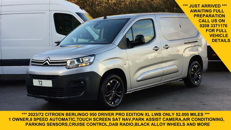 *** JUST ARRIVED AWAITING FULL PREPARATION *** 2023/72 REG CITROEN BERLINGO 950 DRIVER PRO EDITION XL LWB IN GREY, 8 SPEED AUTOMATIC, 1 OWNER FROM NEW DIRECT FROM A MAJOR LEASING COMPANY WITH ONLY 52.000 MILES, EURO 6 ULEZ COMPLIANT, 3 SEAT CAB, TOUCH SCREEN SAT NAV, REAR PARK ASSIST CAMERA, BLACK ALLOY WHEELS, AIR CONDITIONING, PARKING SENSORS, DAB RADIO, APPLE/ANDRIOD CAR PLAY, ELECTRIC WINDOWS, ELECTRIC FOLDING MIRRORS, SIDE LOADING DOOR, LINED, AIRBAG, REMOTE CENTRAL LOCKING, BLUETOOTH CONNECTION, A FREE 3 MONTHS WARRANTY WITH THE OPTION TO EXTEND, GREAT FIXED RATE FLEXIBLE FINANCE AVAILABLE, DEBIT/CREDIT CARDS ACCEPTED.