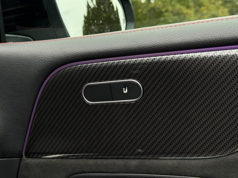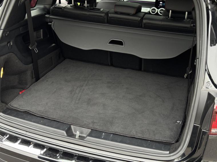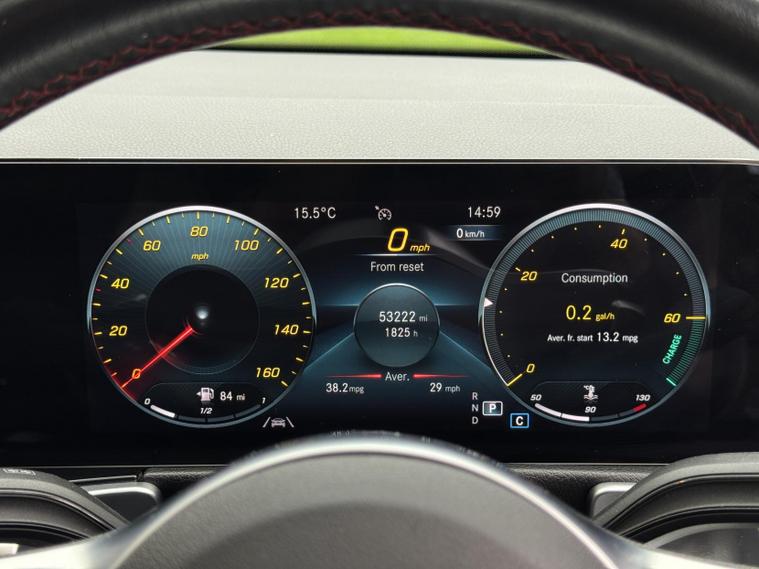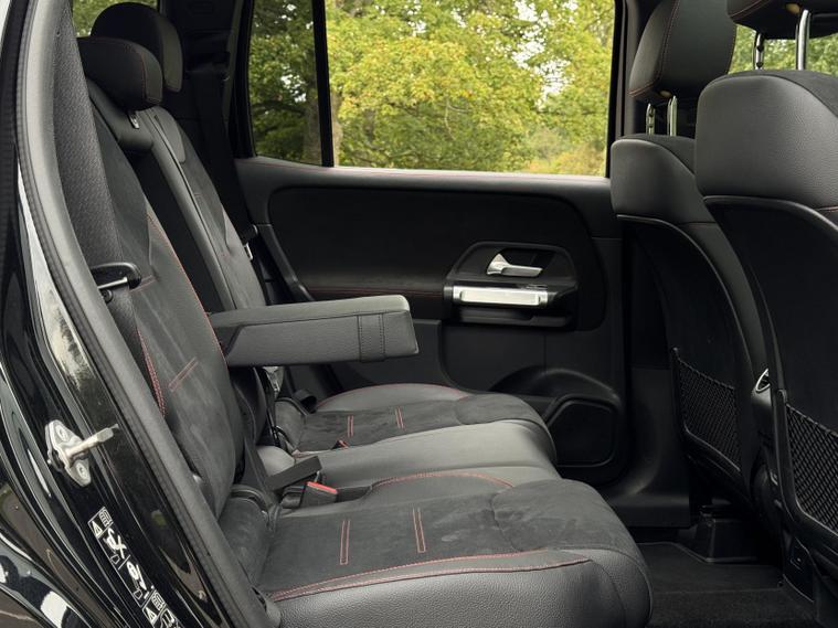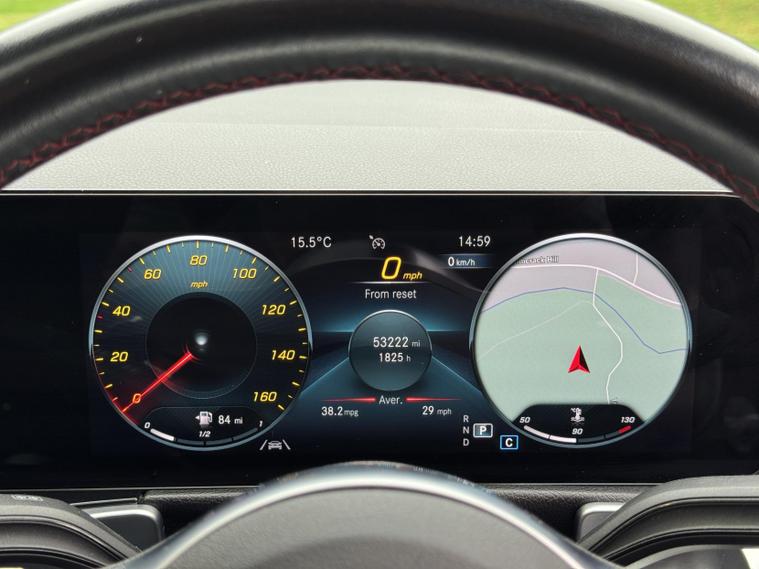 Externally it stands out in Cosmos Black metallic paint paired with AMG 19-inch 5-twin-spoke alloys in Tantalite Grey, AMG bodystyling with chrome highlights, privacy glass and polished aluminium roof rails. The interior combines Artico leather and Dinamica microfibre in black with red contrast stitching, giving a refined yet sporty finish complemented by carbon-structure trim inlays and AMG-branded floor mats. The MBUX dual 10.25-inch widescreen cockpit integrates navigation, DAB radio, voice control, smartphone connectivity via Apple CarPlay and Android Auto, and Mercedes Connect Me for remote vehicle management.
