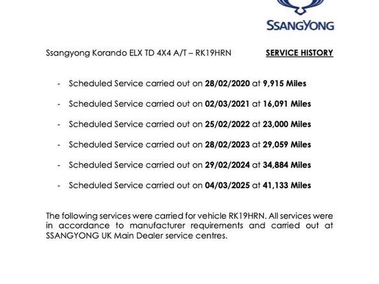 Introducing the SsangYong Korando 2.2D ELX SUV, a stylish and robust ride that’s ready to take on any adventure you throw its way. With a sleek Techno Grey exterior, this 2019 model has only clocked 46, 000 miles and is a GENUINE 1 OWNER , making it a fantastic option for those who want a nearly new vehicle without the hefty price tag. It comfortably seats five, making it perfect for family outings or weekend getaways with friends. Plus, with five doors, getting in and out is a breeze, whether you're loading up the kids or your gear for a camping trip.