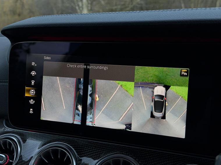 Technology includes the MBUX infotainment system with twin 12.3-inch digital displays, augmented reality navigation, live traffic information, Apple CarPlay and Android Auto, wireless phone charging, USB ports front and rear, and Burmester surround sound. The Parking Package adds a 360-degree camera with Active Park Assist, alongside Blind Spot Assist, Traffic Sign Assist, ATTENTION Assist, and cruise control with speed limiter.