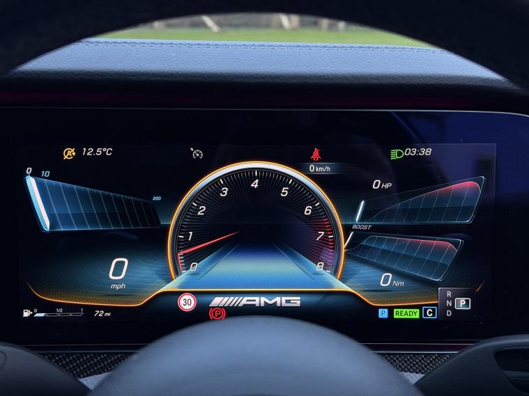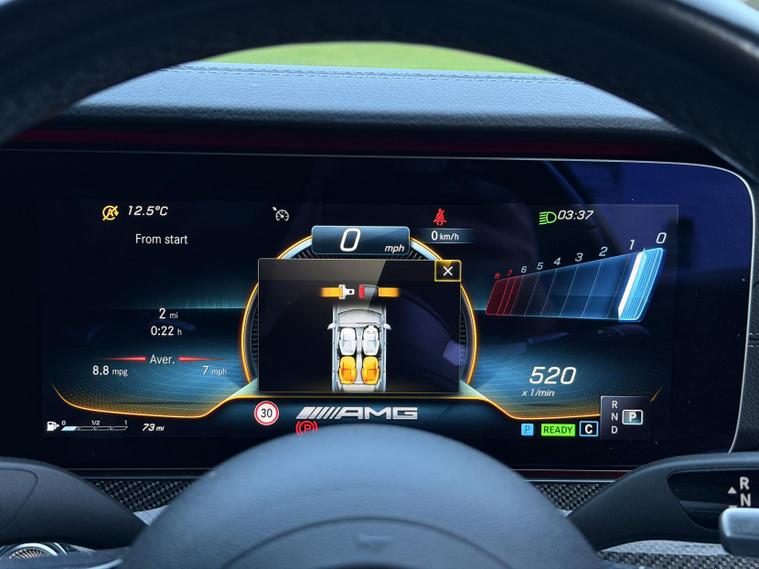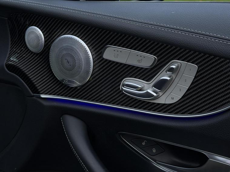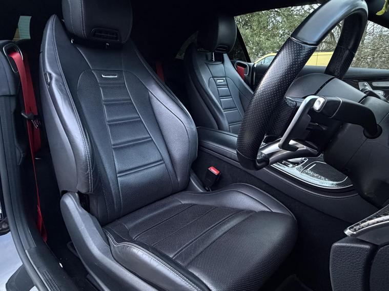 The interior is finished with AMG carbon fibre trim throughout, ARTICO leather upper dashboard with contrast stitching, illuminated AMG door sills, red AMG seat belts, and 64-colour ambient lighting. Electrically adjustable AMG sports seats feature memory and heating functions, supported by the Energizing Comfort Package and three-zone THERMOTRONIC climate control.