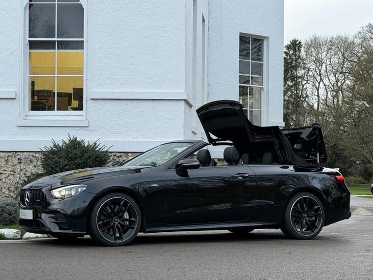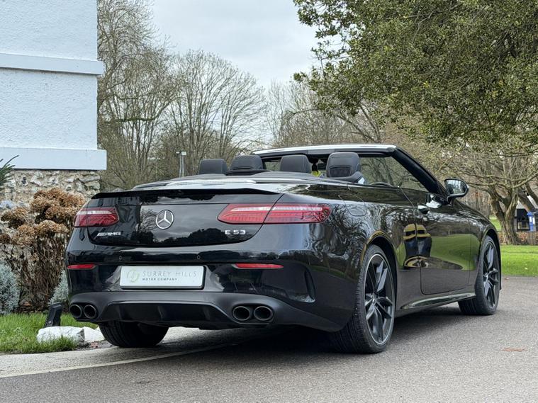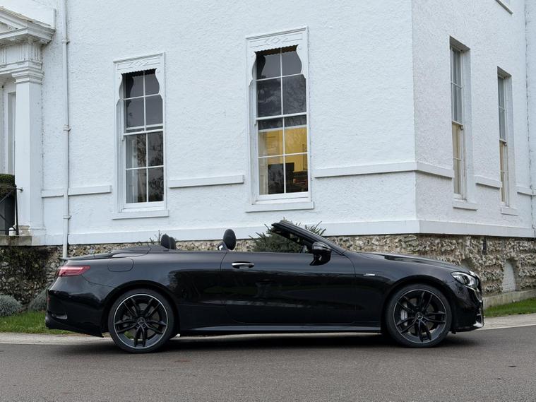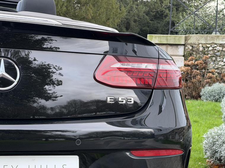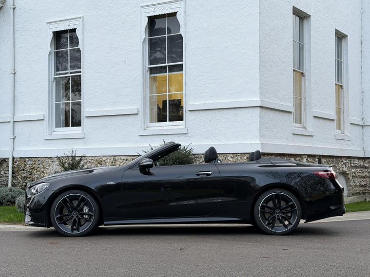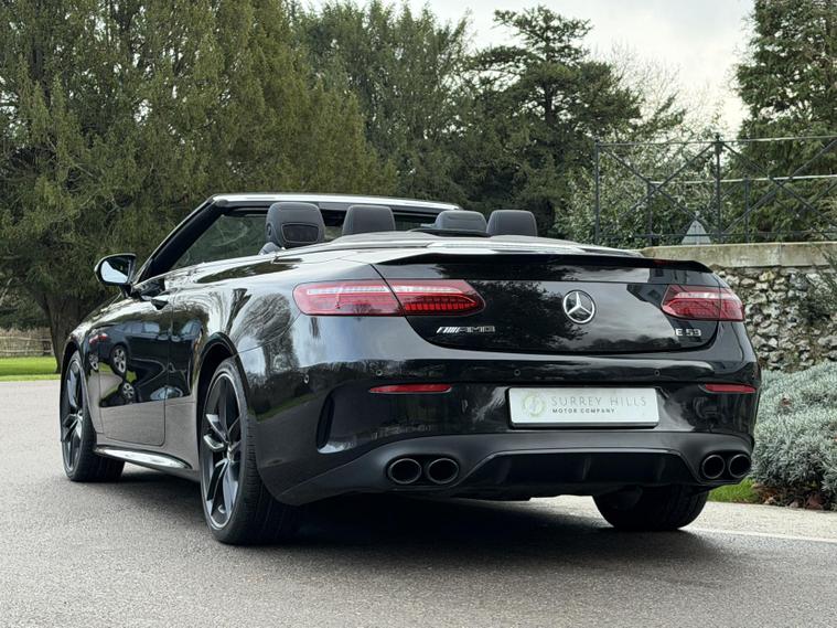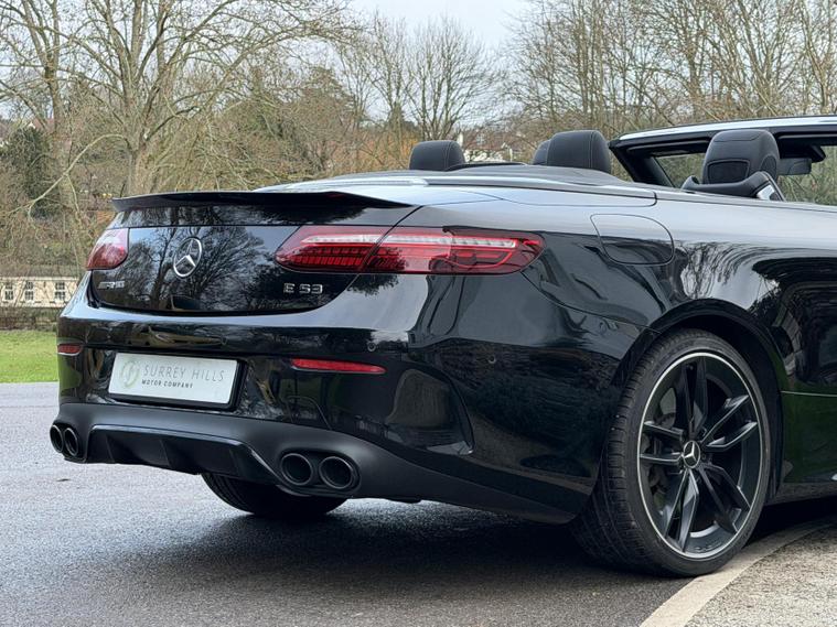 Mercedes-Benz E53 AMG Night Edition Premium Plus Cabriolet finished in Obsidian Black with AMG Nappa leather in black with grey topstitching. Acquired directly from the previous owner, a local Surrey resident who has moved into a larger vehicle. Fully HPI clear and supplied with two keys, original owners pack, Mercedes-Benz digital service history, and the official factory specification sheet from Mercedes-Benz.