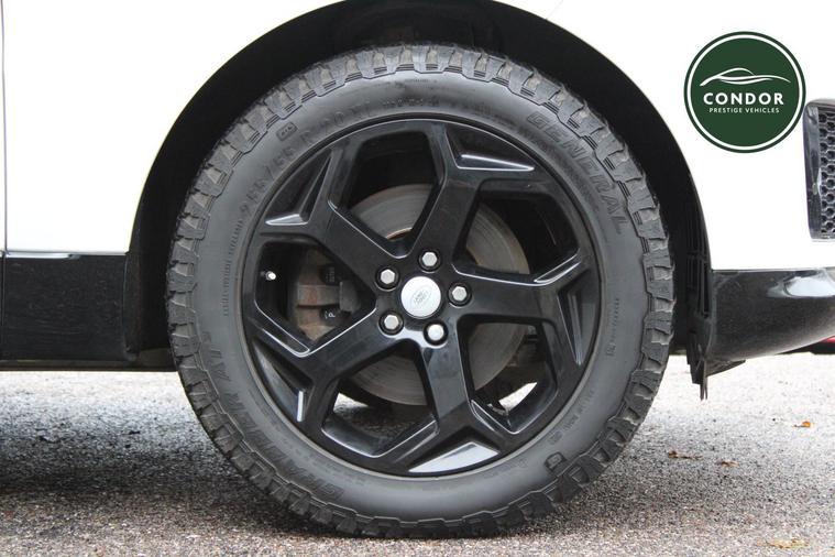 The addition of the Black Exterior Pack elevates the vehicle's aesthetic appeal, providing a bold contrast against the Fuji White body. This stylish enhancement not only adds a modern touch but also reinforces the sporty character of the Range Rover Sport, making it a head-turner on any road.